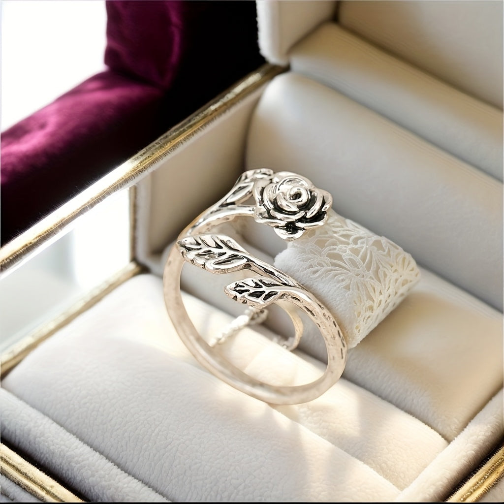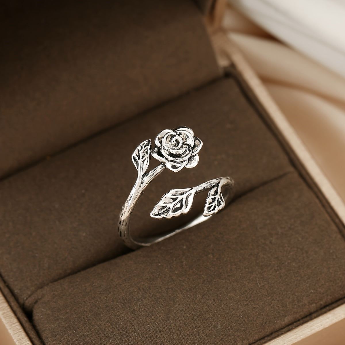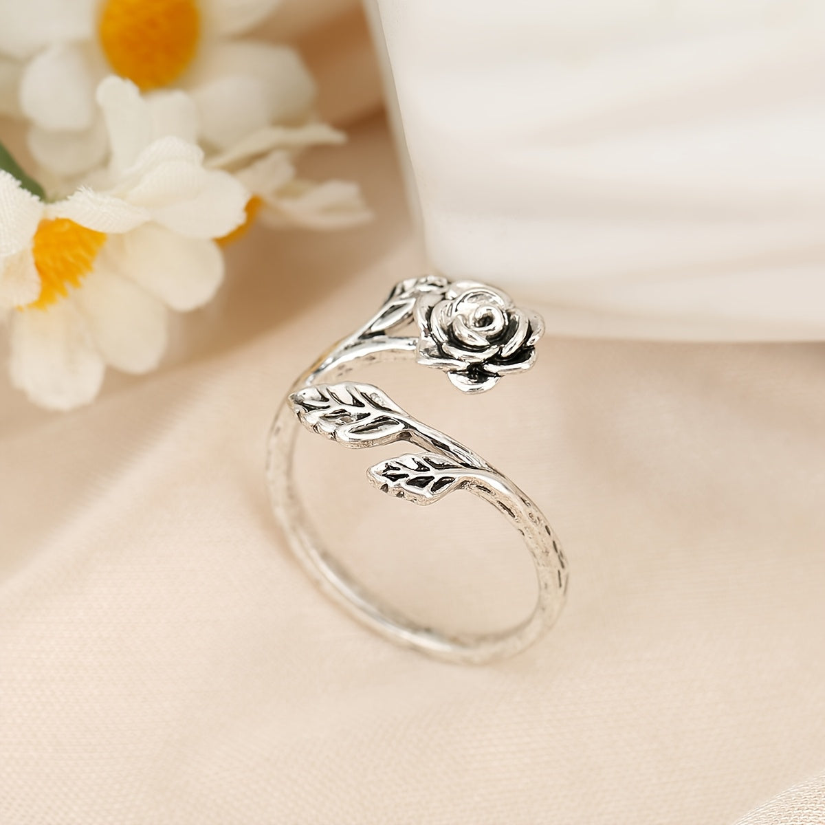 This stylish ring features an open rose design made of synthetic stones and copper. It is adjustable to fit most sizes and adds a touch of bohemian charm to any outfit.