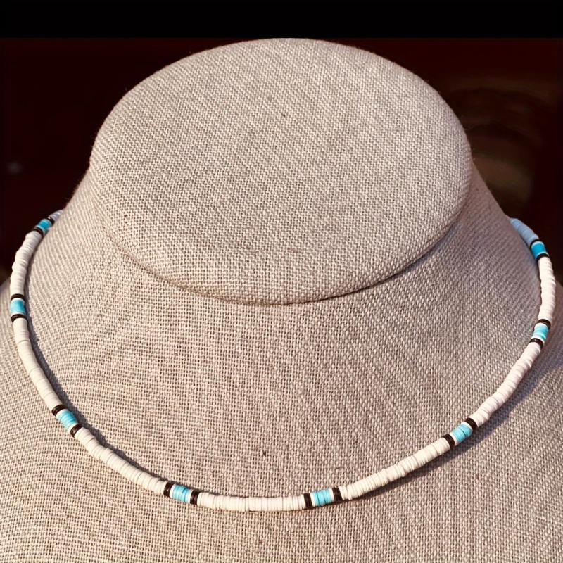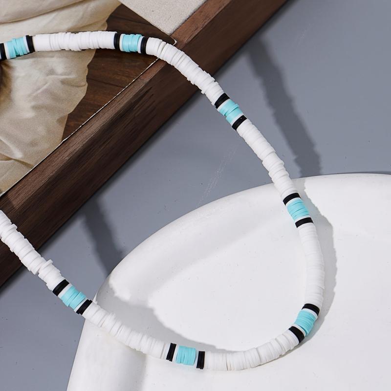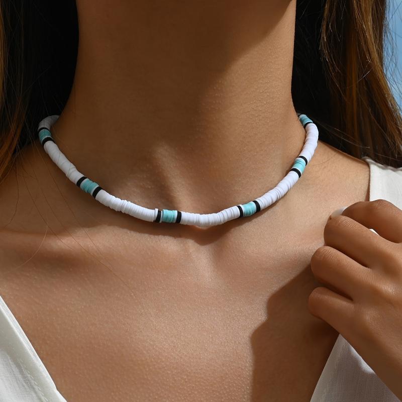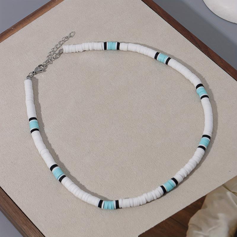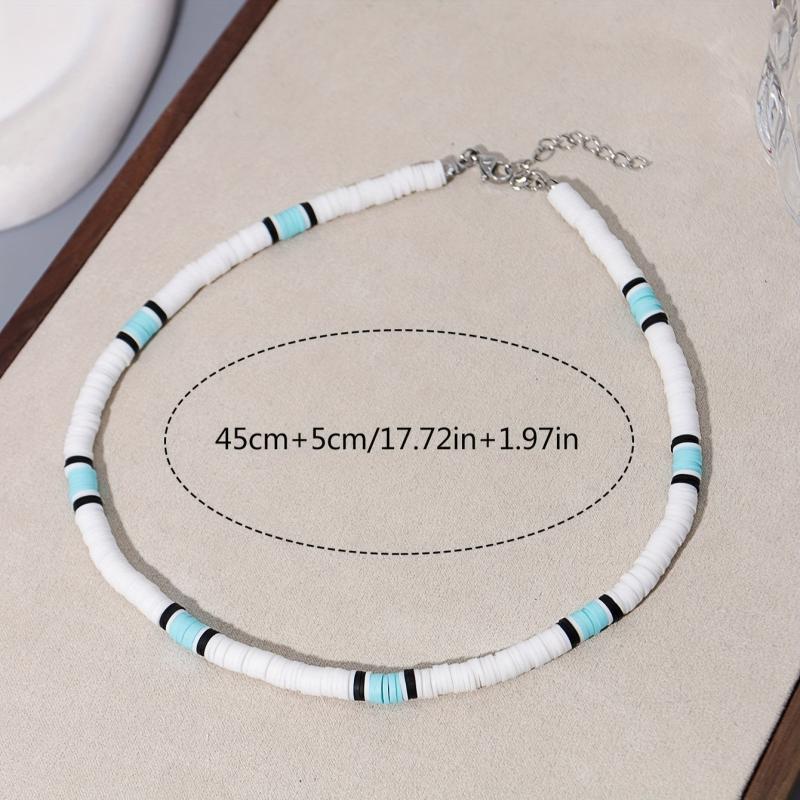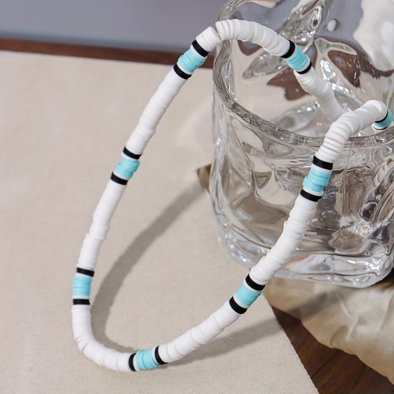 Elevate your look with this bohemian choker necklace featuring polymer clay beads in turquoise and striped patterns. Perfect accessory for beach vacations, parties, and casual outings all year round.