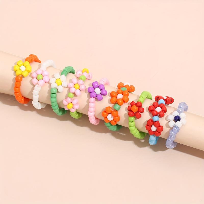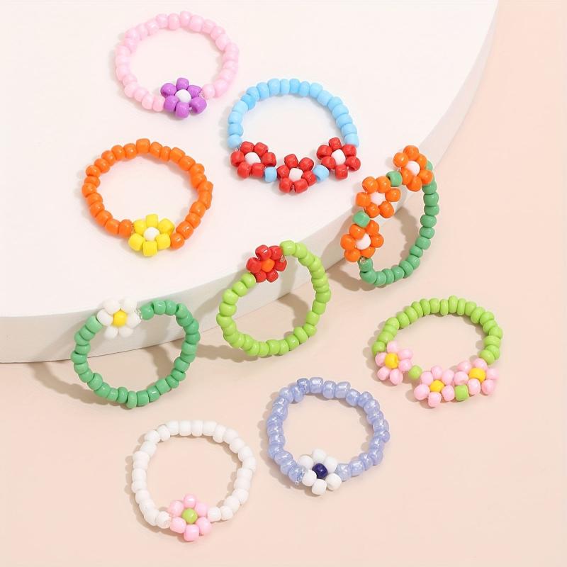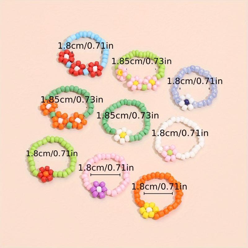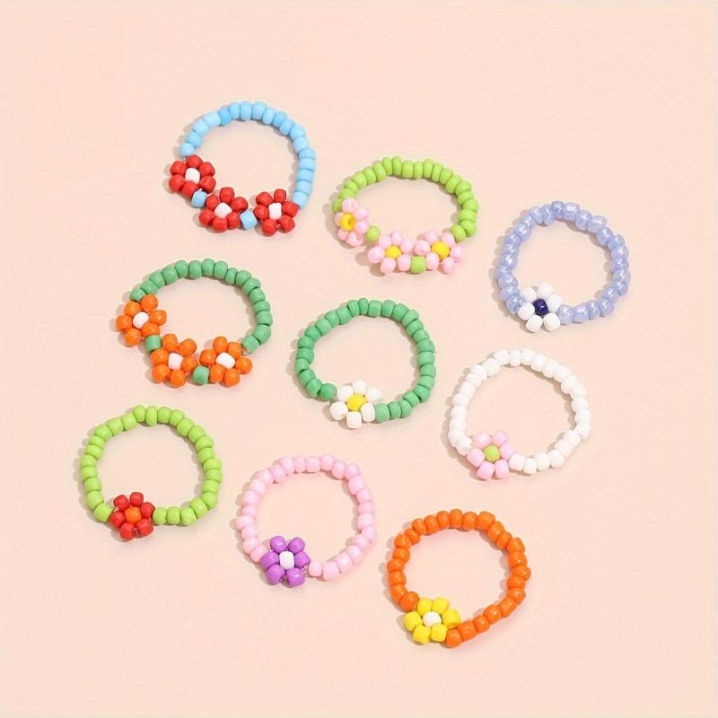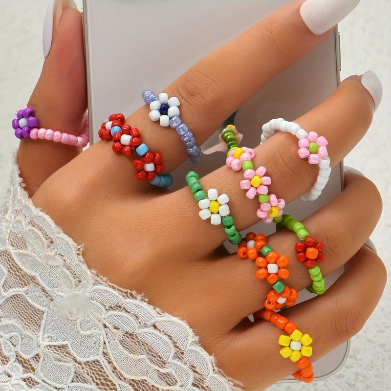 Add a touch of bohemian flair to your party or beach holiday look with this set of 9 beaded flower stacking rings. These rings features no plating and no setting, just pure beads for a unique and stylish look.