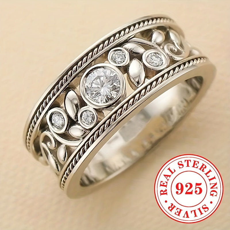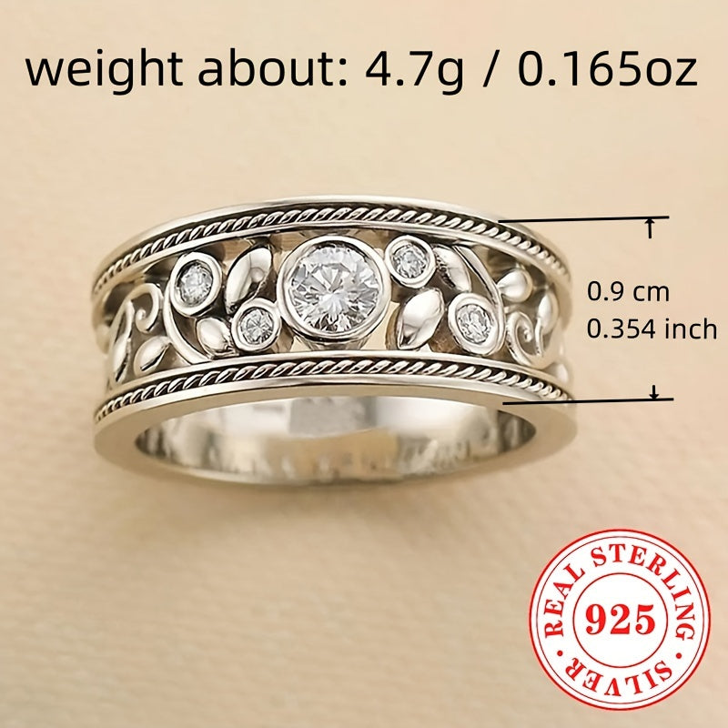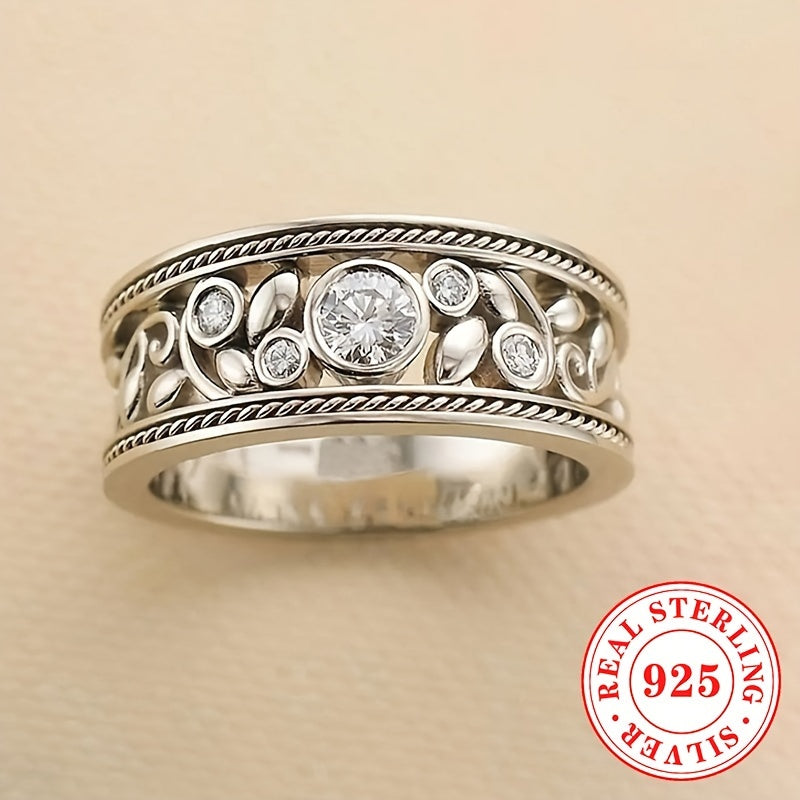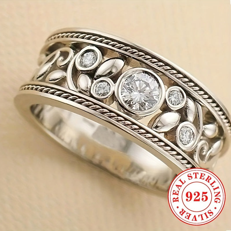 Elegant vintage bohemian ring featuring a hollowed out leaf design, crafted from rhodium-plated 925 silver with synthetic zirconia. Ideal for all-season wear and makes a perfect April birthstone gift.