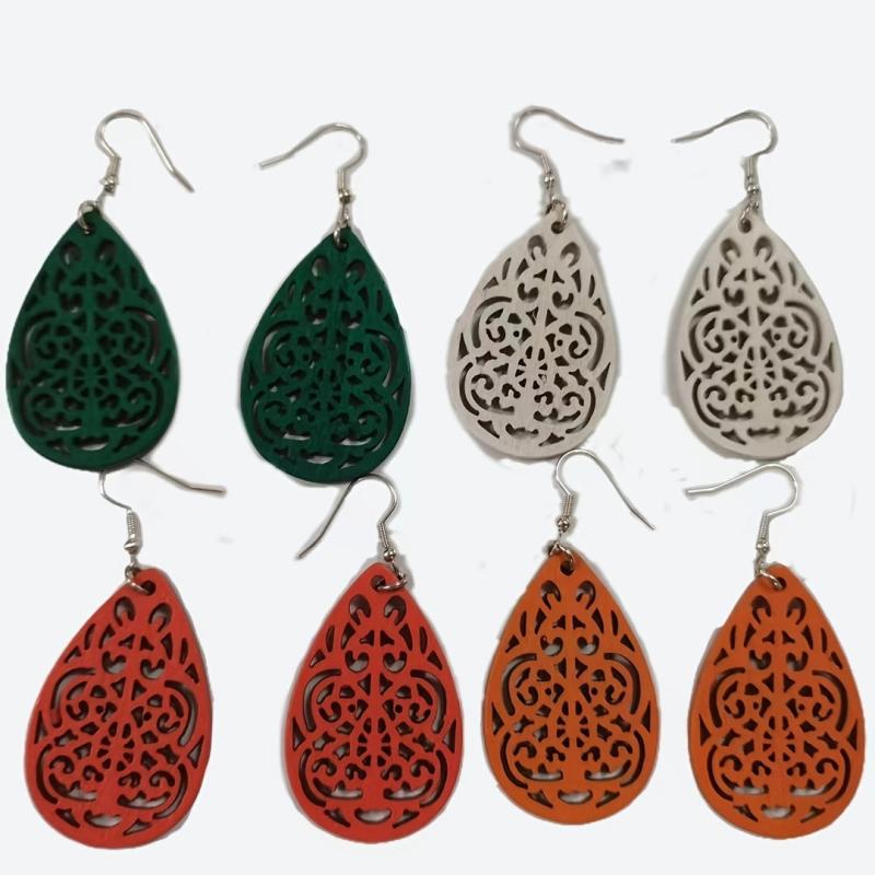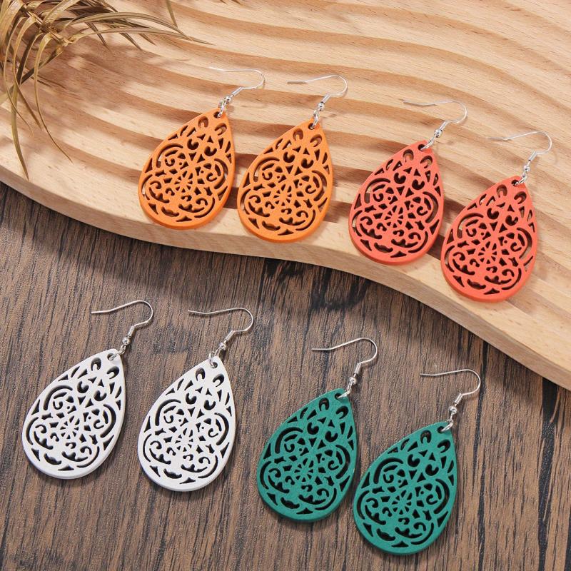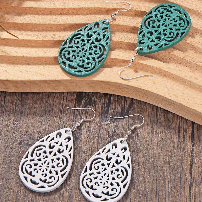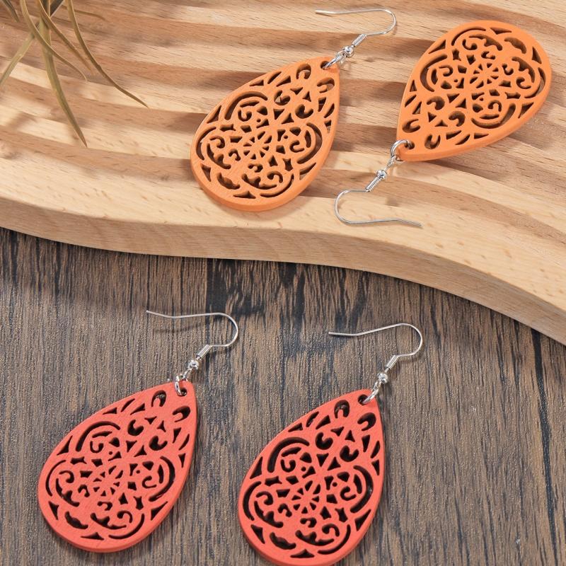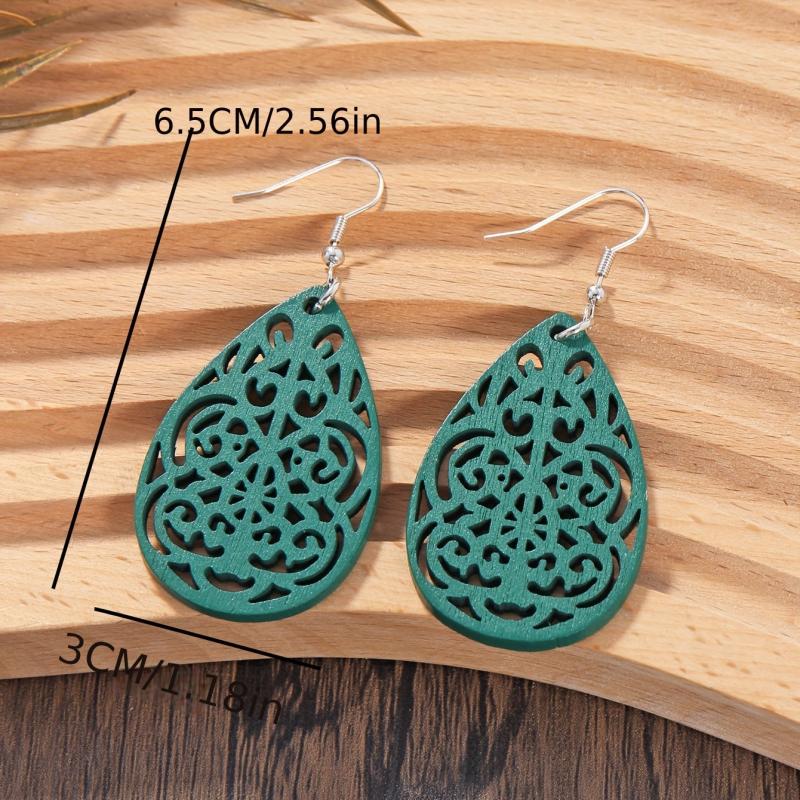 Enhance your style with these unique statement earrings featuring pretty craved hollow leaf shapes. Made of wood, these bohemian style earrings are a perfect addition to your jewelry collection.