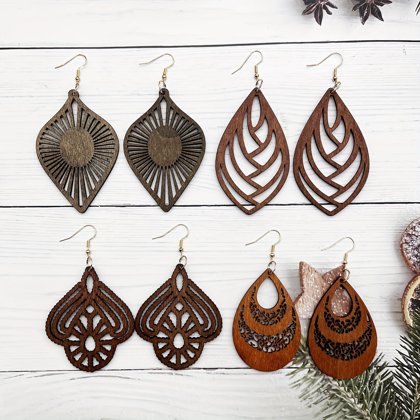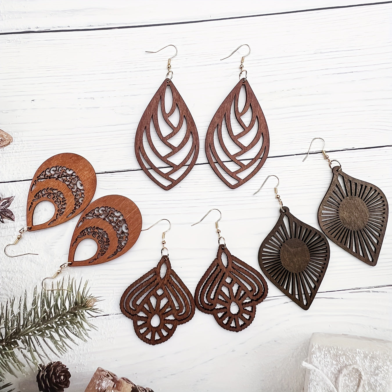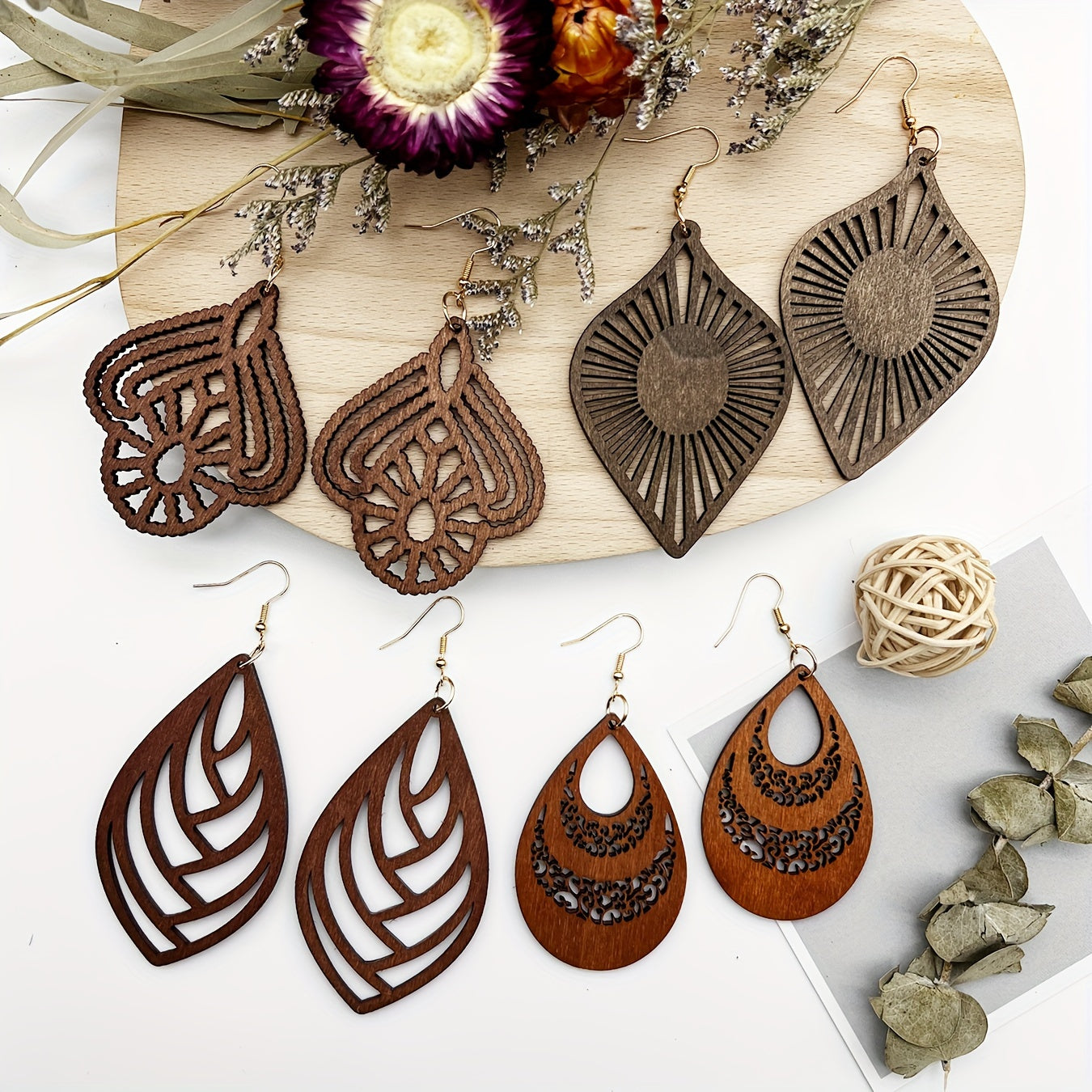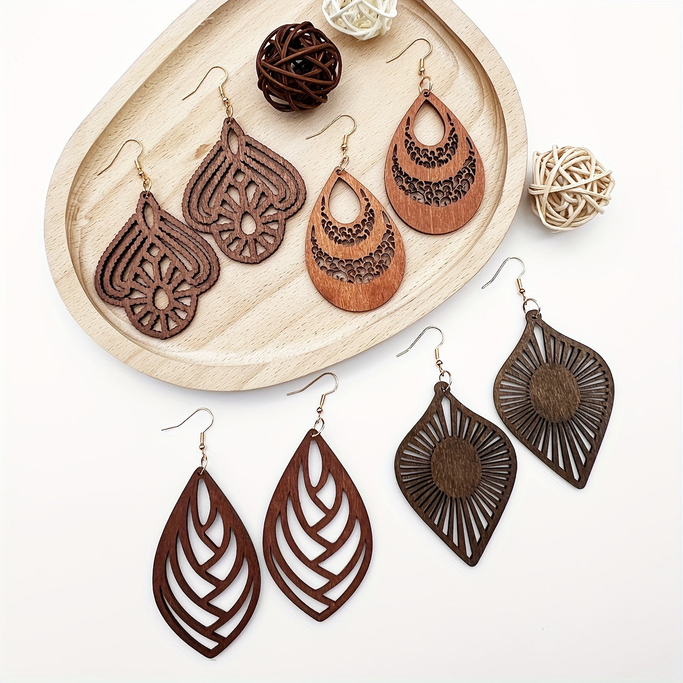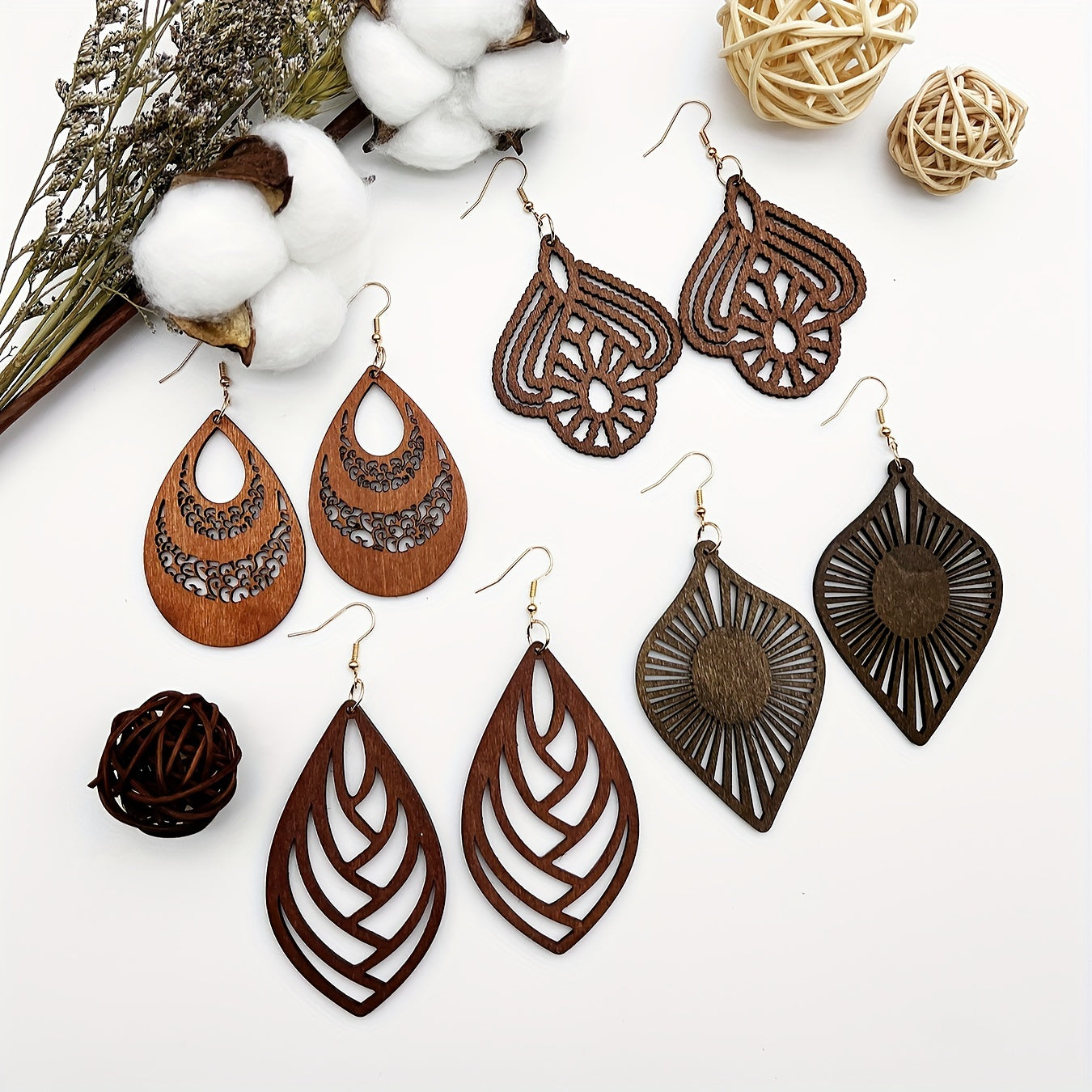 Add a touch of bohemian flair to your look with this set of wooden dangle earrings featuring a hollow carved pattern. Perfect for any occasion, these earrings are a stylish accessory for any outfit.