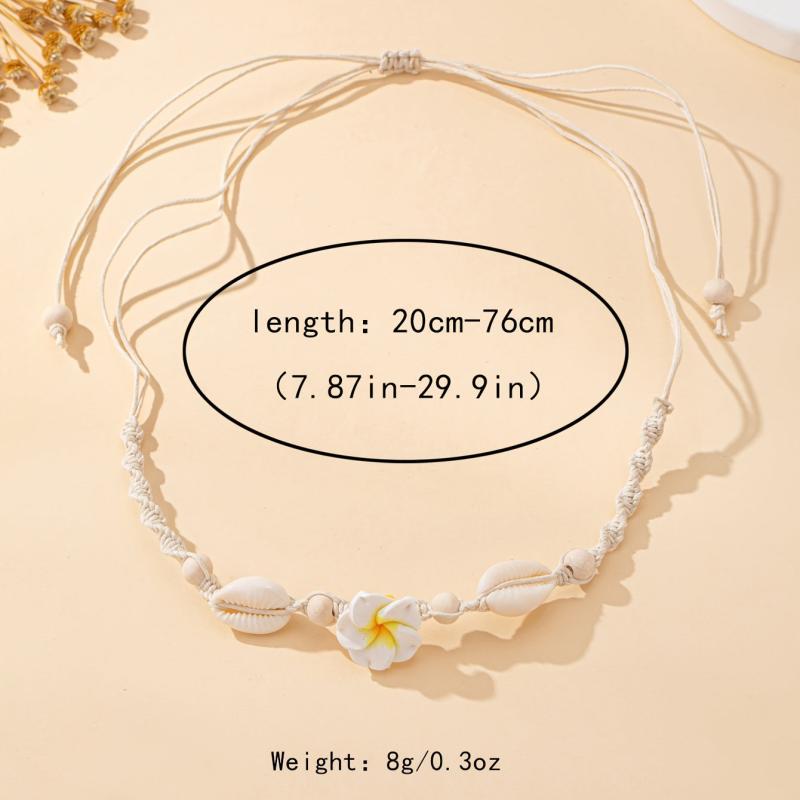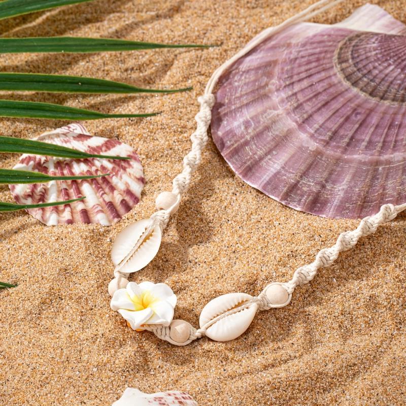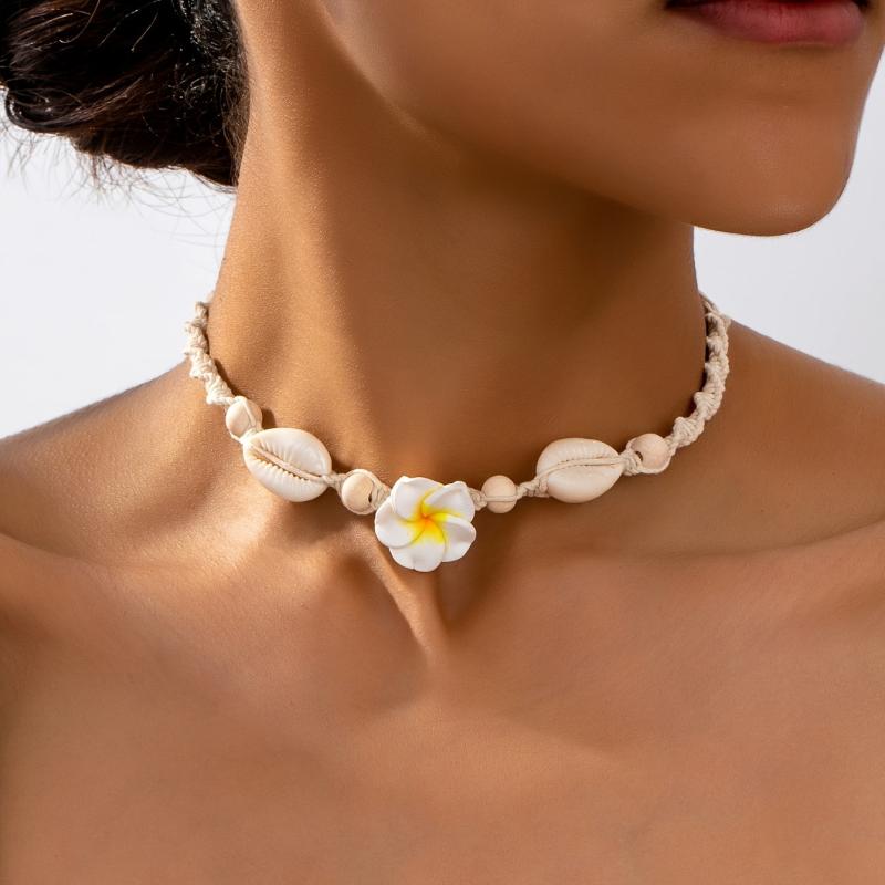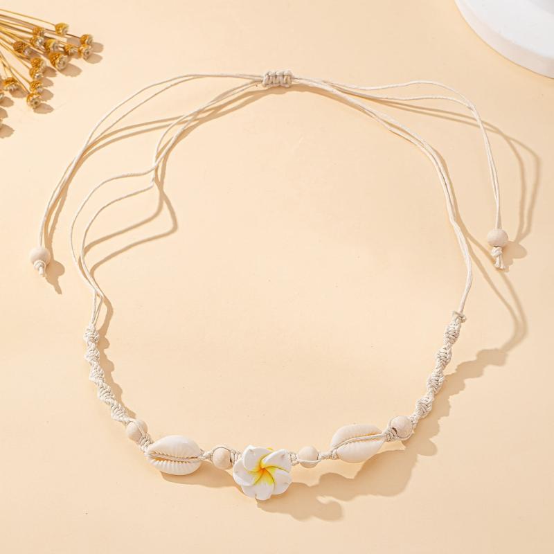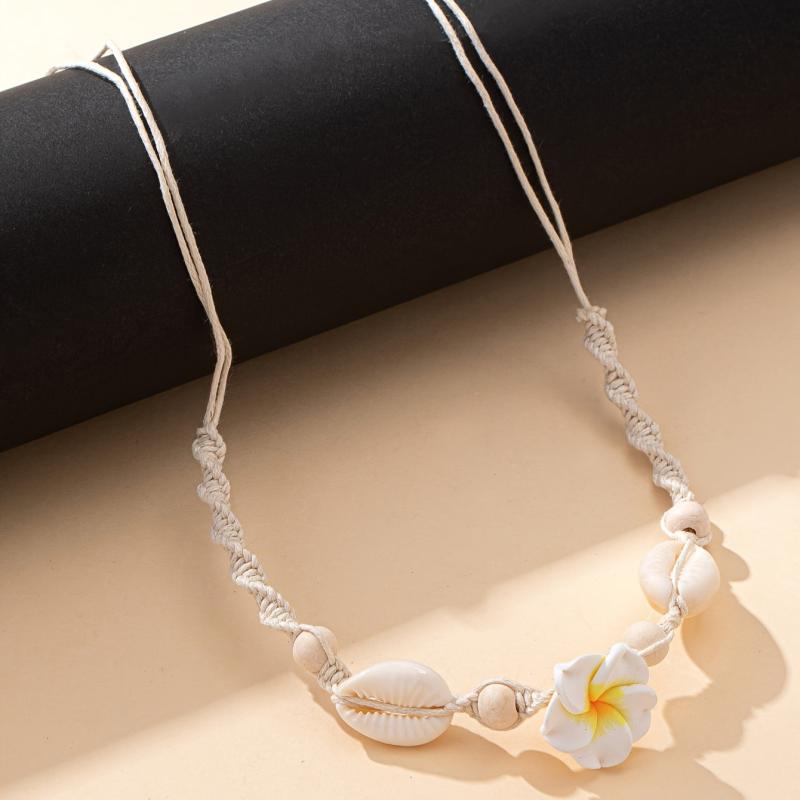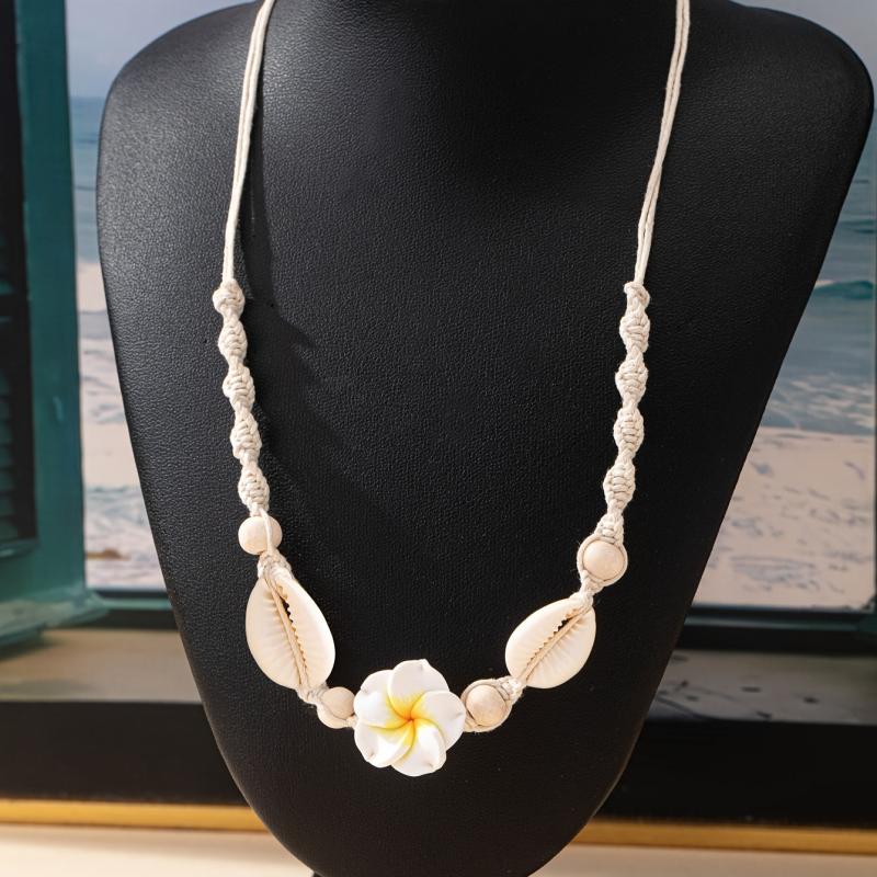 Elevate your vacation casual attire with this bohemian summer necklace featuring a mix of shells and soft clay flower pendant on a braided cord. Perfect for beach days or as a thoughtful gift.