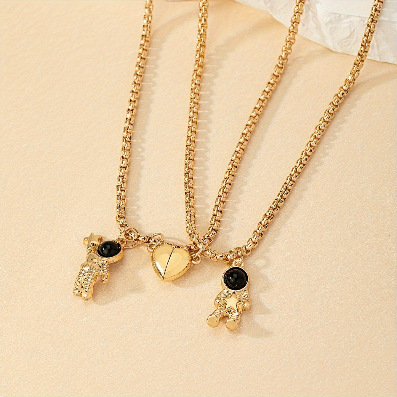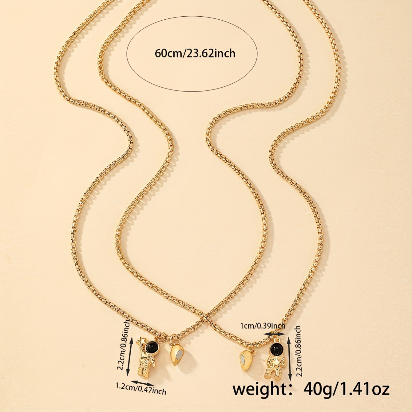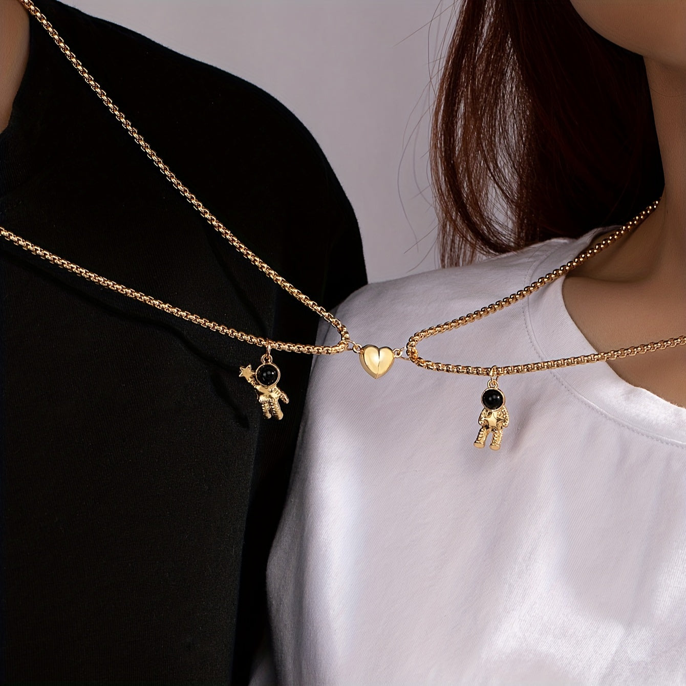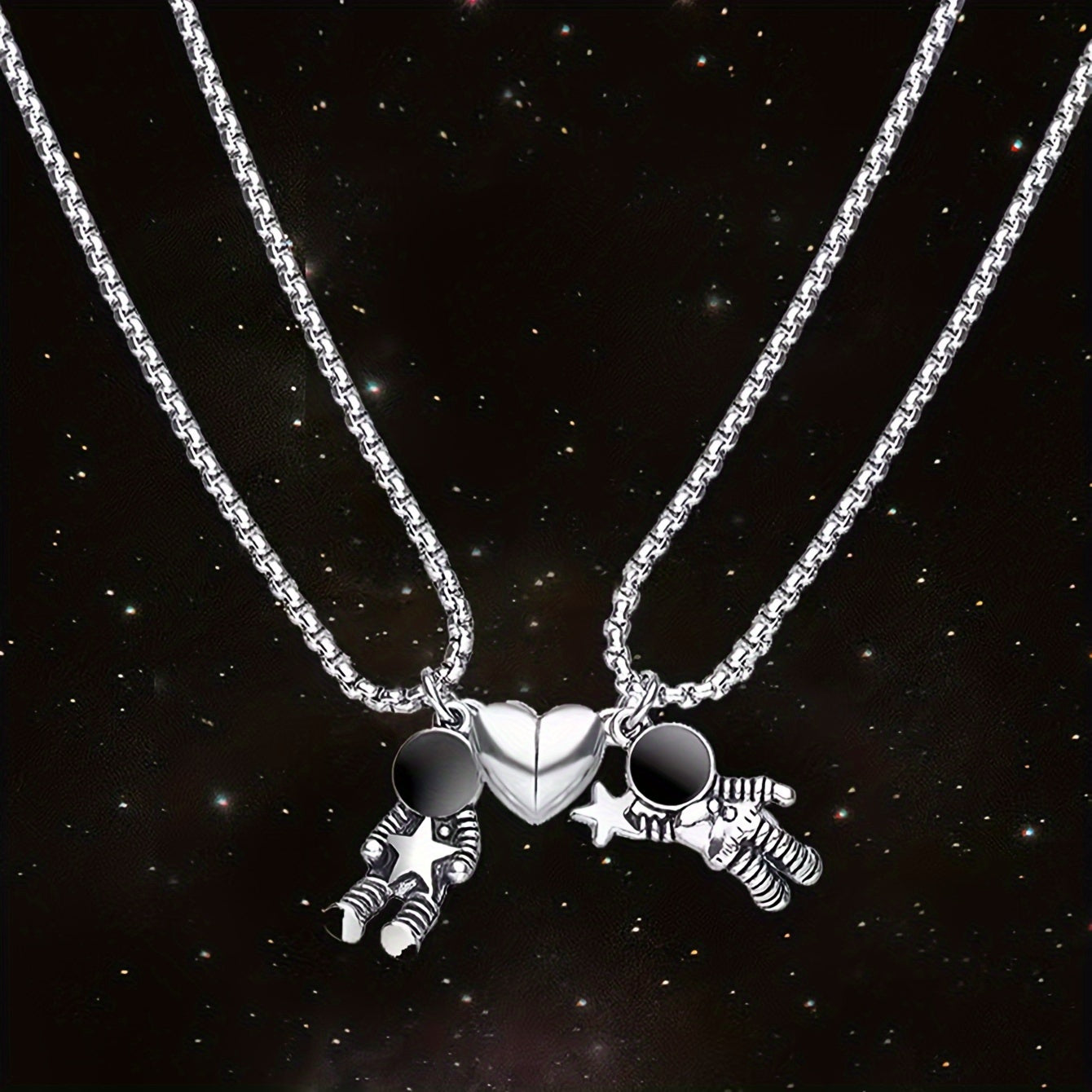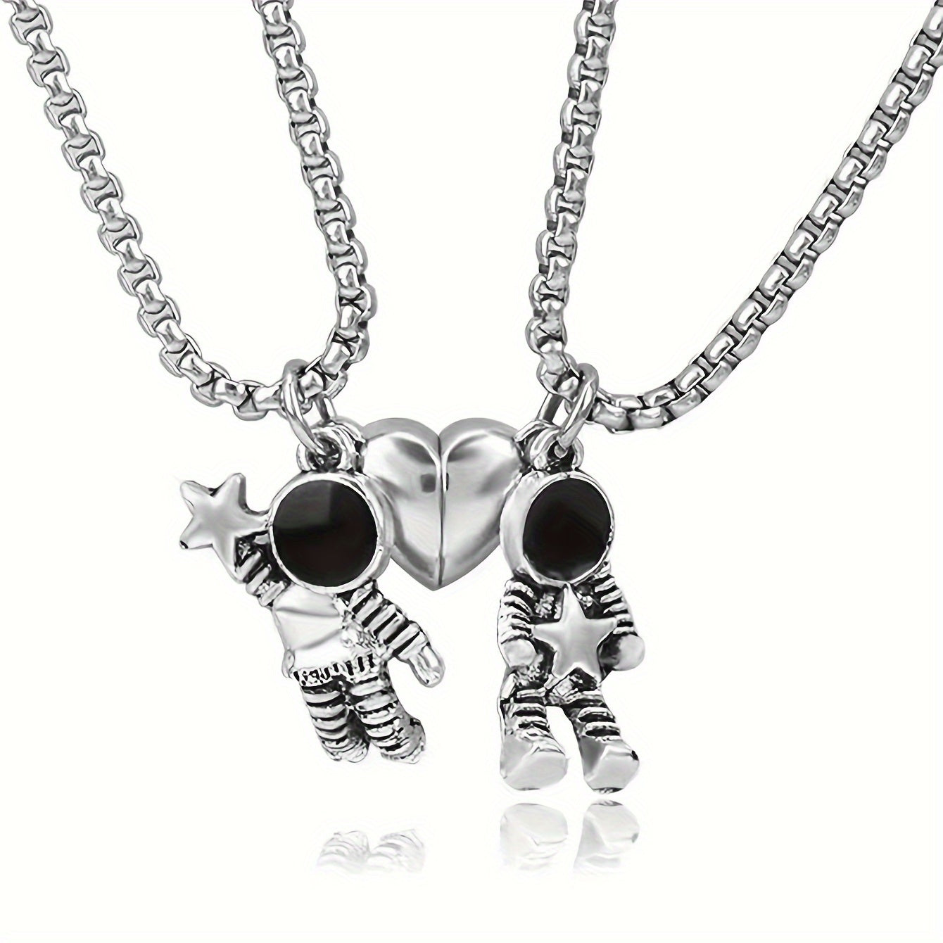Boho Astronaut Pendant Necklace Set for Couples with Heart Detail