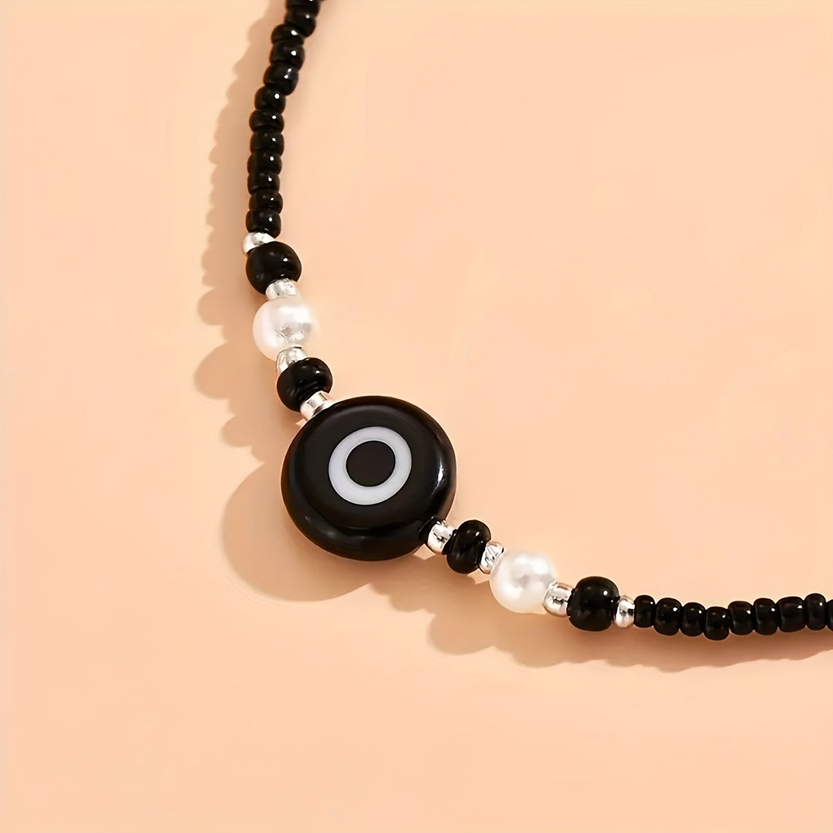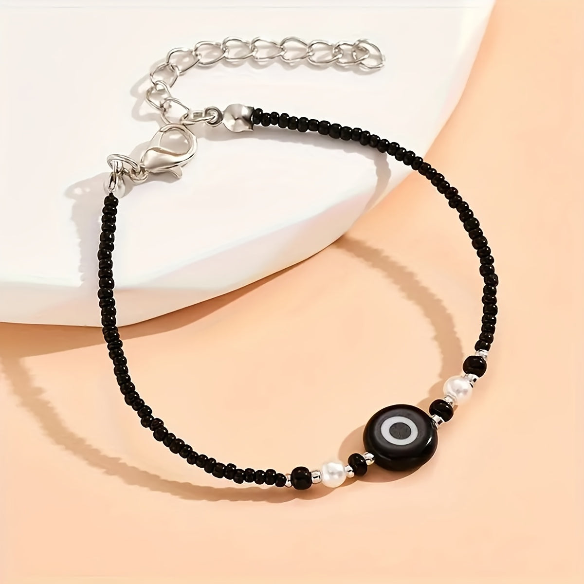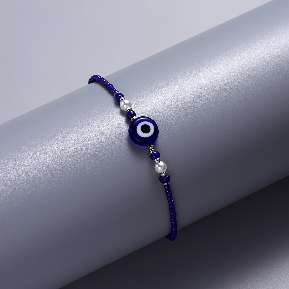 This Bohemian minimalist evil eye beaded bracelet is crafted with glass material, making it perfect for daily wear or gifting. The bracelet features rice beads for a unique touch.