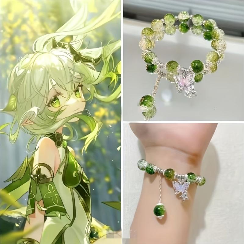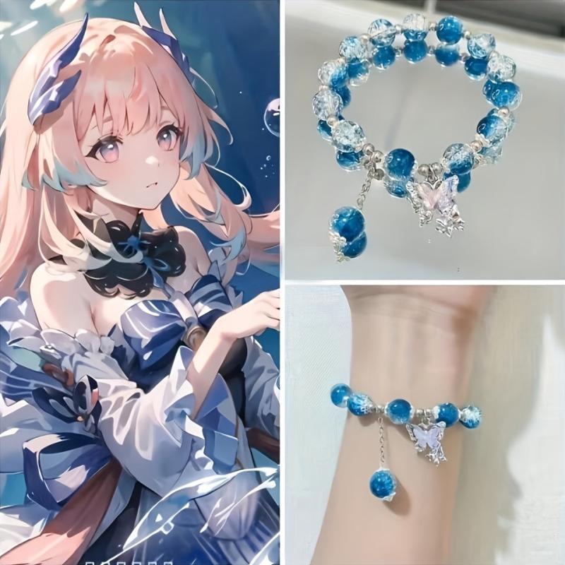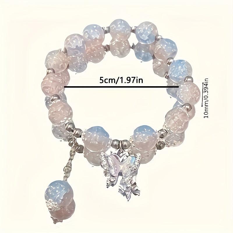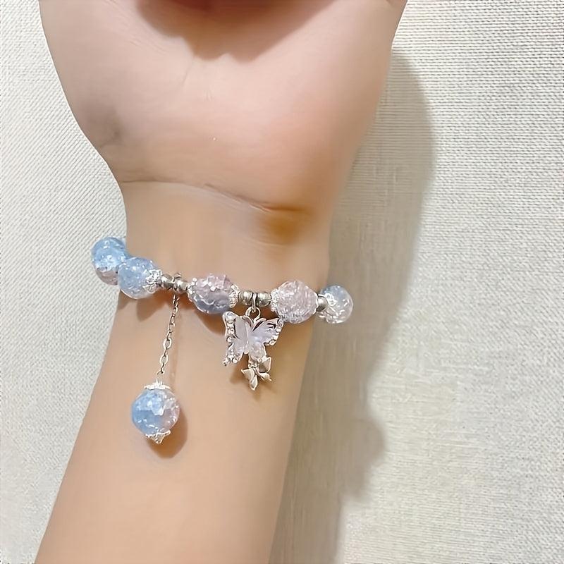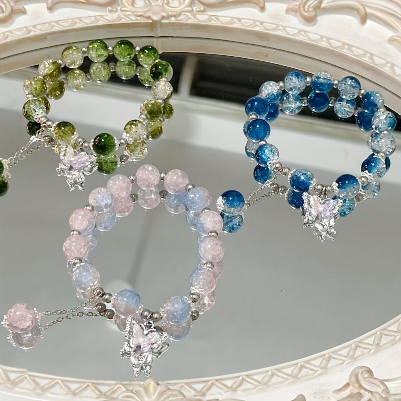 Add a touch of bohemian style to your casual attire with this glass bead bracelet featuring ice crack details and a butterfly pendant. Available in green and pink colors, it's the perfect accessory for any holiday outfit or a thoughtful gift.