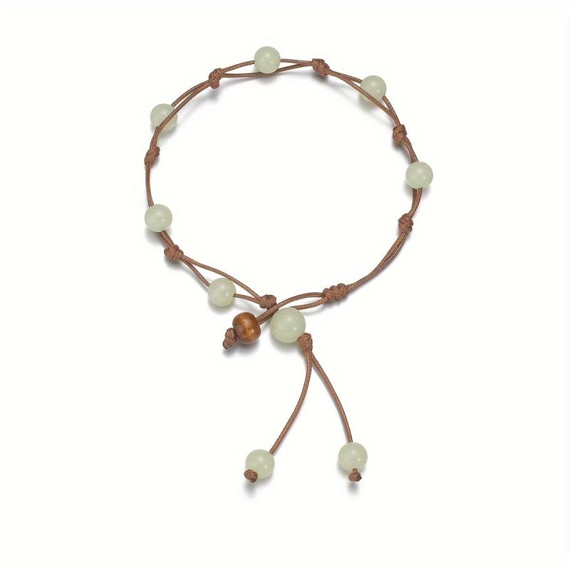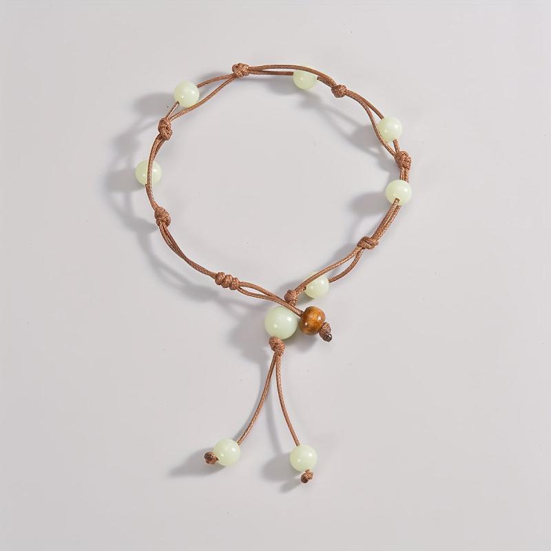 This boho anklet features luminous acrylic beads that glow in the dark, perfect for beach vacations and parties. The brown braided cord is adjustable to fit most sizes.