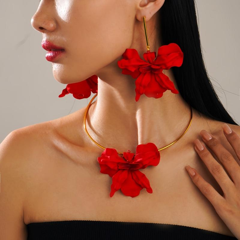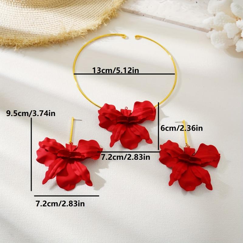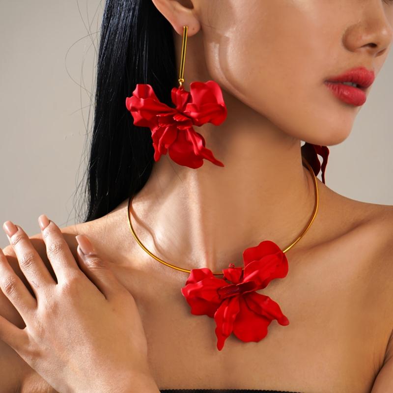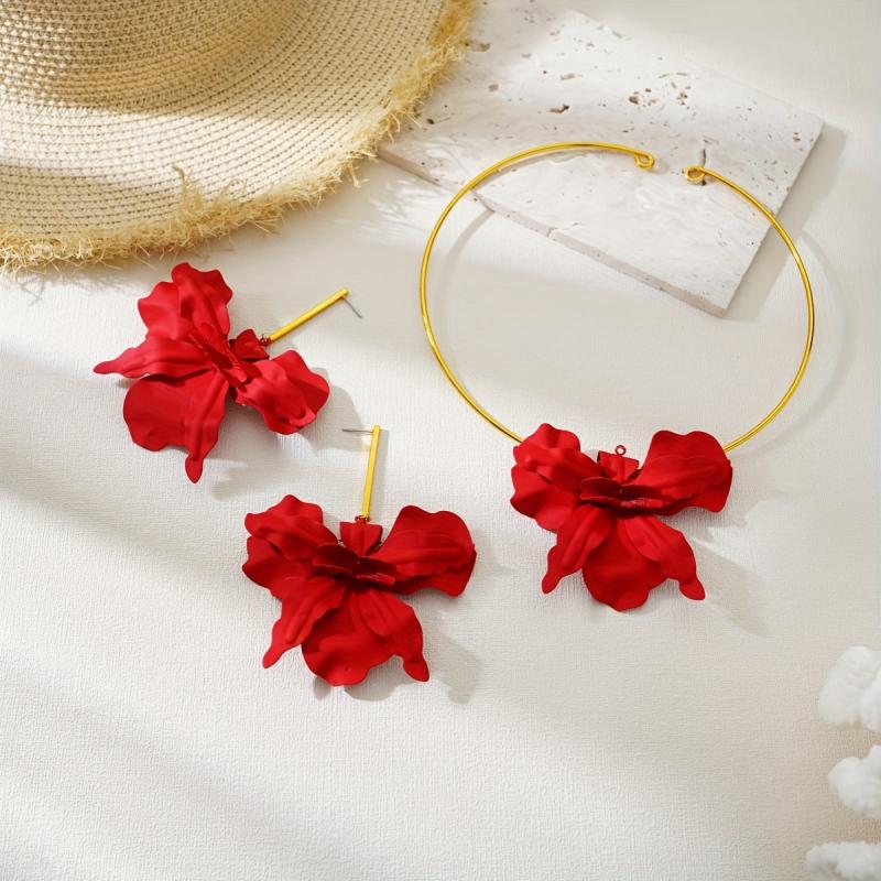 Complete your look with this bohemian-inspired jewelry set featuring red flower earrings and matching necklace.