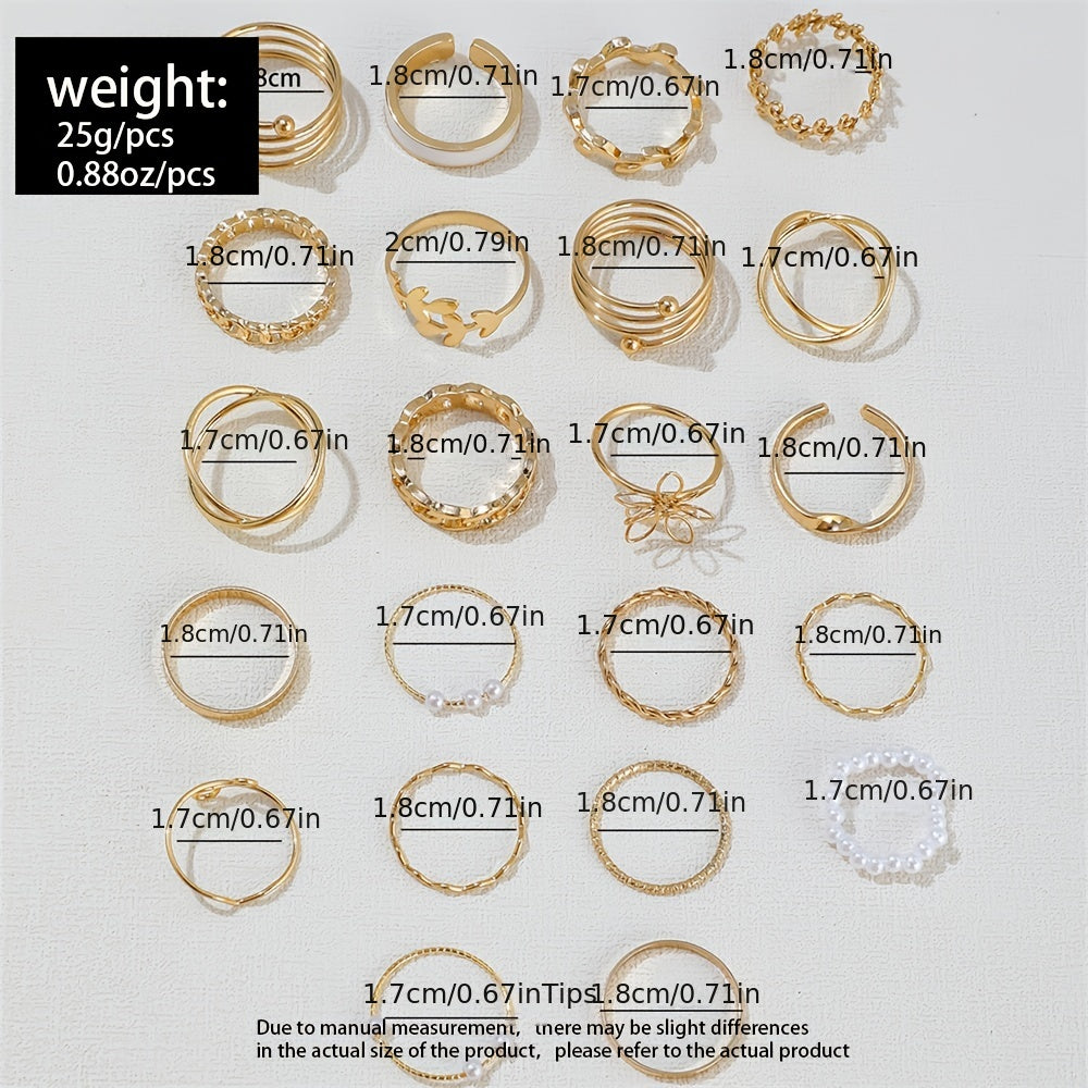 Enhance your casual style with this classic combination ring set featuring 22 pieces in various designs including beaded, leaf, geometric, and wave patterns. Mix and match to create your unique look.
