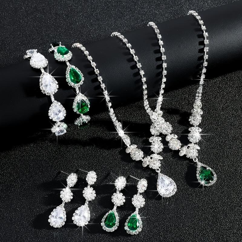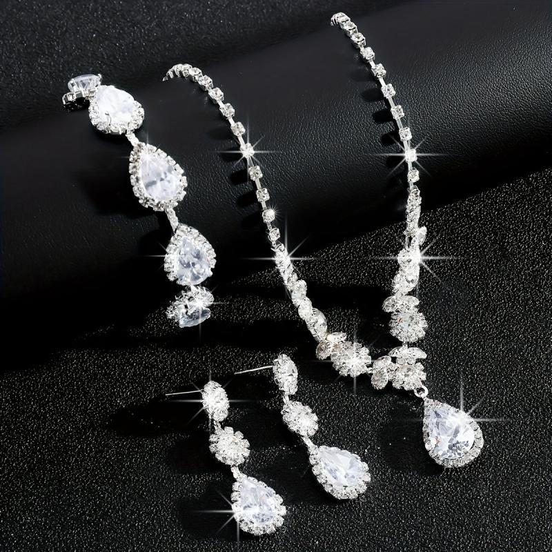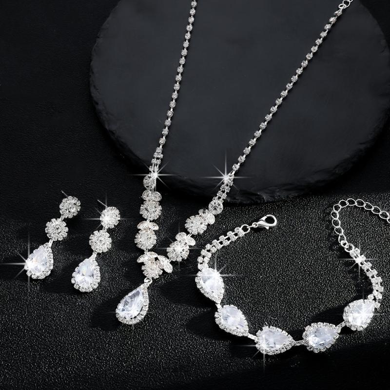 Complete your wedding look with this stunning three-piece set featuring a necklace, bracelet, and earrings adorned with artificial crystals.
