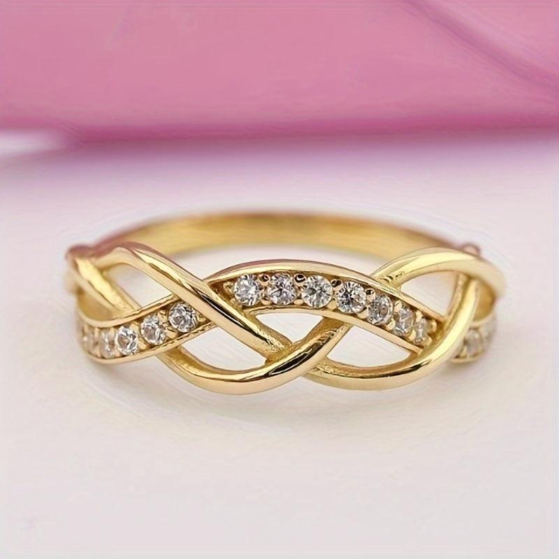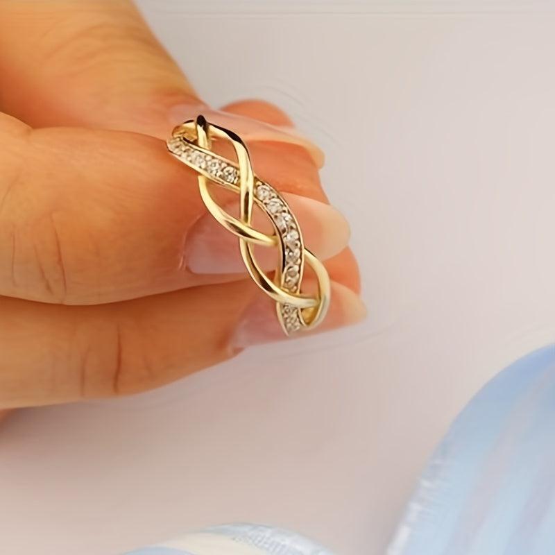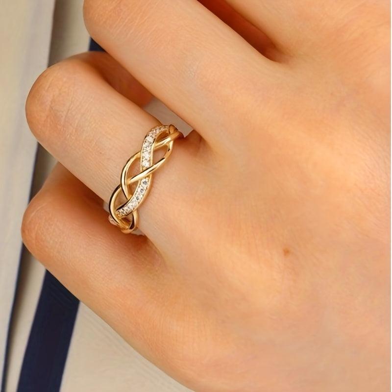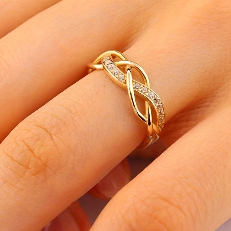 This sparkling cubic zirconia golden tone rotating knot ring is the perfect accessory for everyday wear or special occasions. It makes a thoughtful gift for her.