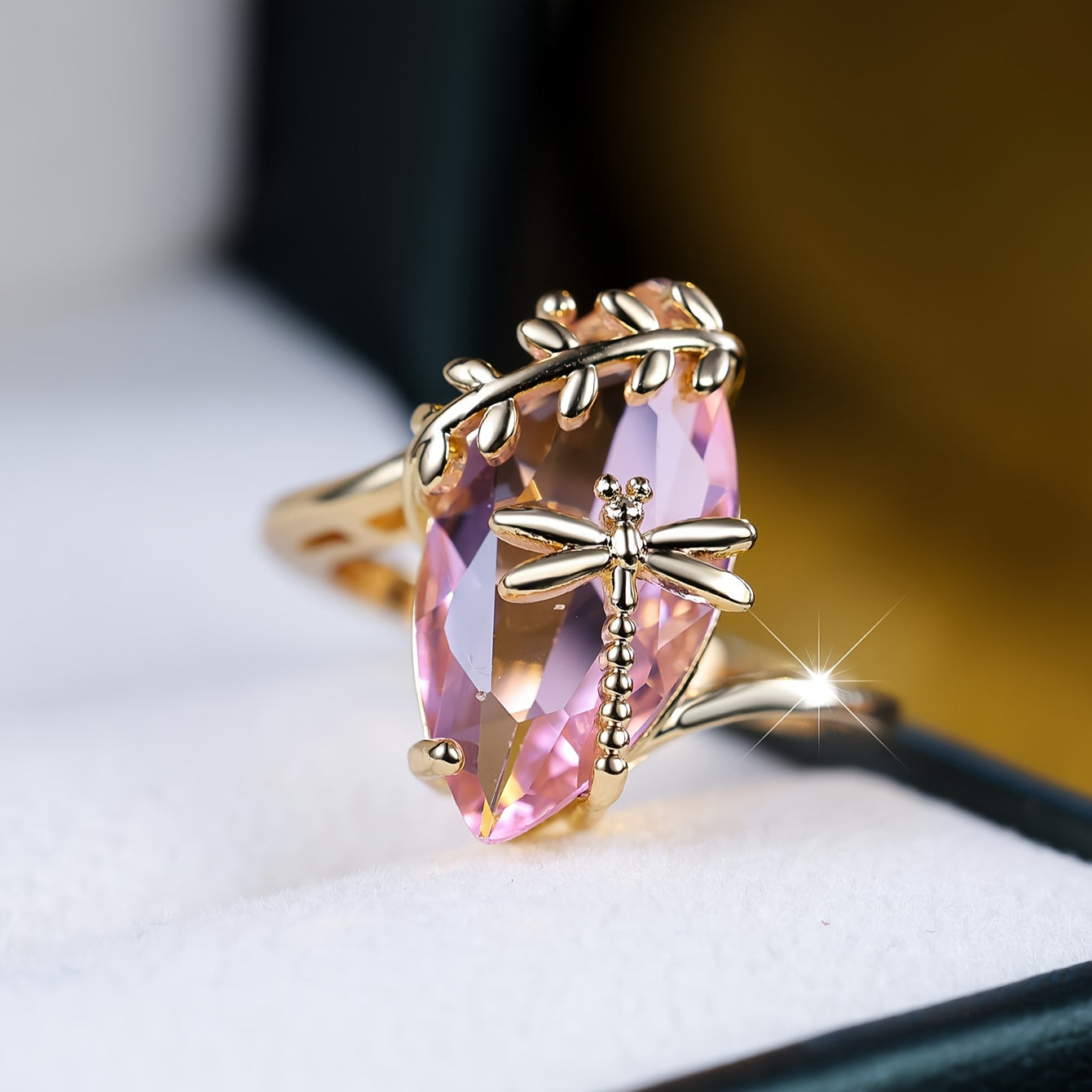 Exquisite ring with a dragonfly design in olive green and pink zirconia, accented with a willow branch for a unique look. Ideal for women.