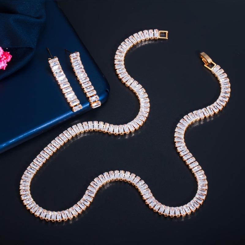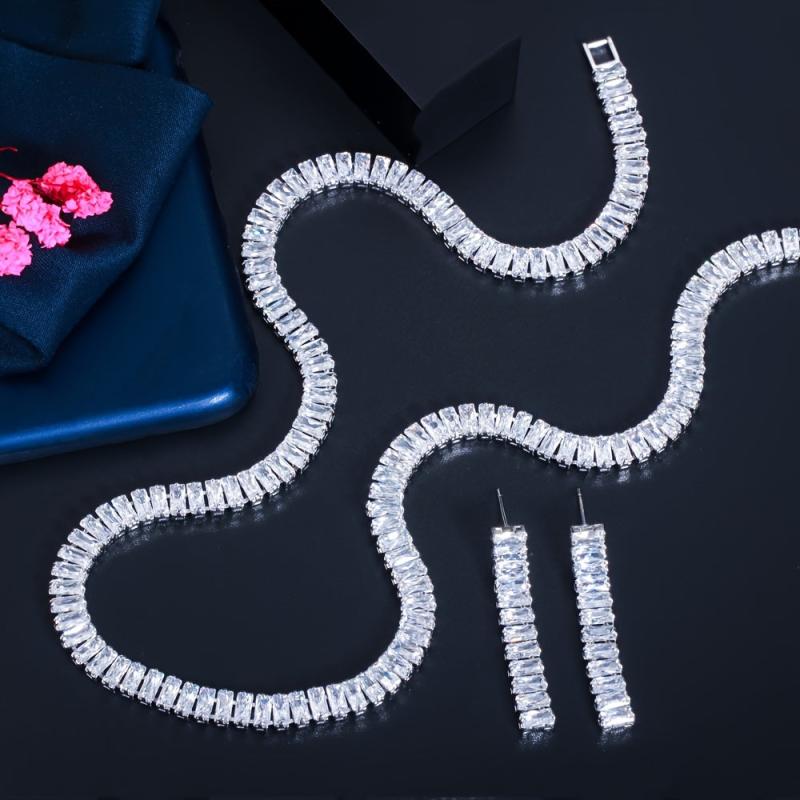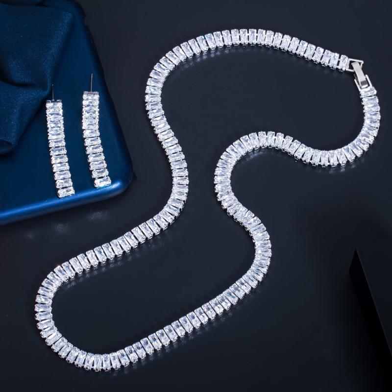 Complete your evening look with this stunning three-piece jewelry set. The set includes a long stick cut synthetic zirconia necklace pendant and matching earrings, perfect for dinner wear.