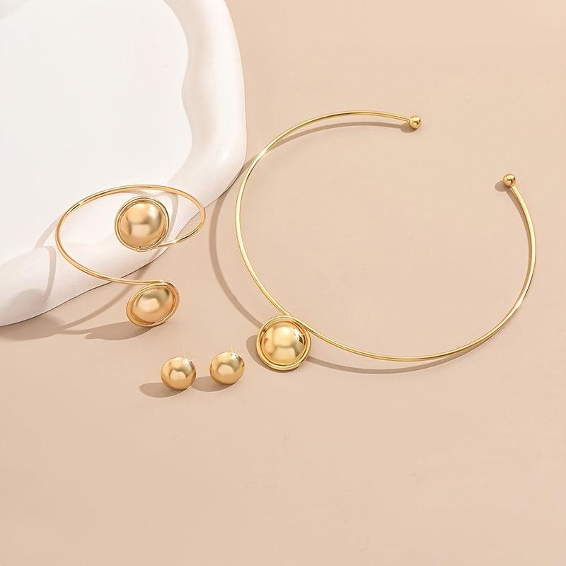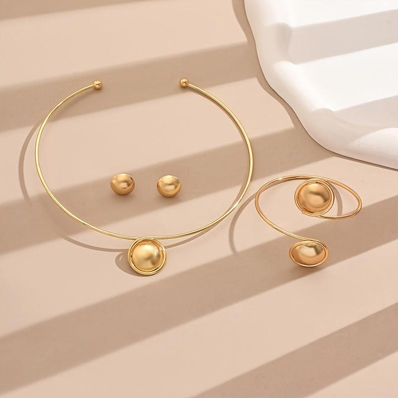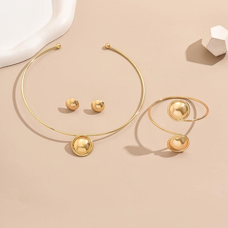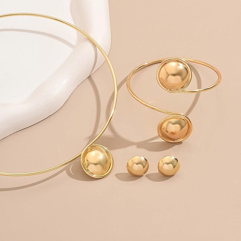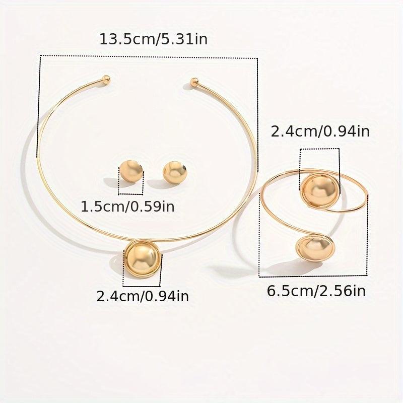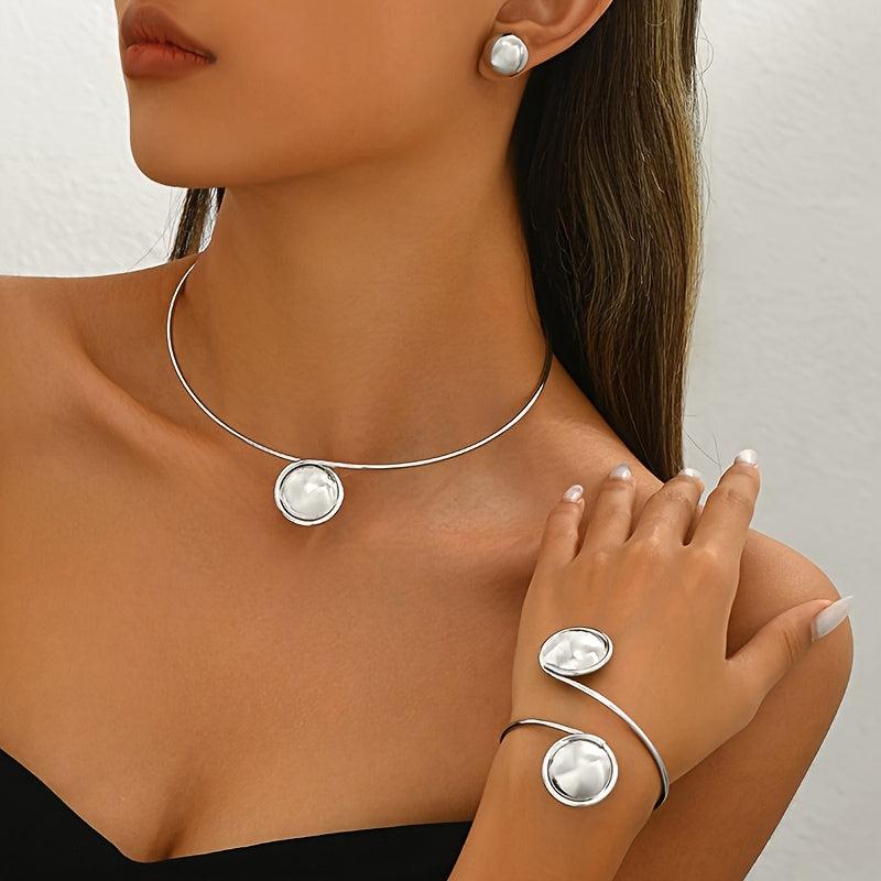 Dazzle with this 4-piece set featuring open hoop earrings, a bracelet, and a necklace with a bold geometric design. Perfect for adding a touch of glamour to your look.