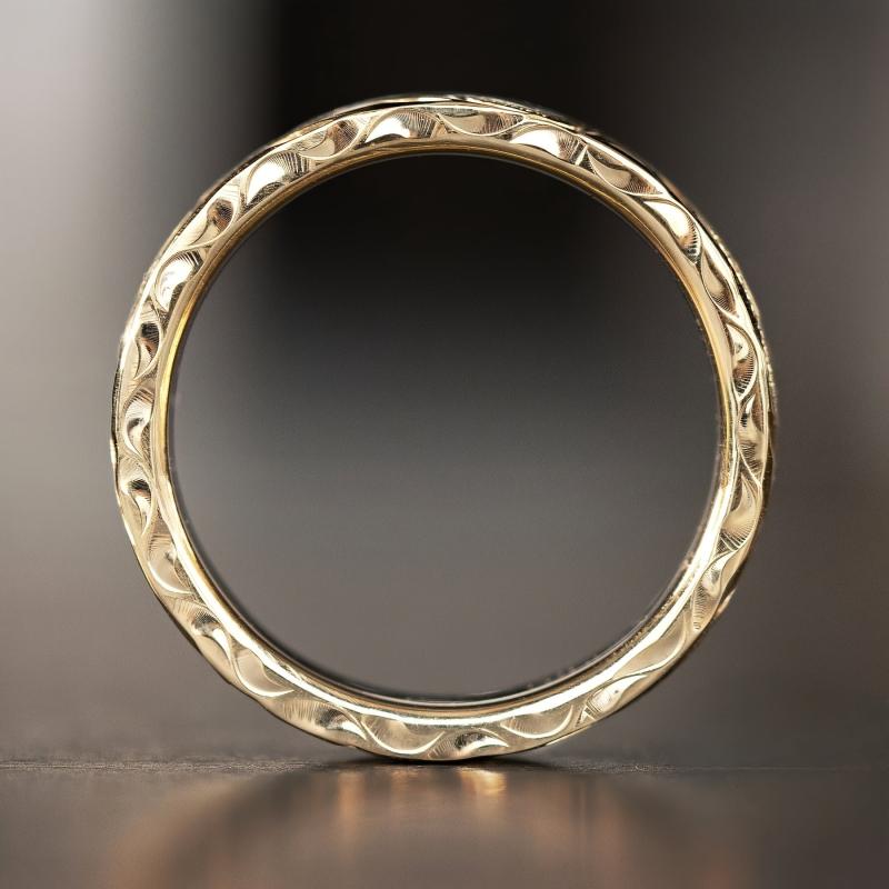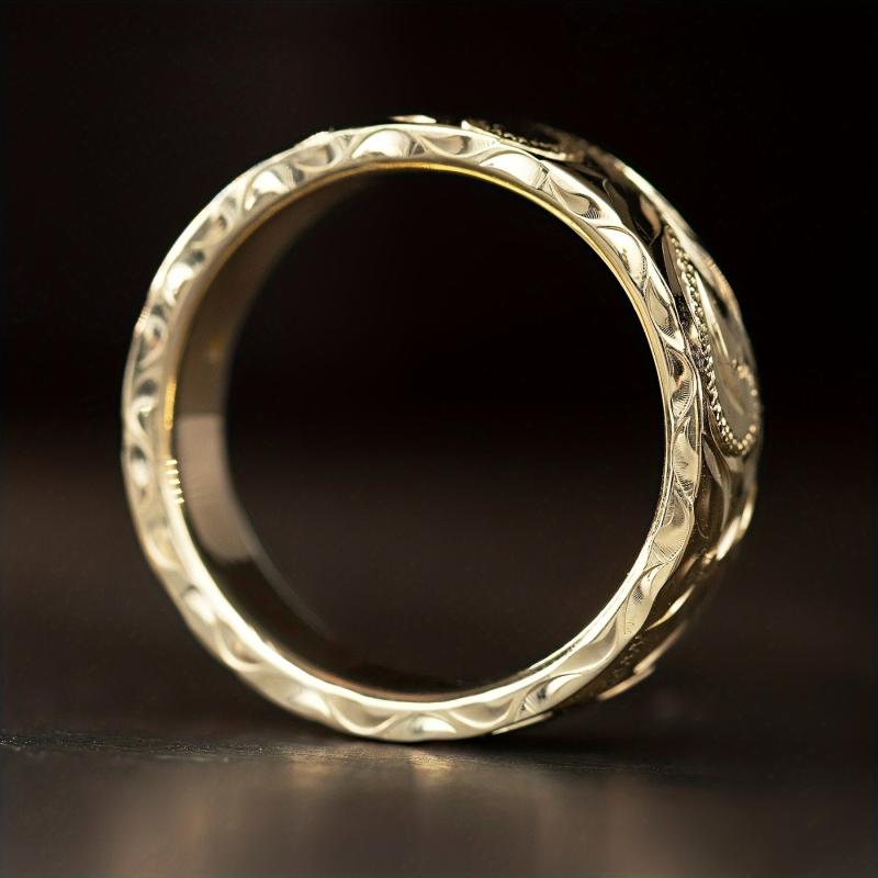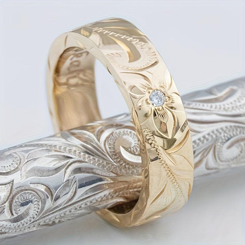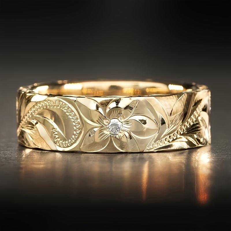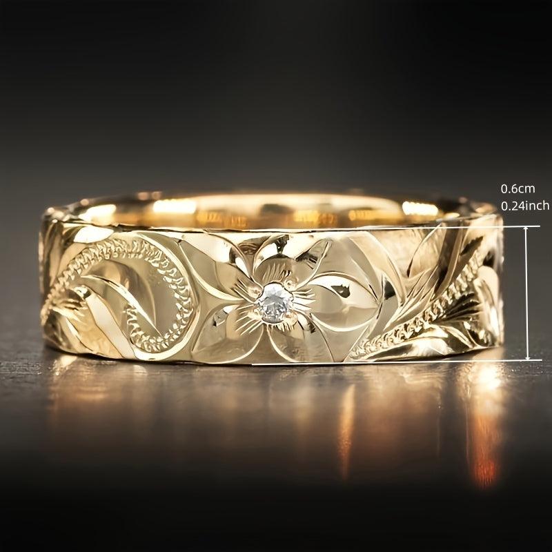 Elegant wide band ring featuring floral engraving and synthetic cubic zirconia. Perfect for daily wear or parties. April birthstone jewelry for a touch of glamour.