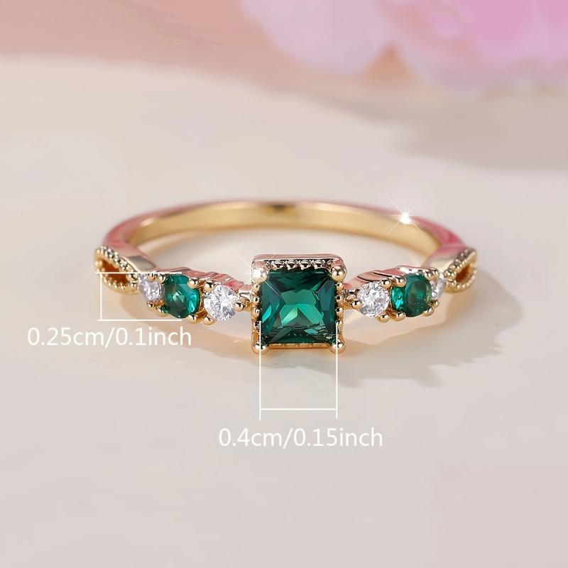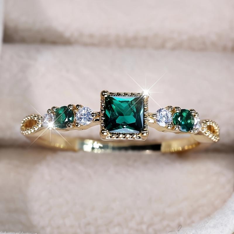Make a statement with this stunning retro square ring featuring emerald and green cubic zirconia stones on a golden copper band with sparkling accents. Perfect for weddings, engagements, and special occasions.