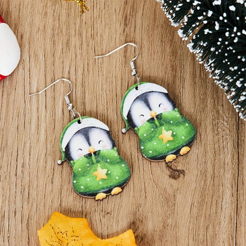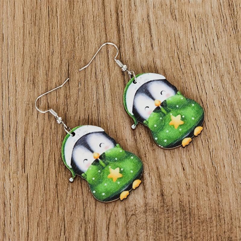 Green & Red Penguins Dangle Earrings Set Boho Style Wooden Jewelry