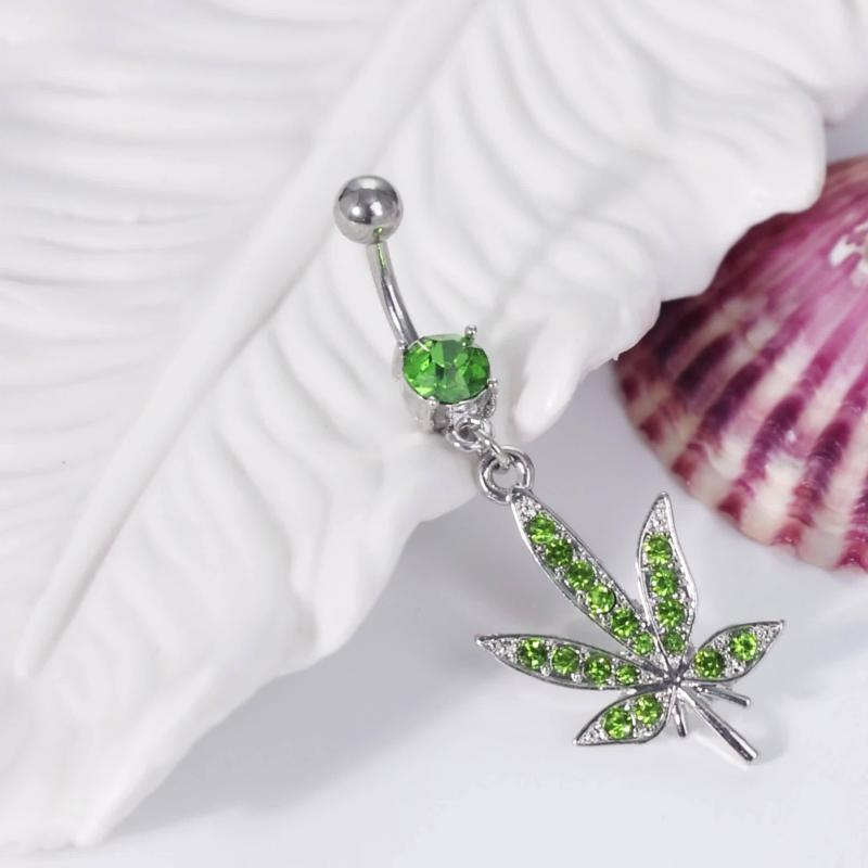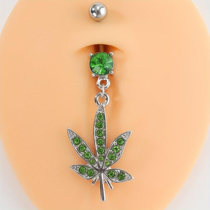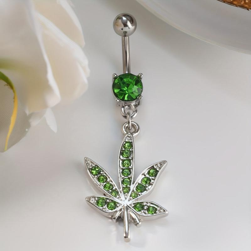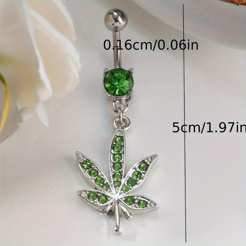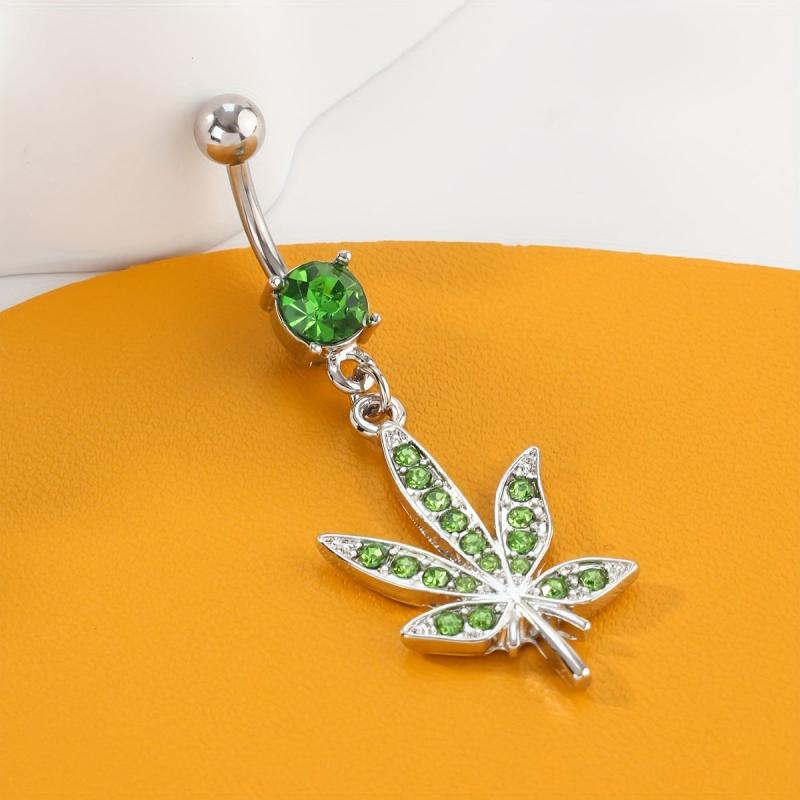 Enhance your style with this stainless steel belly button ring featuring a green rhinestone leaf pendant. Perfect for parties and events.
