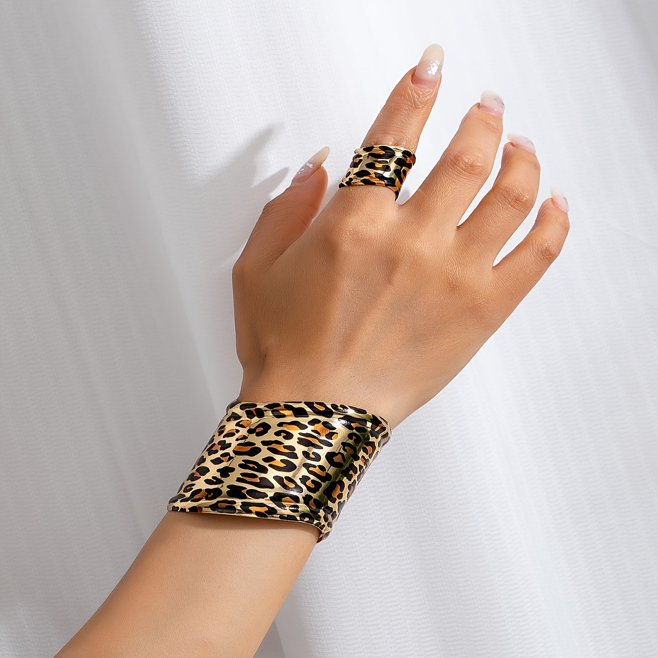 Upgrade your accessory game with this fashionable wide band metal bracelet and ring set. Features leopard print design, iron material, adjustable open cuff, and suitable for daily wear throughout every season.