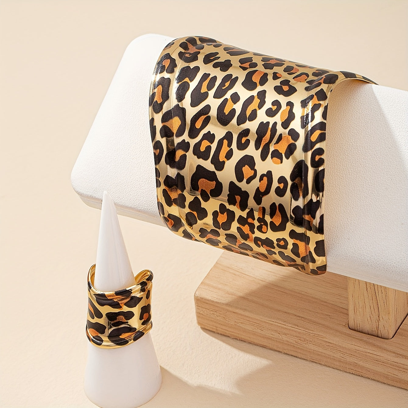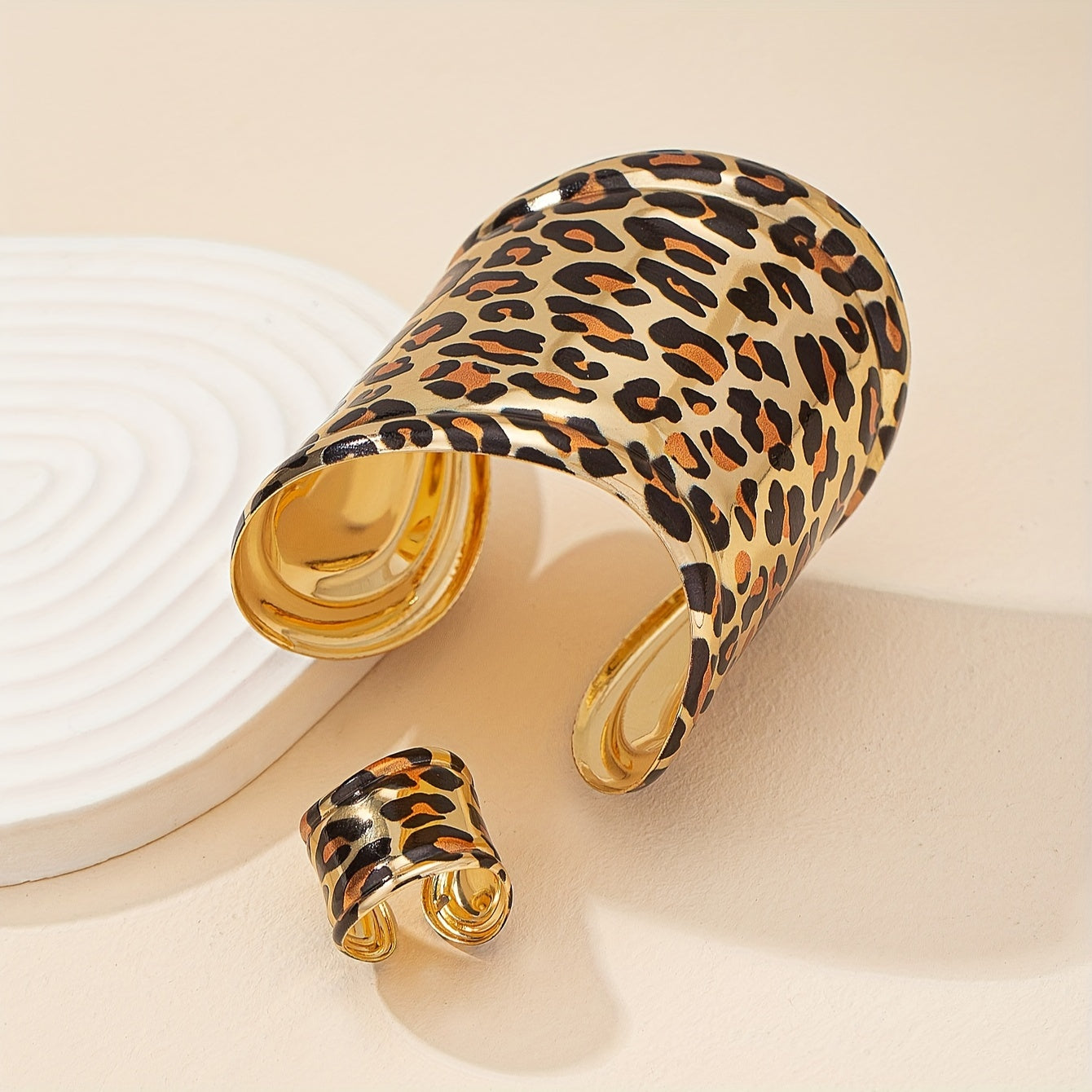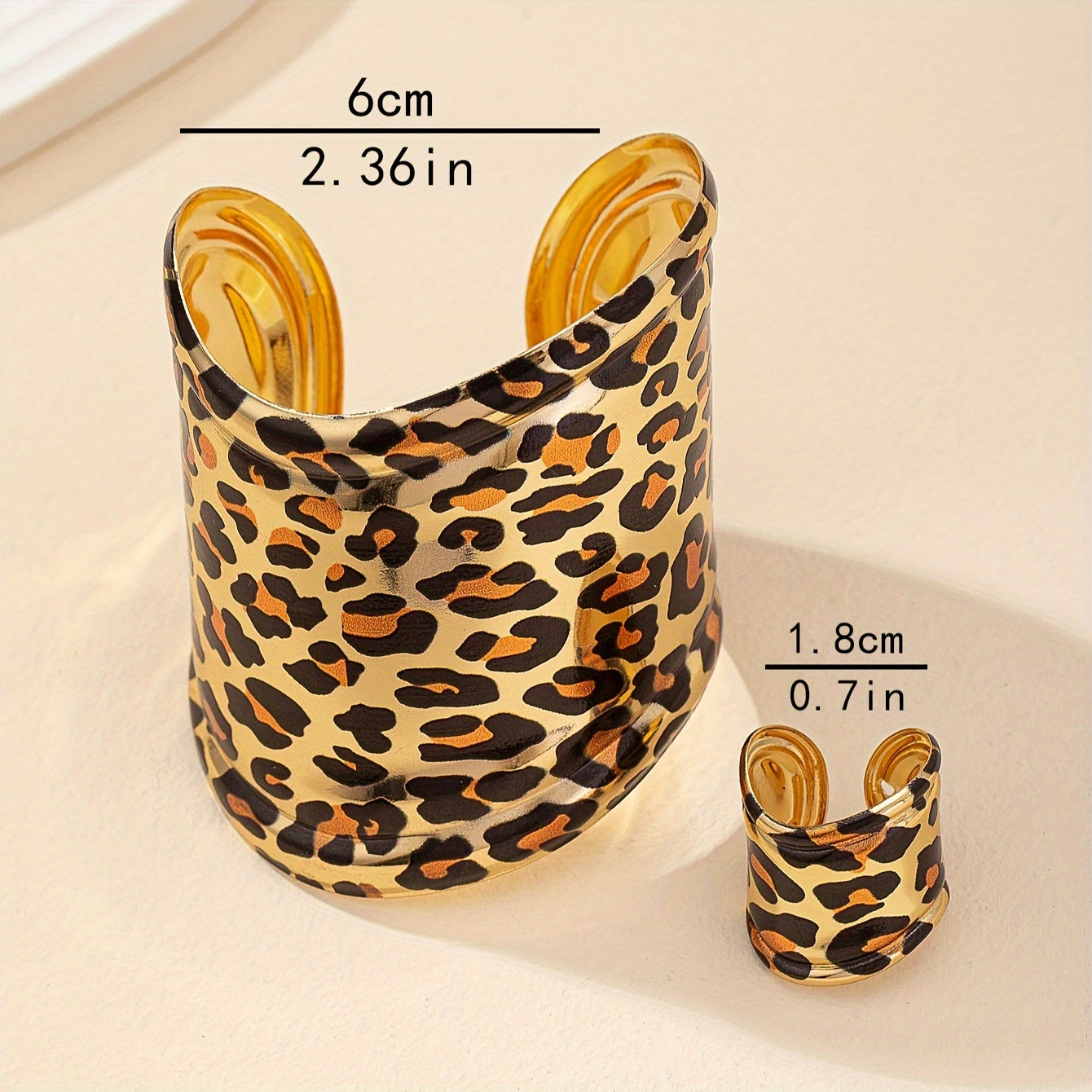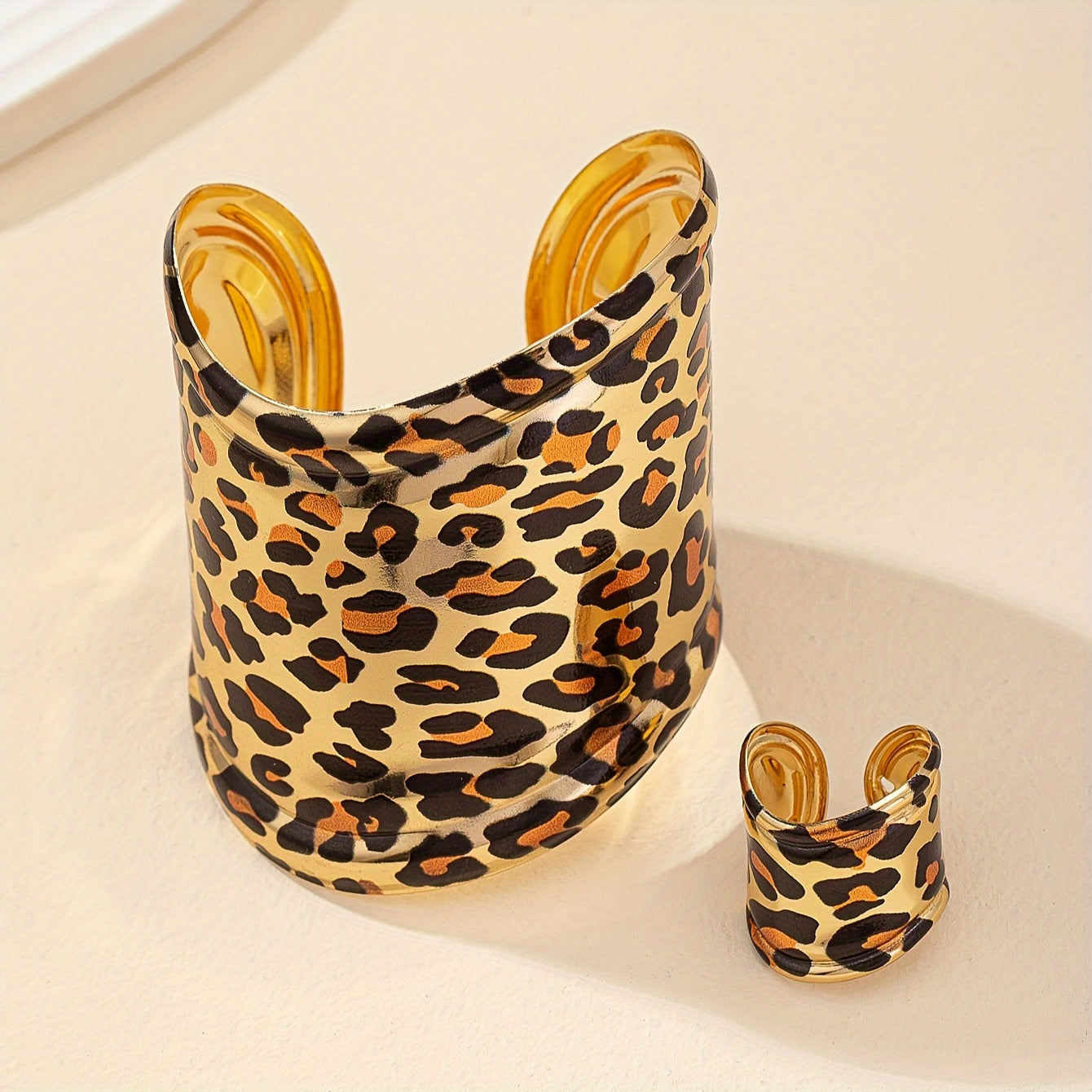 Leopard Print Metal Bracelet and Ring Set Adjustable Cuff Jewelry for Women