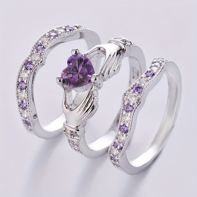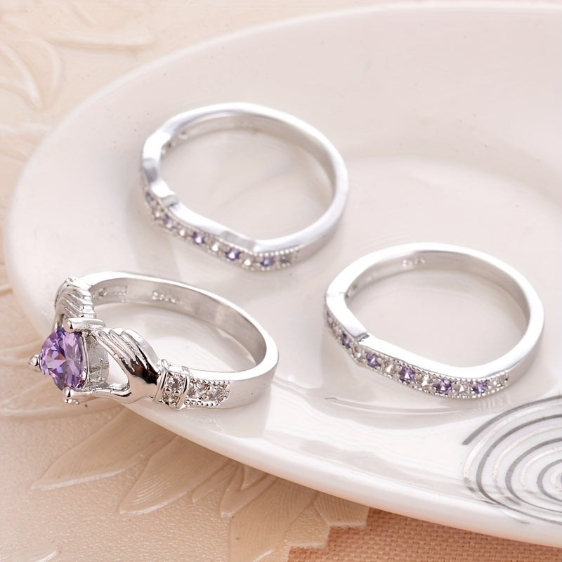 Elegant set of 3 rings featuring a hollow love gesture design with sparkling cubic zirconia. Perfect for promises, engagements, anniversaries, and weddings. Suitable for all seasons.