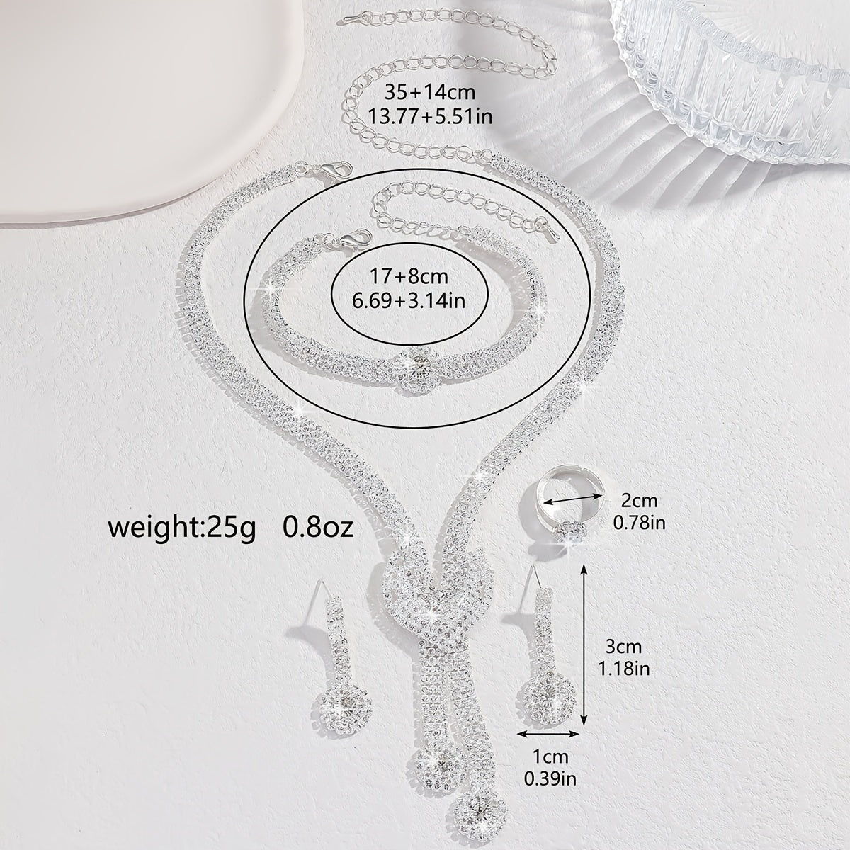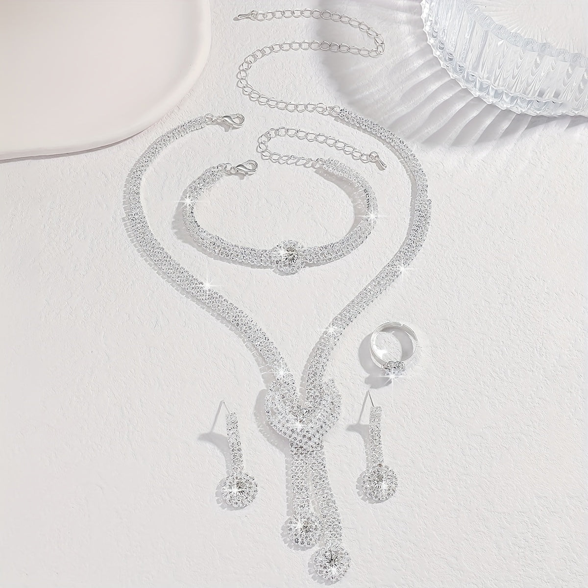 Complete your party look with this elegant jewelry set that includes a necklace, bracelet, ring, and earrings. Perfect for adding a touch of glamour to any outfit.