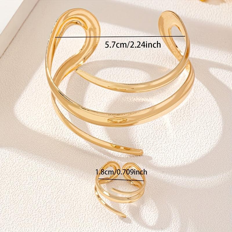 This 2pcs set features a minimalist design with an openwork bracelet and ring for women. It is perfect for casual attire and adds a touch of elegance to any outfit.