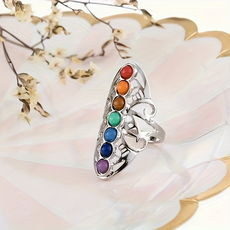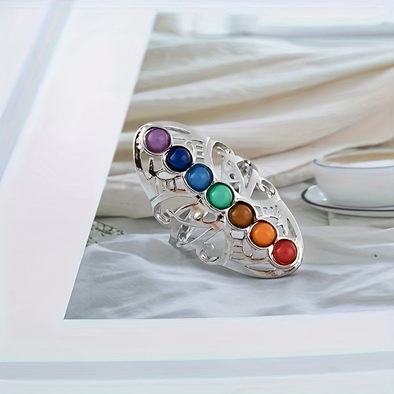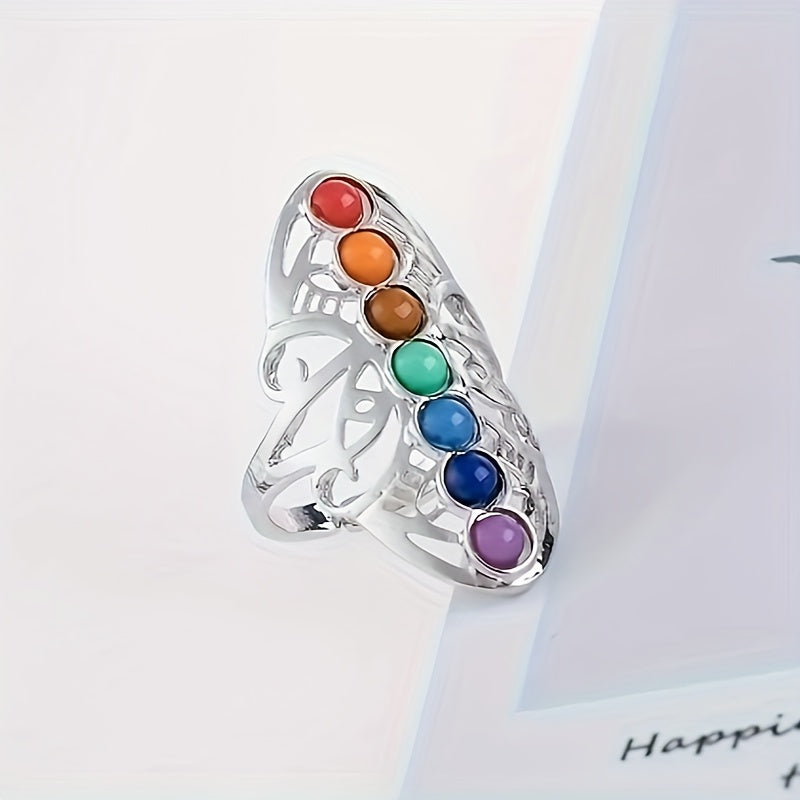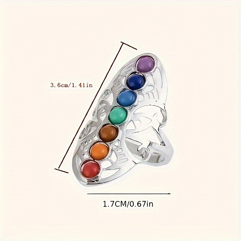 Add a touch of spiritual elegance to your hand with this stunning multicolor seven chakra gemstone ring. The silvery plated design makes it a stylish accessory.