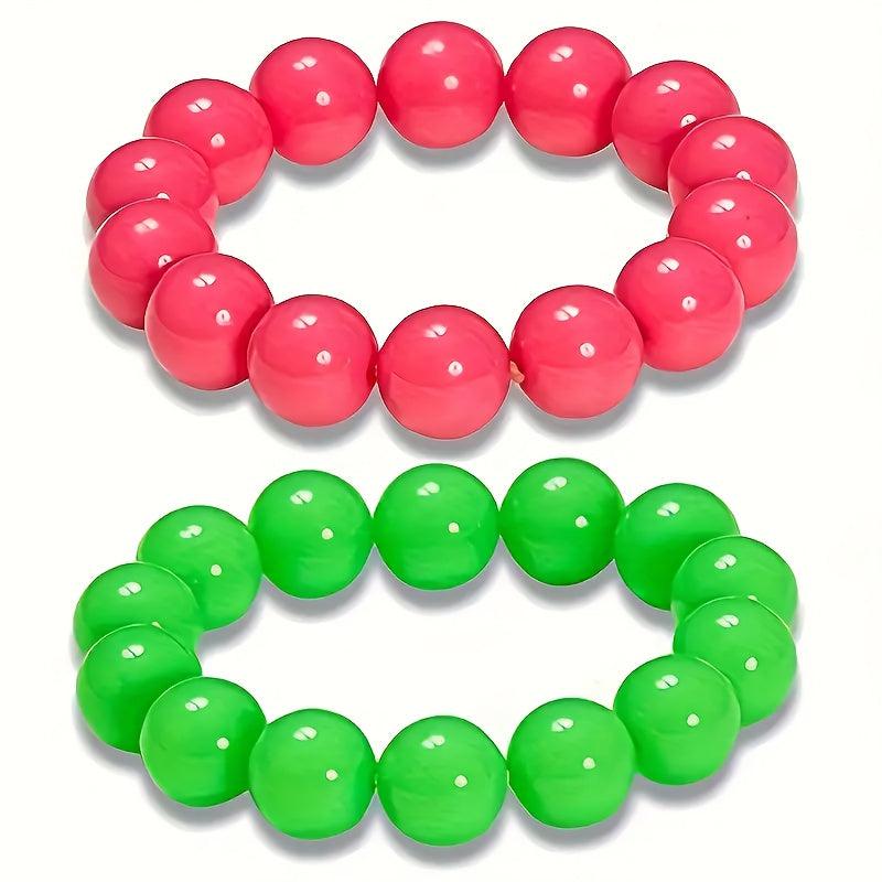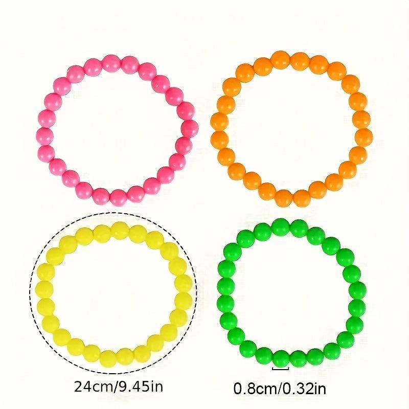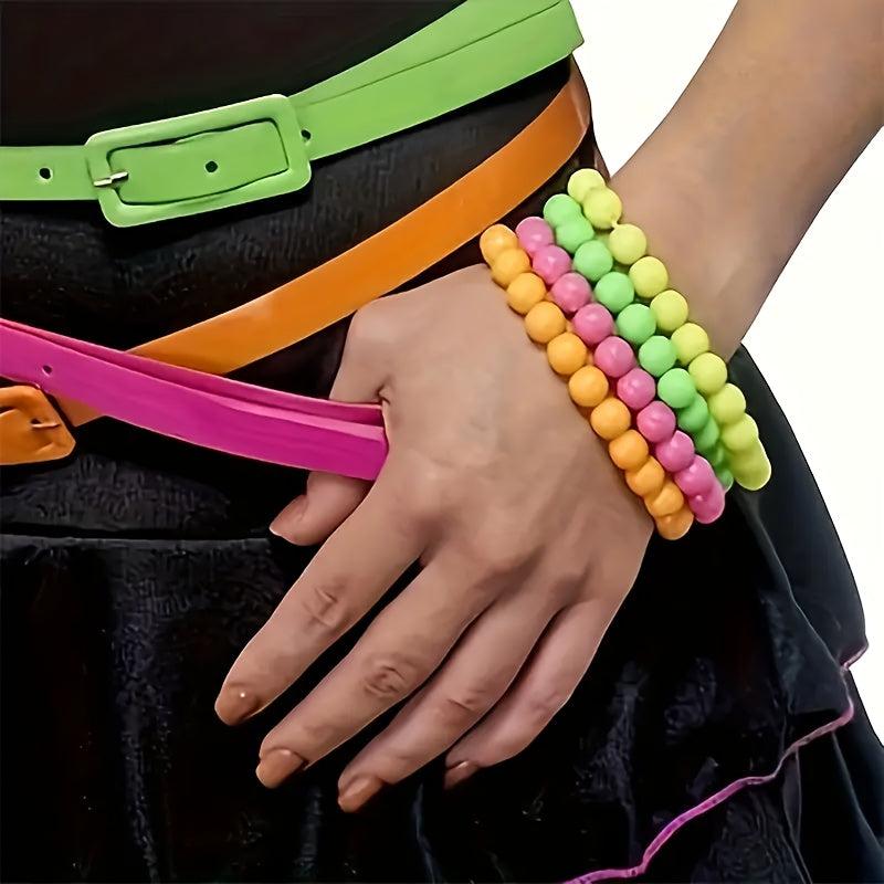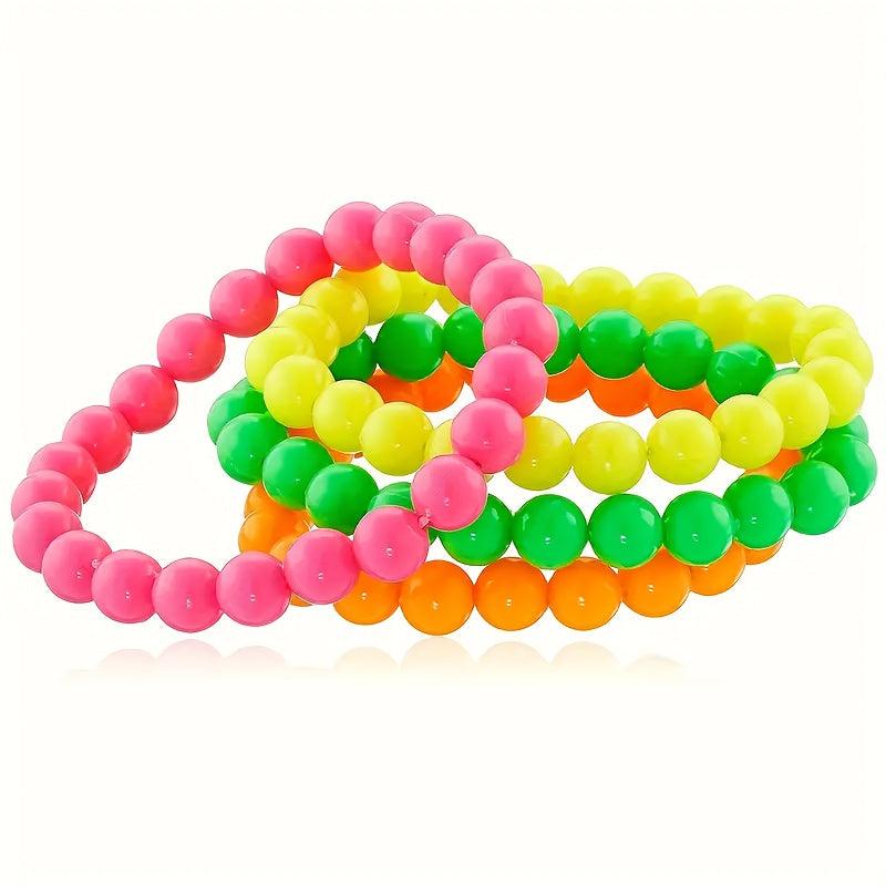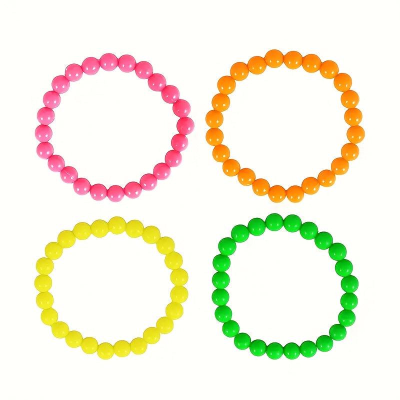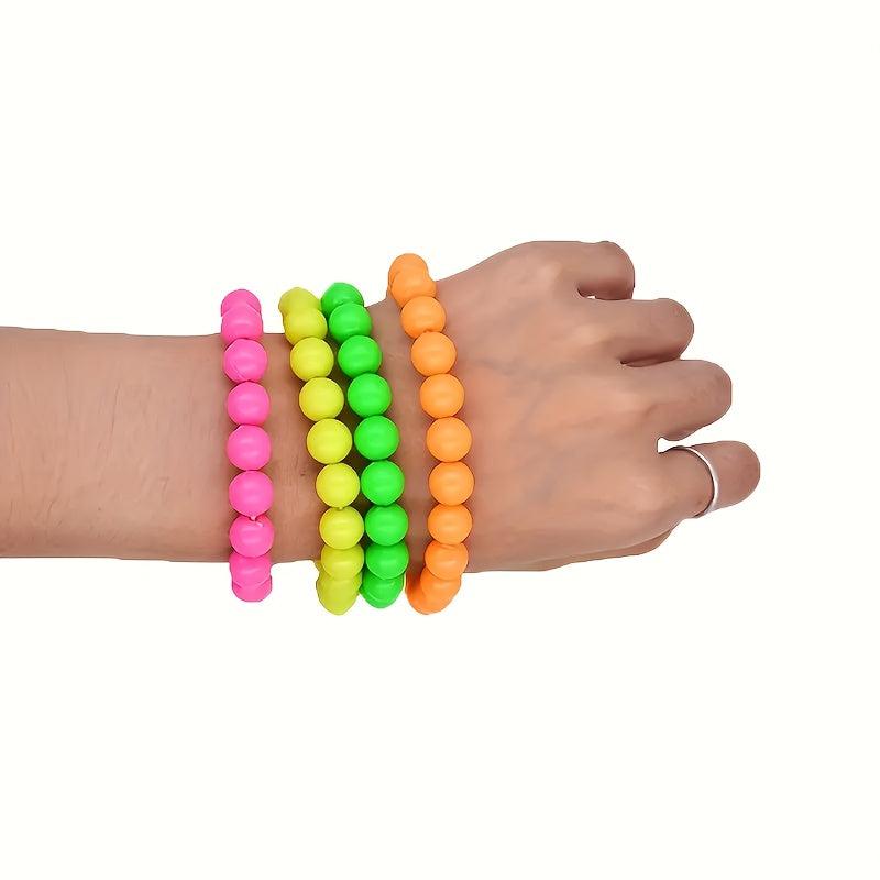 Add a pop of color to your outfit with this 4-piece neon plastic bead jewelry set. Perfect for parties, disco nights, singles parties, and more!