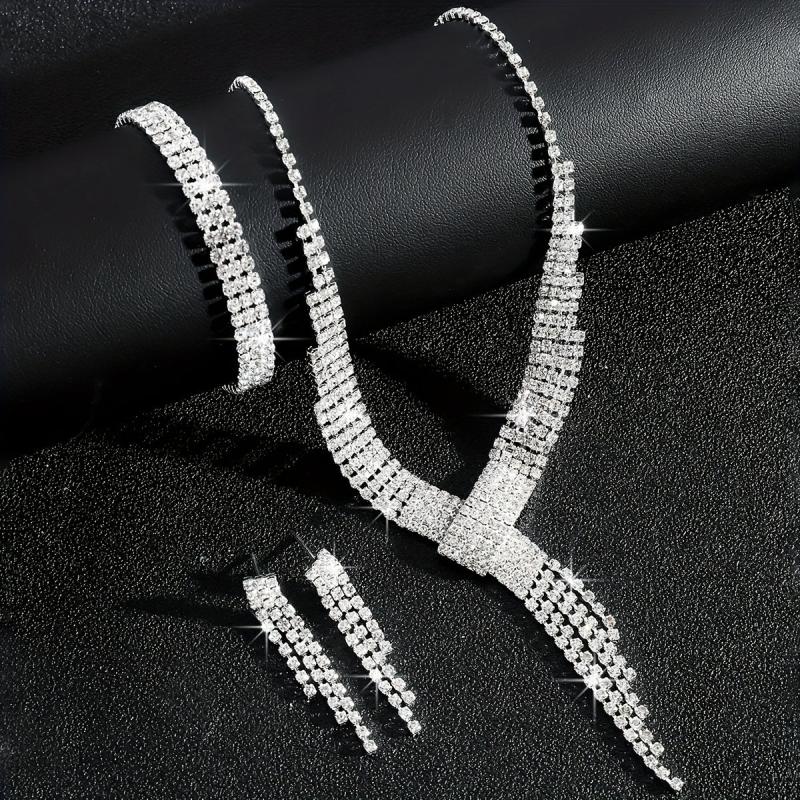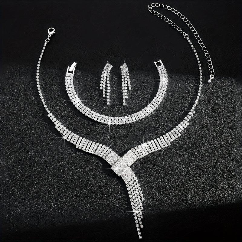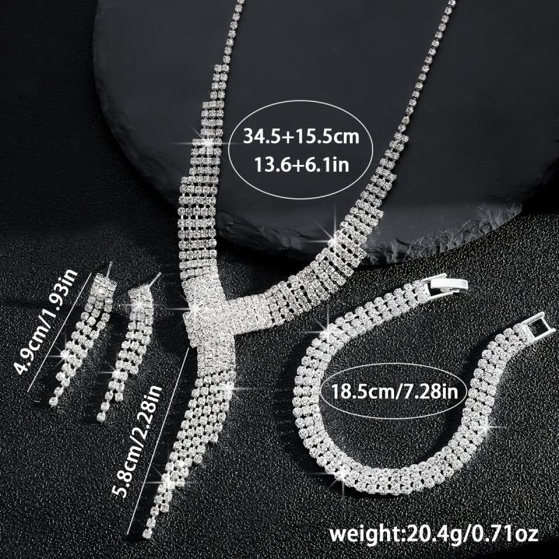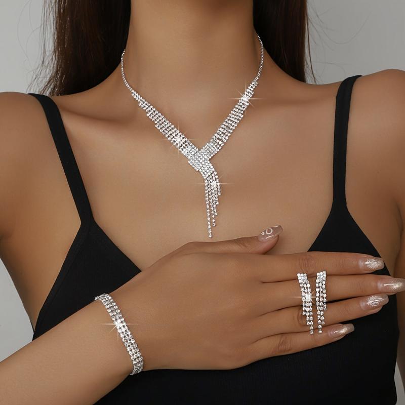 Complete your bridal look with this stunning tassel necklace, earrings, and bracelet combo. Crafted from platinum plated copper, this set is perfect for weddings and formal events.