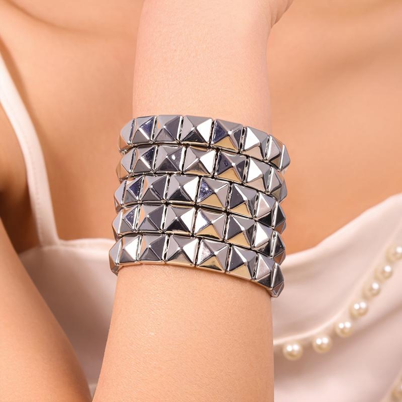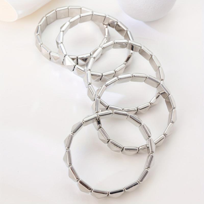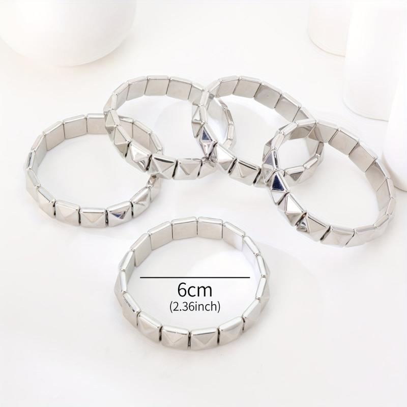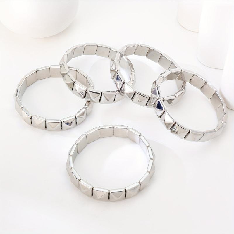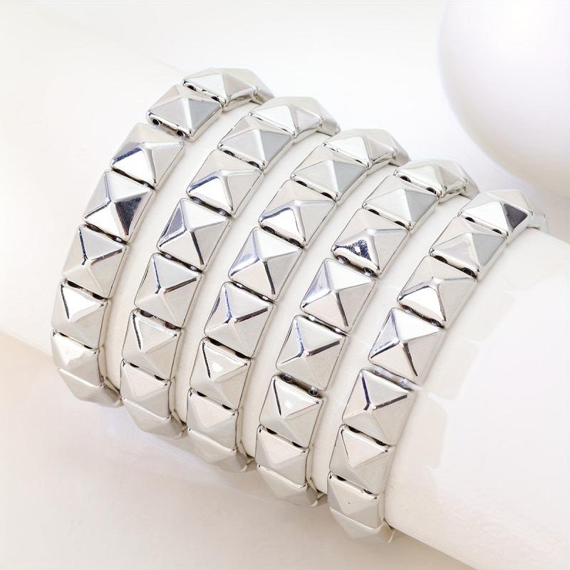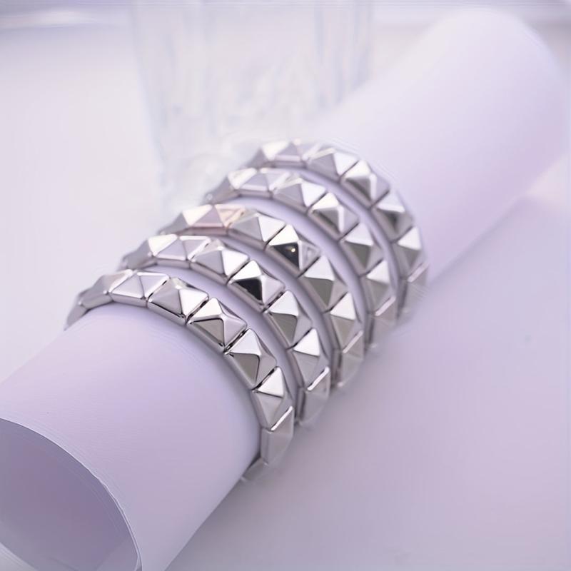 This set includes five punk-style square elastic bead bracelets, perfect for daily wear or parties. The bracelets feature a golden domineering rivet design.