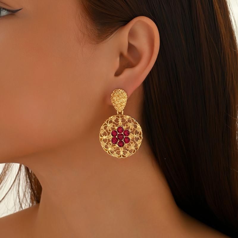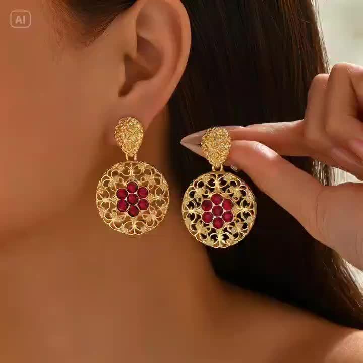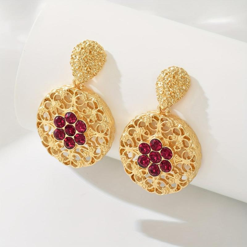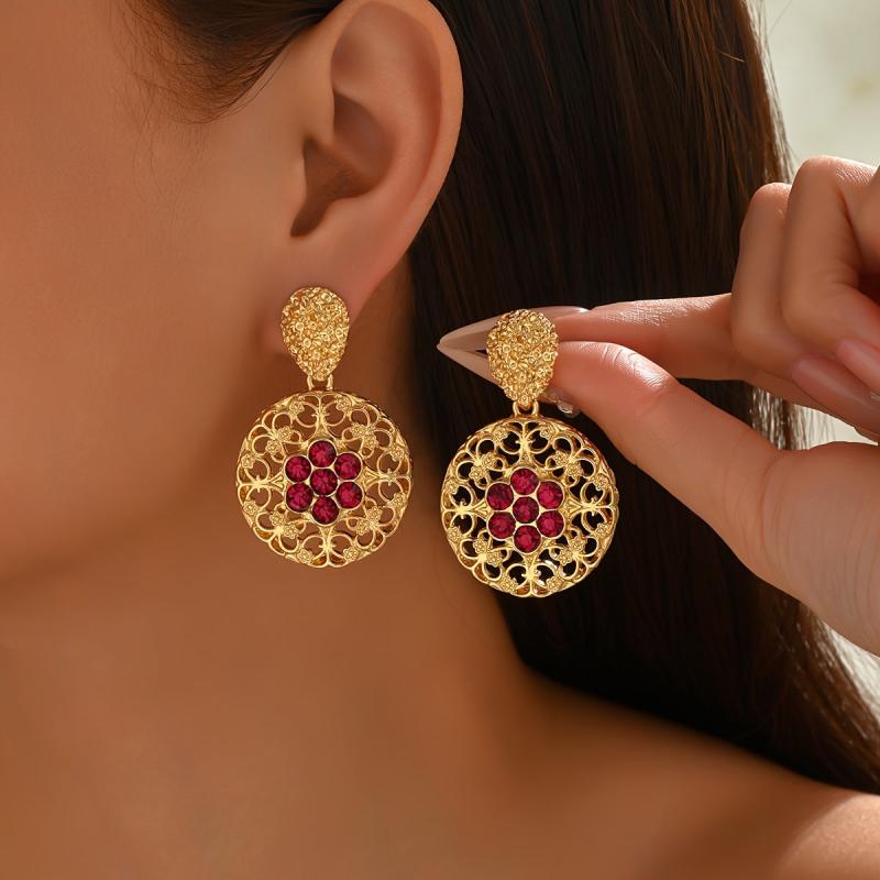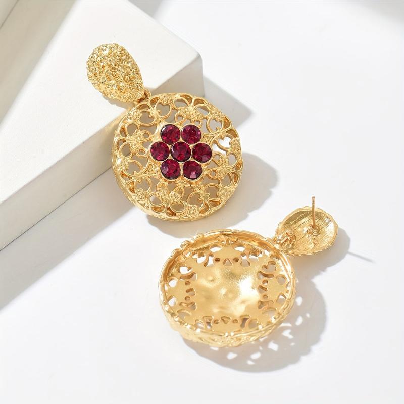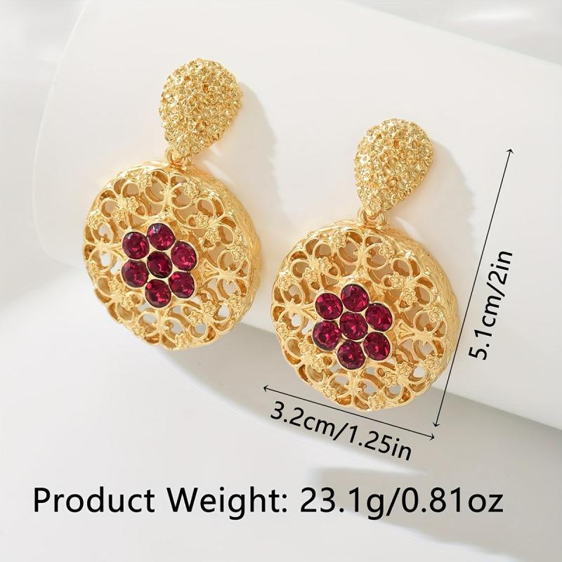 This modern jewelry set features a pair of light retro window stud earrings in a red Rhinestone design. The round palace necklace complements the earrings with its double circle hollowed out style.