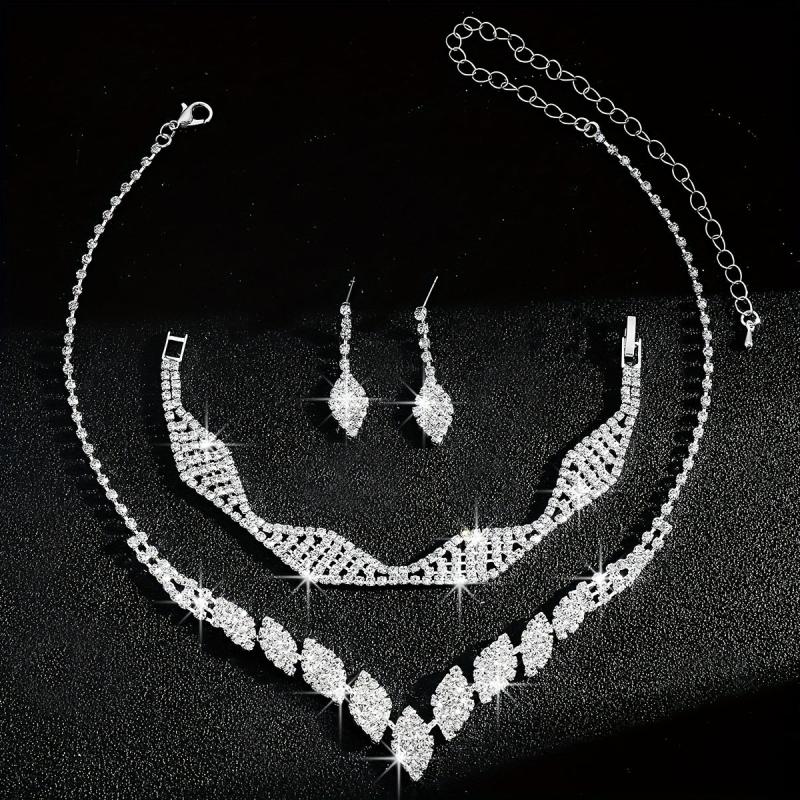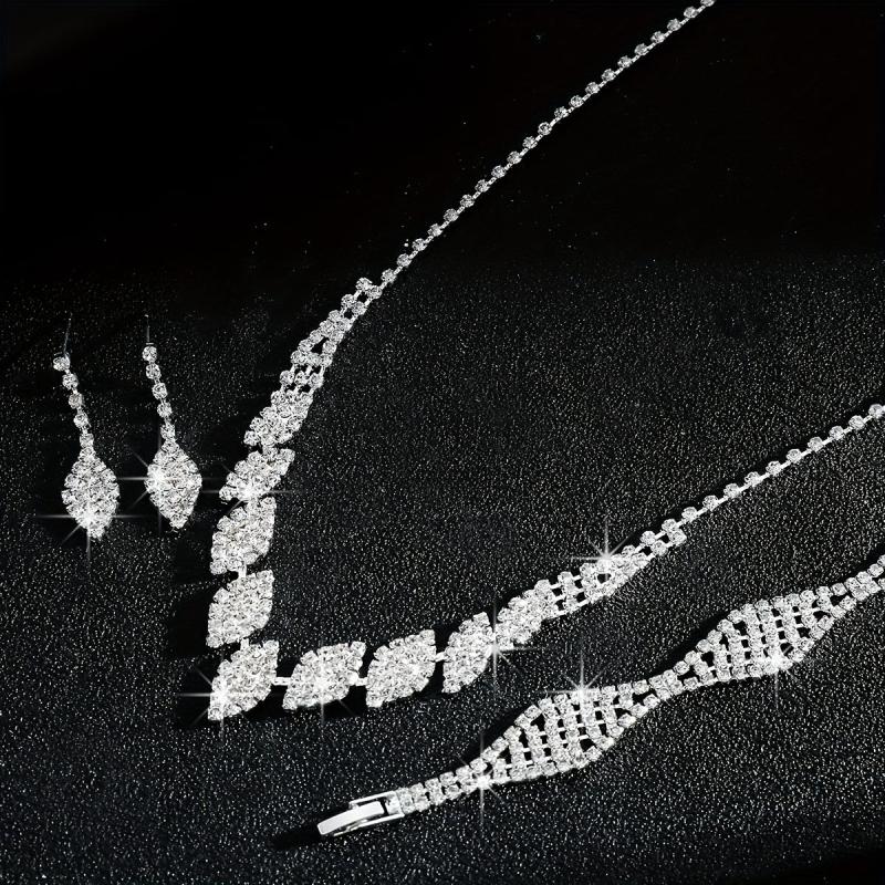 Complete your wedding or formal look with this stunning bridal jewelry set featuring a sparkling rhinestone leaf necklace, bracelet, and earrings. The set is copper-based and gold-plated, adding a touch of elegance to your ensemble.