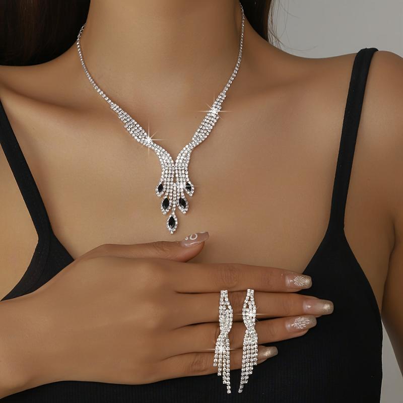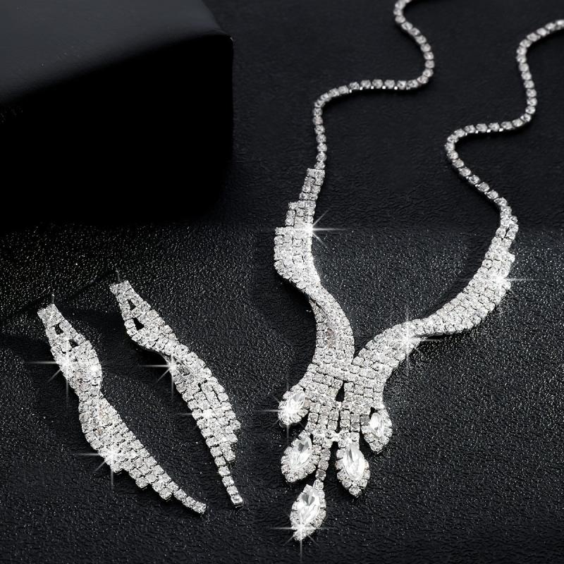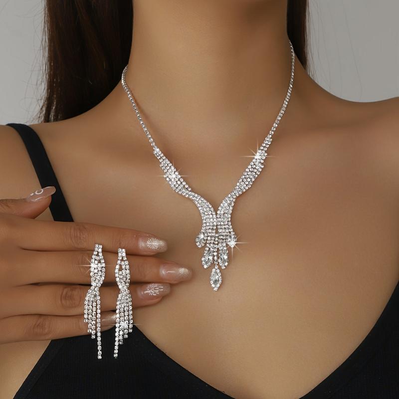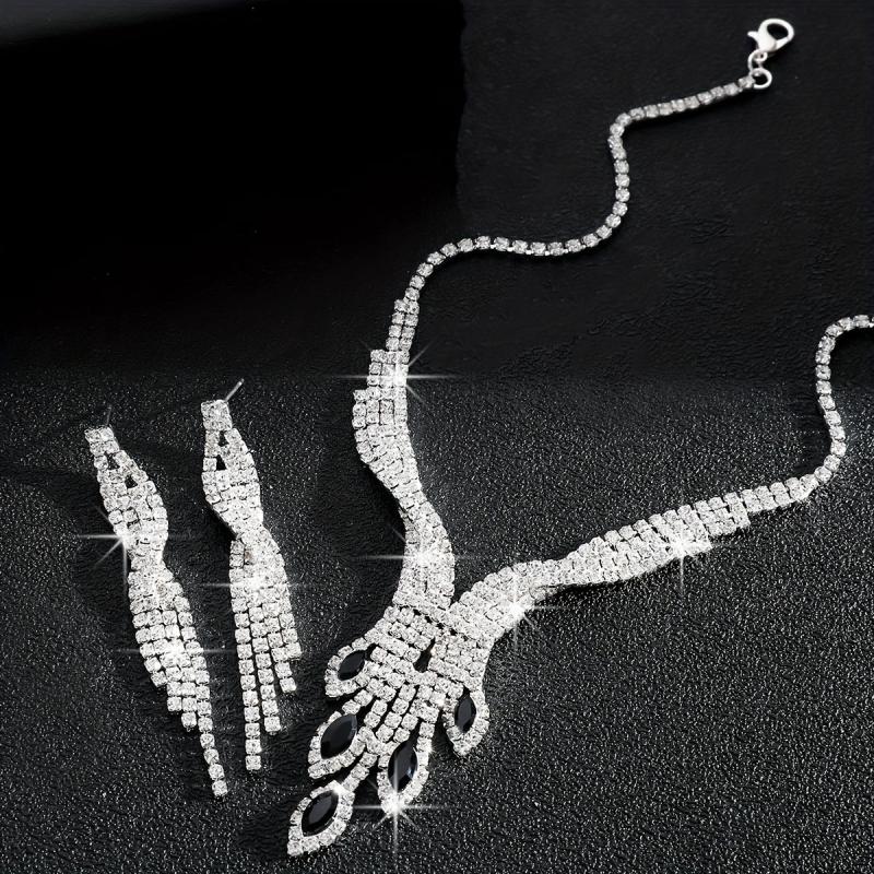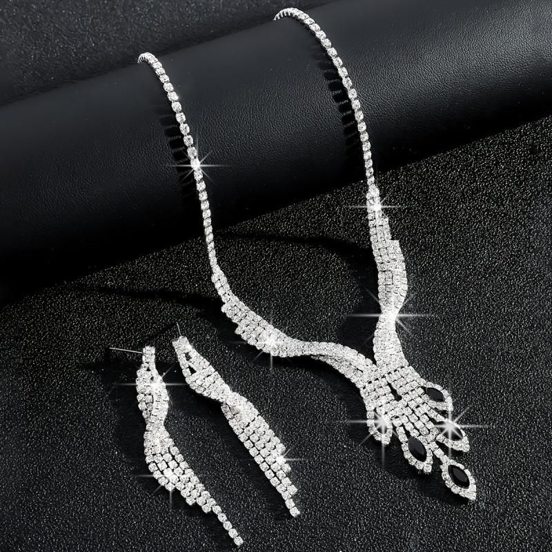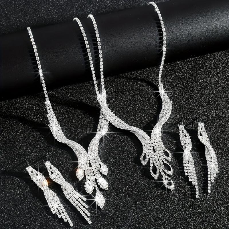 Rhinestone Tassel Necklace Set Copper Plated Bridal Jewelry