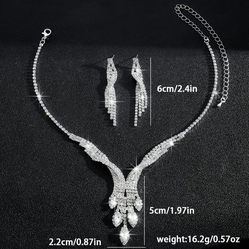 Enhance your bridal look with this stunning sparkling rhinestone tassel necklace and earring set in copper plating. Perfect for weddings and special occasions.
