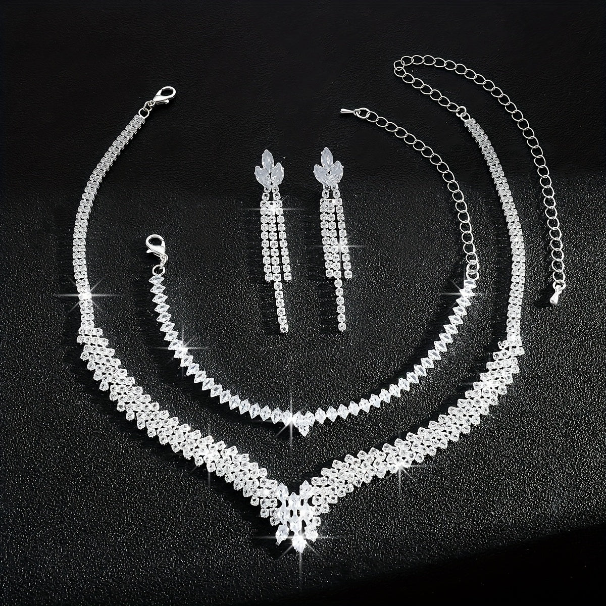 Complete your look with this stunning jewelry set that includes a necklace, bracelet, and earrings. Ideal for weddings and formal events, this set features a V-shaped design with dripping rhinestones and a golden plated finish.
