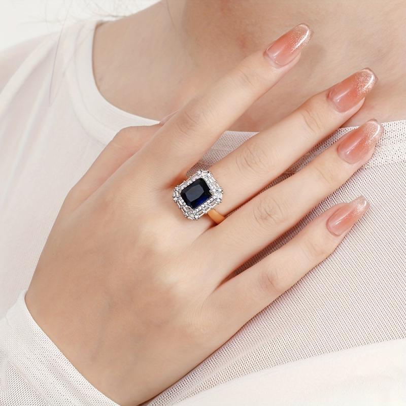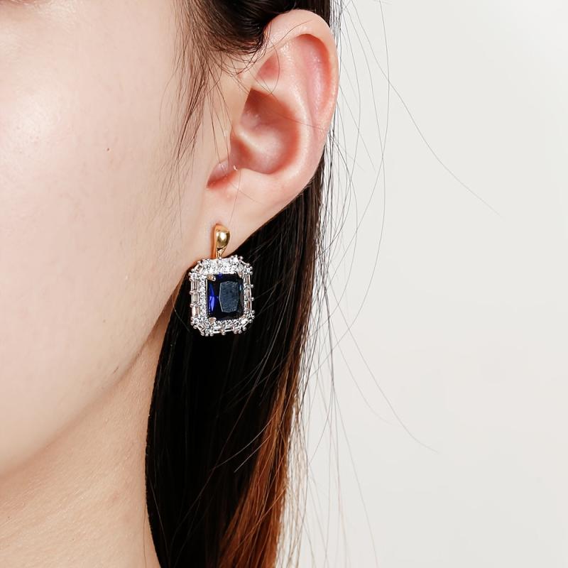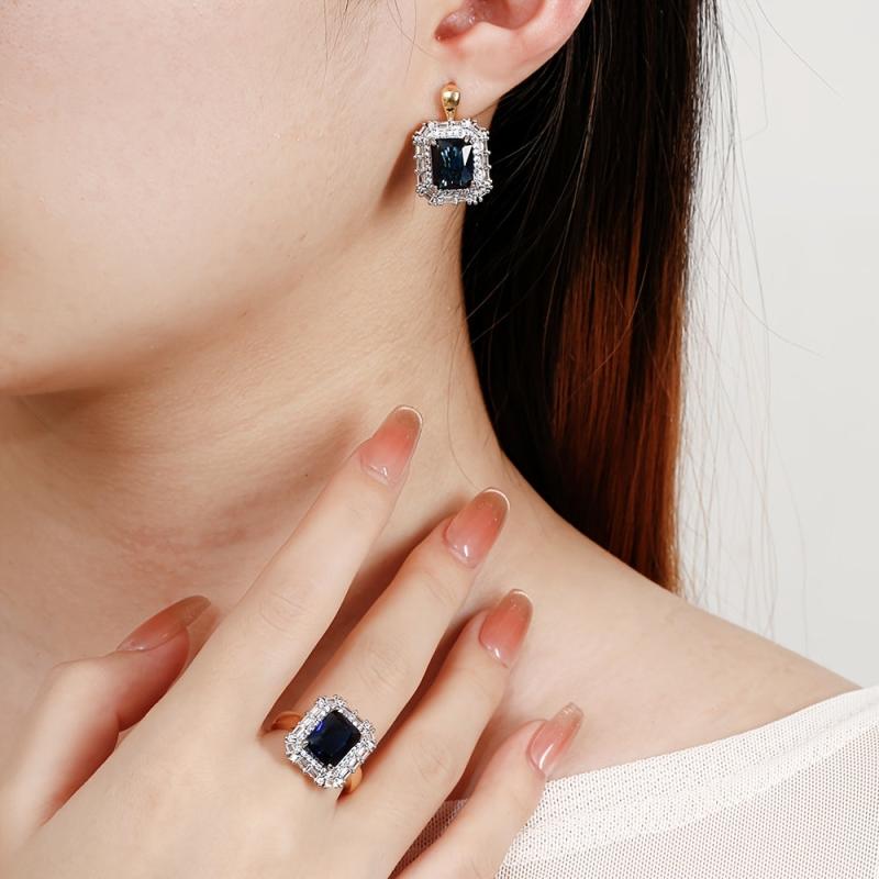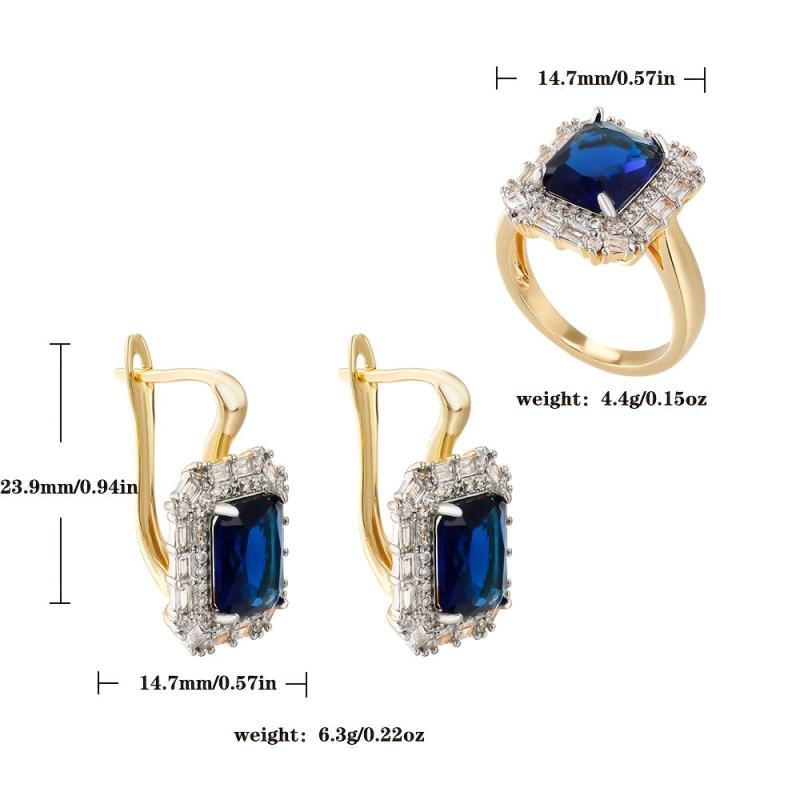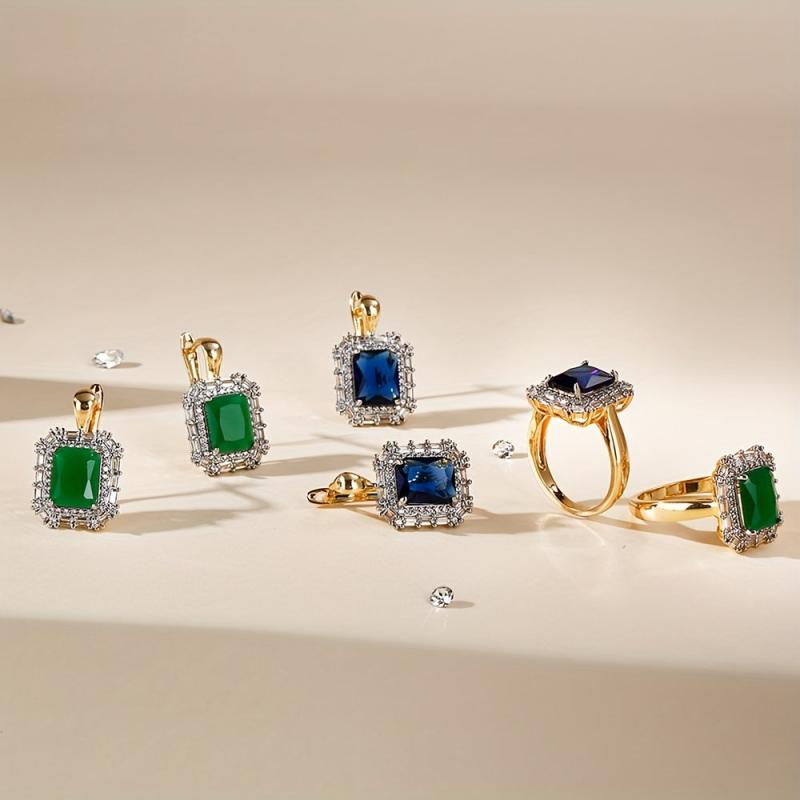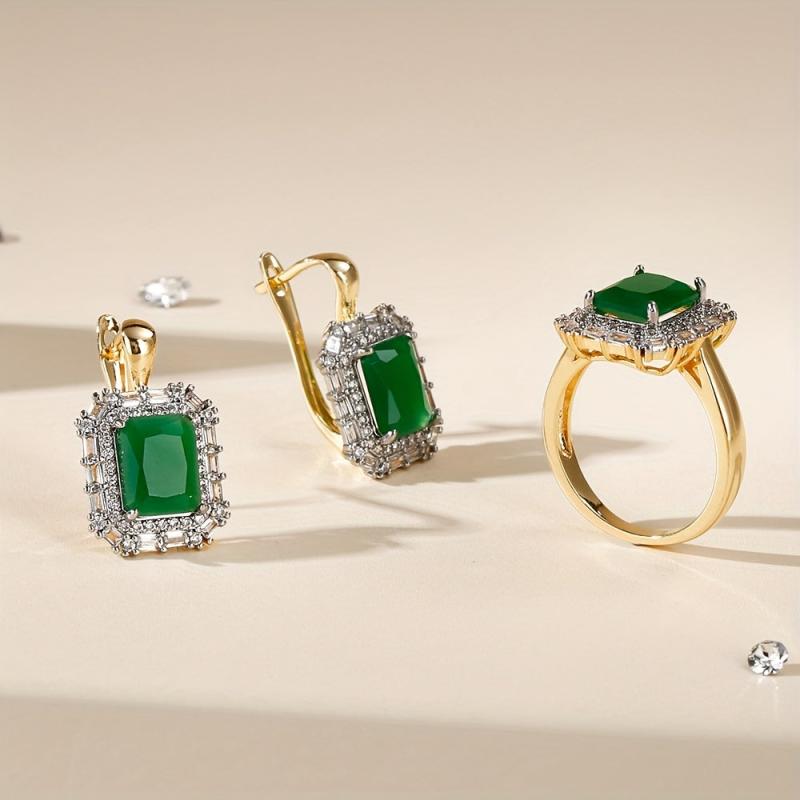 Square Zirconia Earrings & Rings Set, 14K Golden Plated Women&