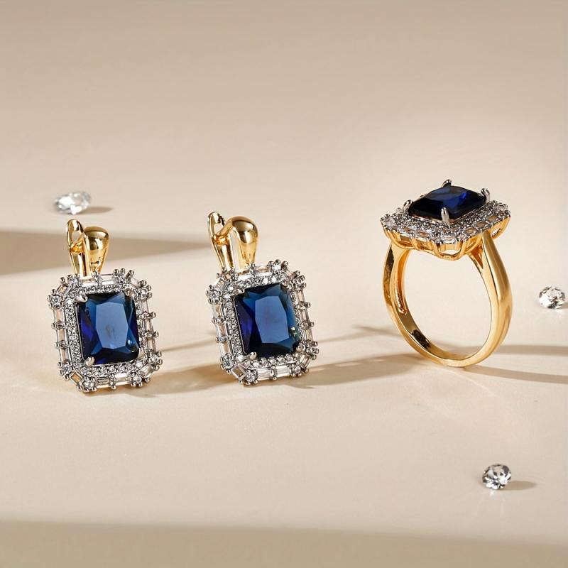Square Zirconia Earrings & Rings Set, 14K Golden Plated Women's Jewelry