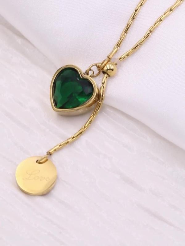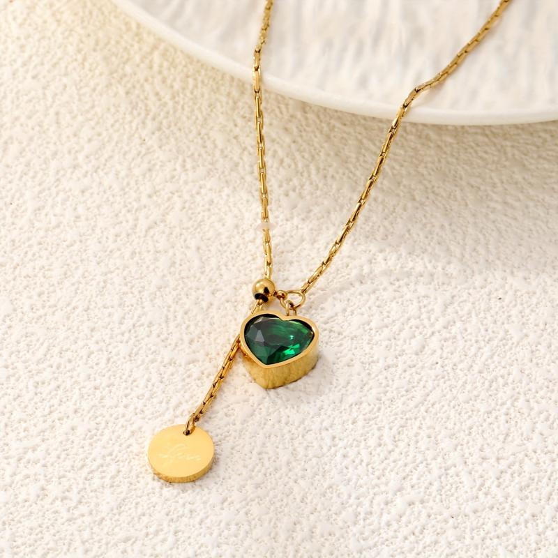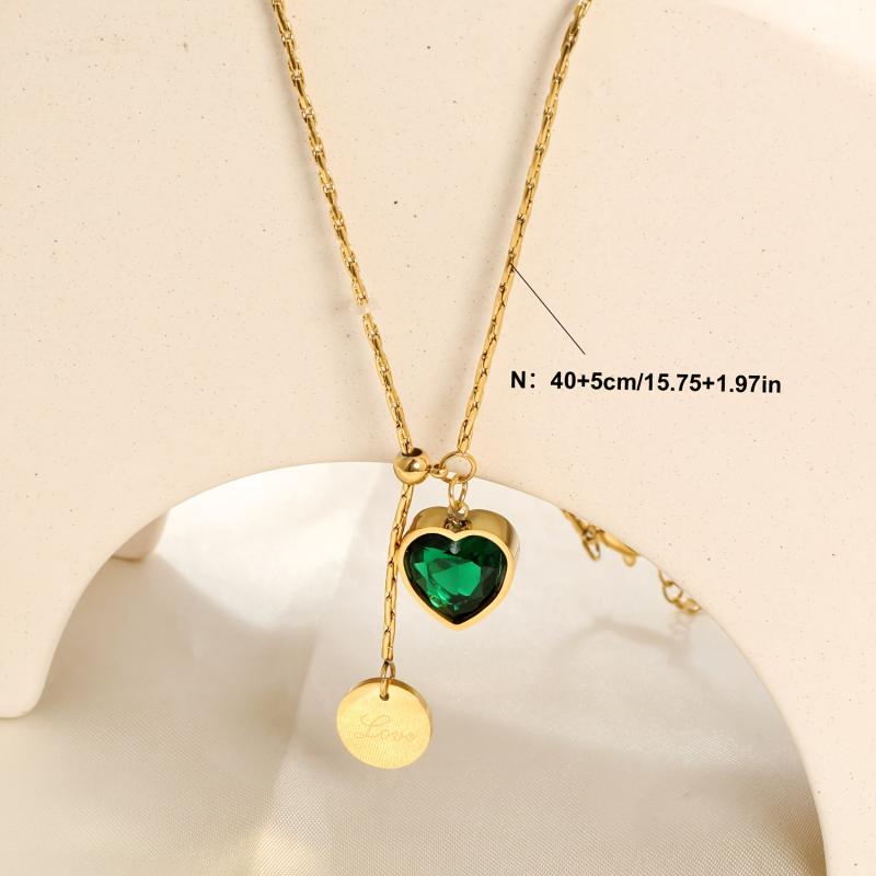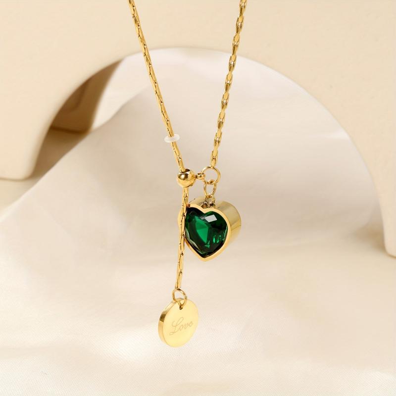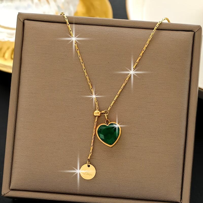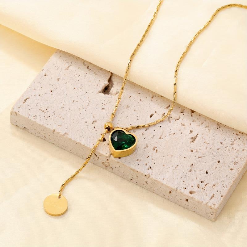 This necklace features a unique design with synthetic zirconia green diamonds in the heart, making it a beautiful accessory. The chain is adjustable for a customized fit.