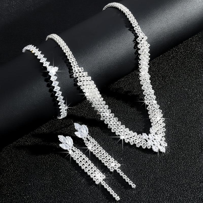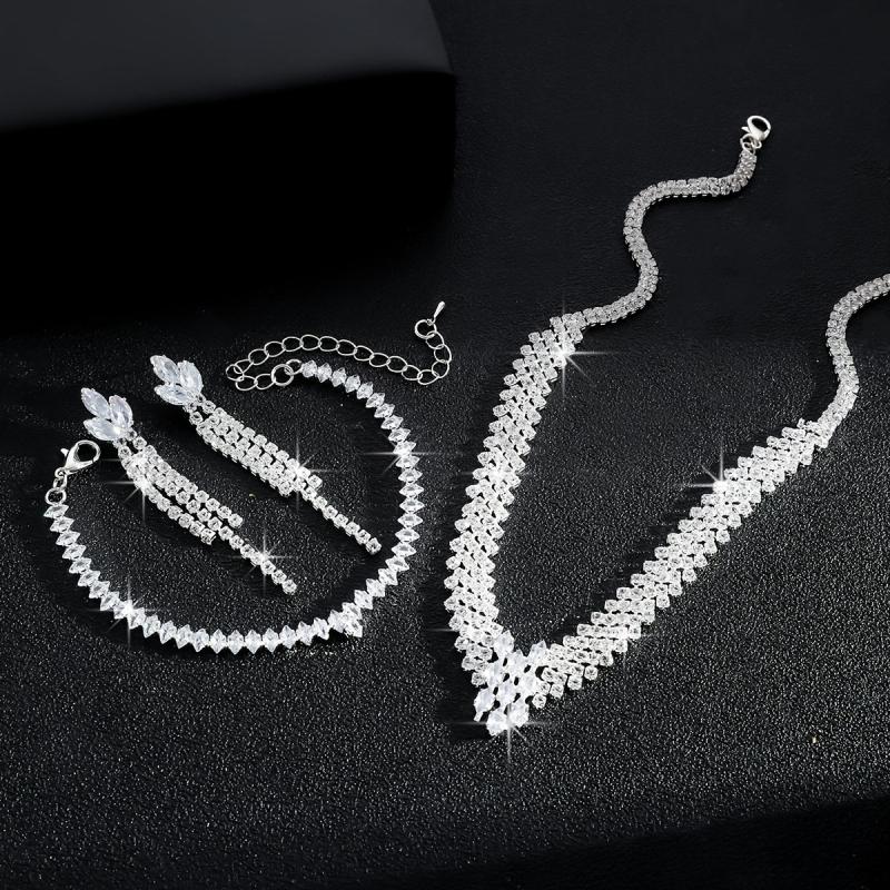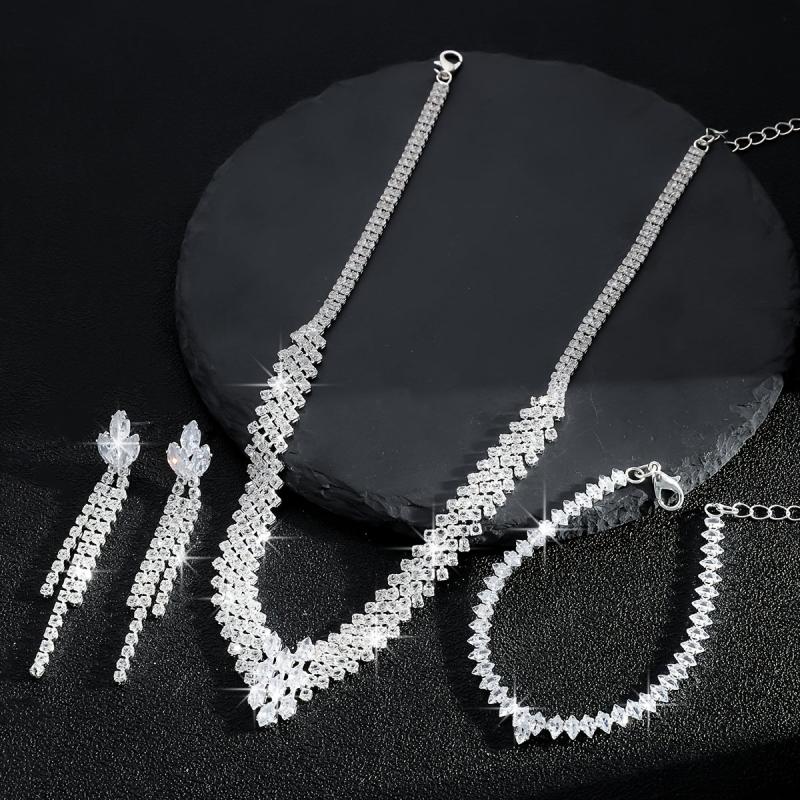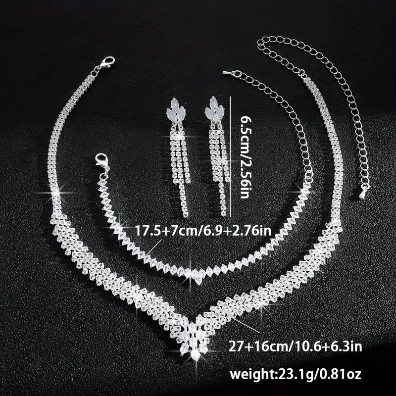 This stunning bridal jewelry set features a sparkling V-shaped necklace, earrings, and bracelet combo. Made with rhinestones on a copper base with golden plating, it is perfect for weddings and formal events.