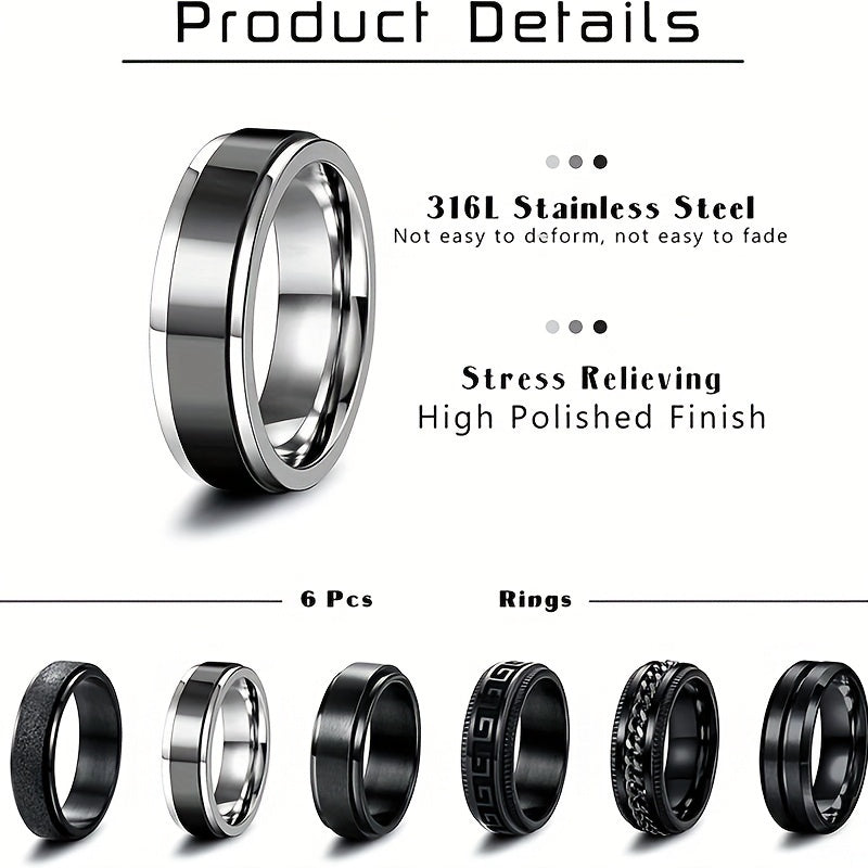 This set includes 6 durable stainless steel fidget rings designed for both men and women. These spinning band rings offer anxiety relief and a casual style.