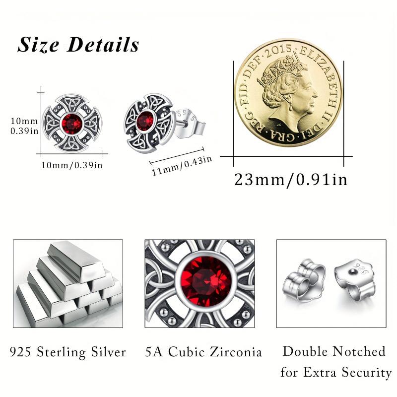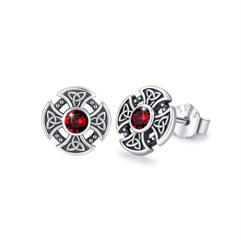 Elegant Celtic cross stud earrings made of sterling silver featuring red synthetic zirconia. Perfect for men and teenage sons.