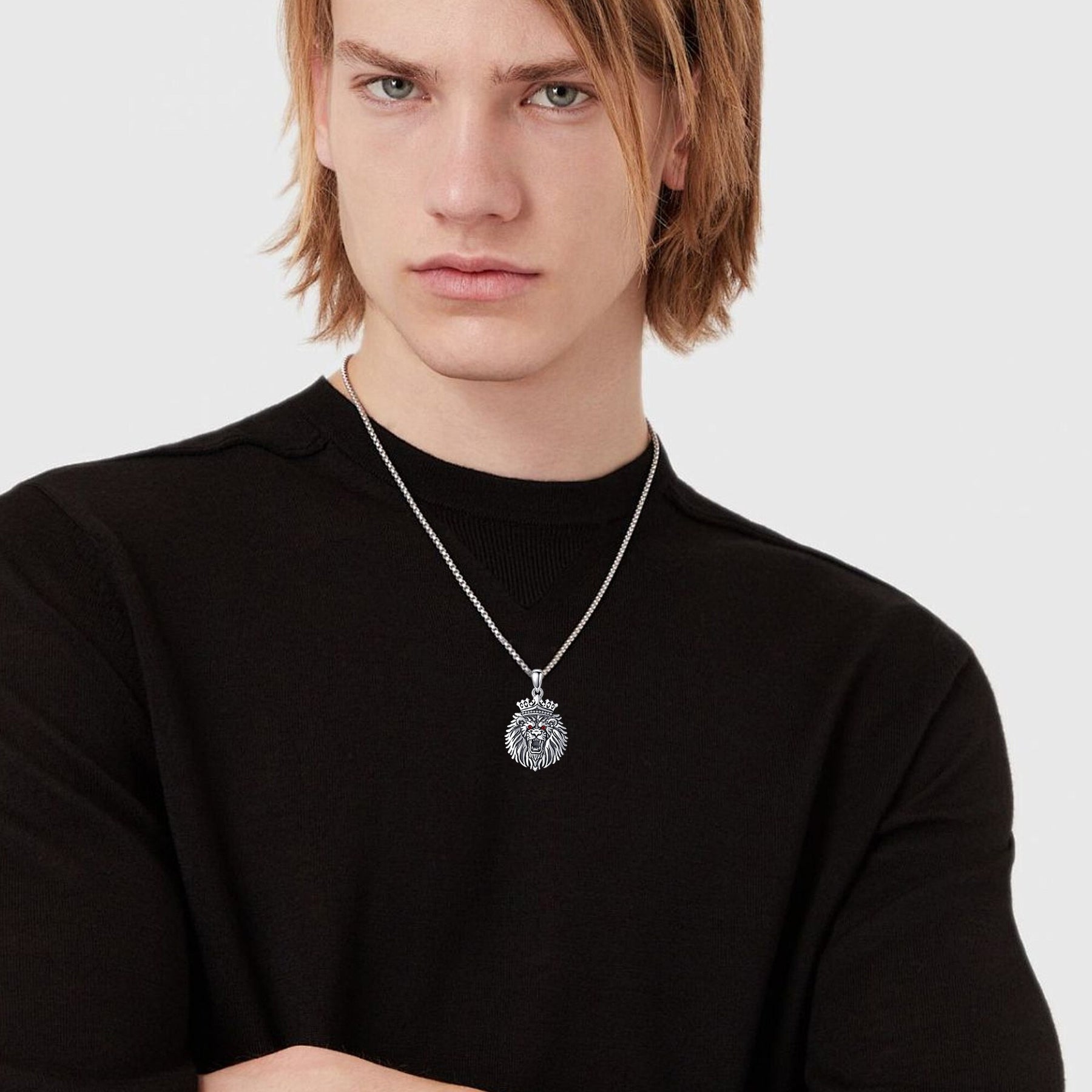 925 Silver Lion Head Necklace with Crown Pendant Men&