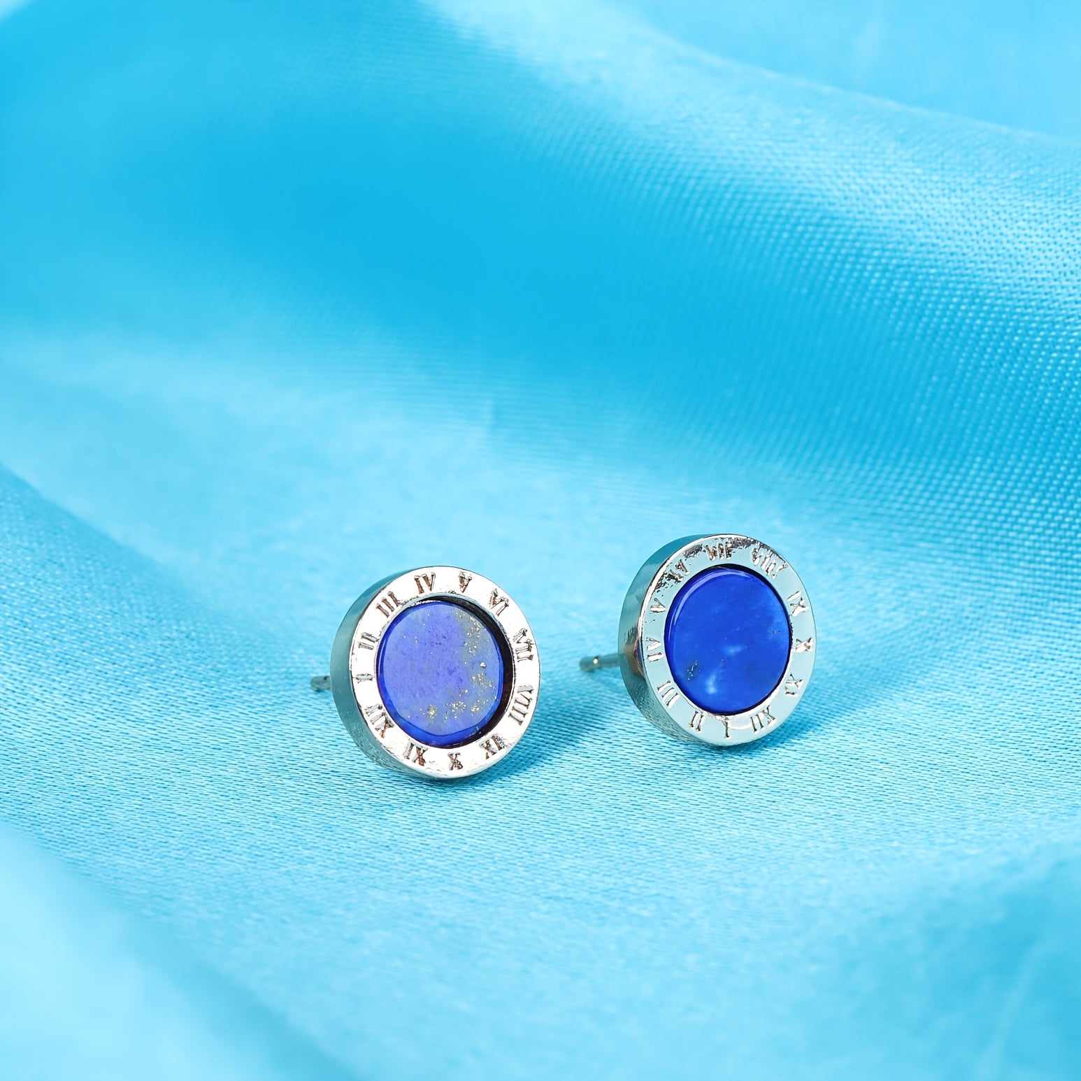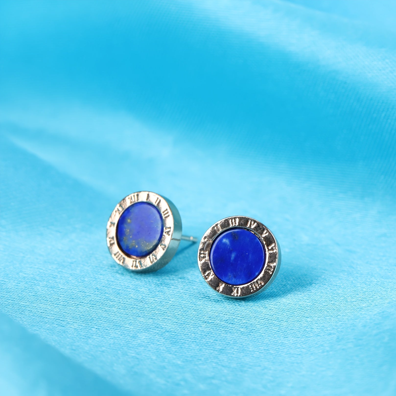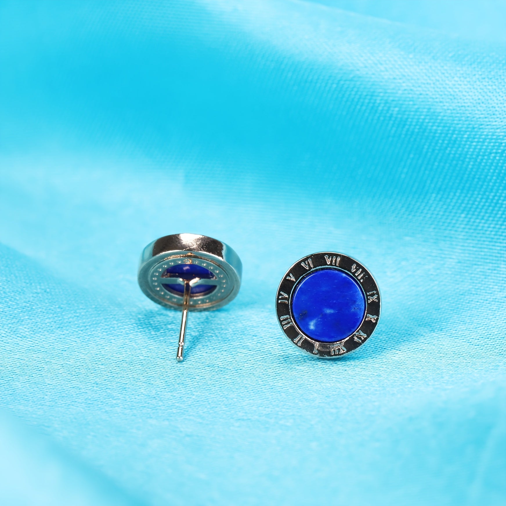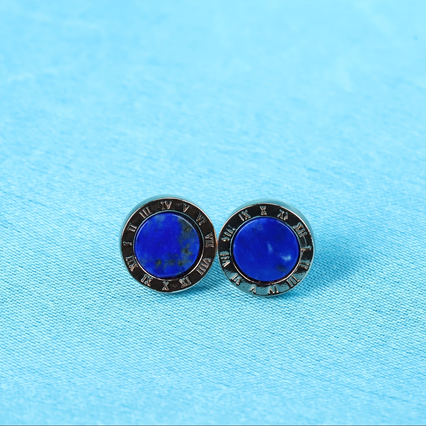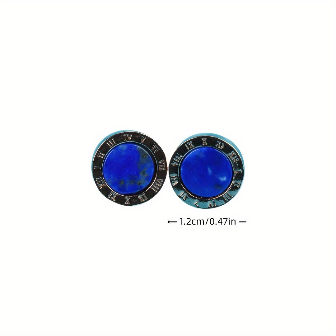 Handcrafted natural Afghan Lapis Lazuli stud earrings featuring Roman numerals. Perfect holiday gift for men's accessories, classic stud earrings for daily wear.