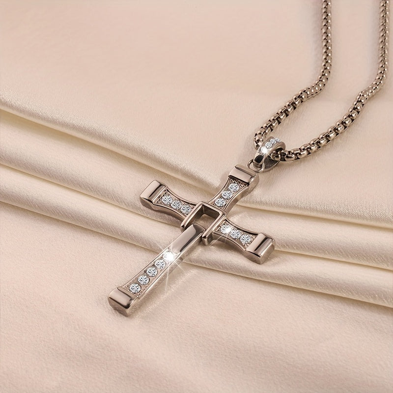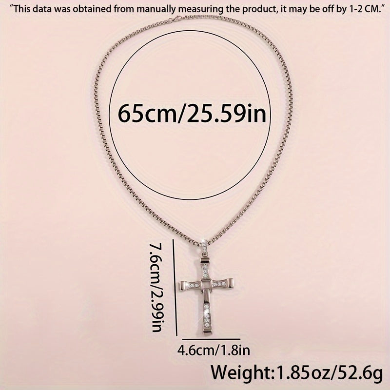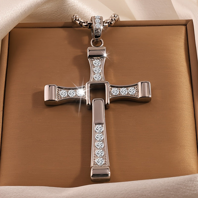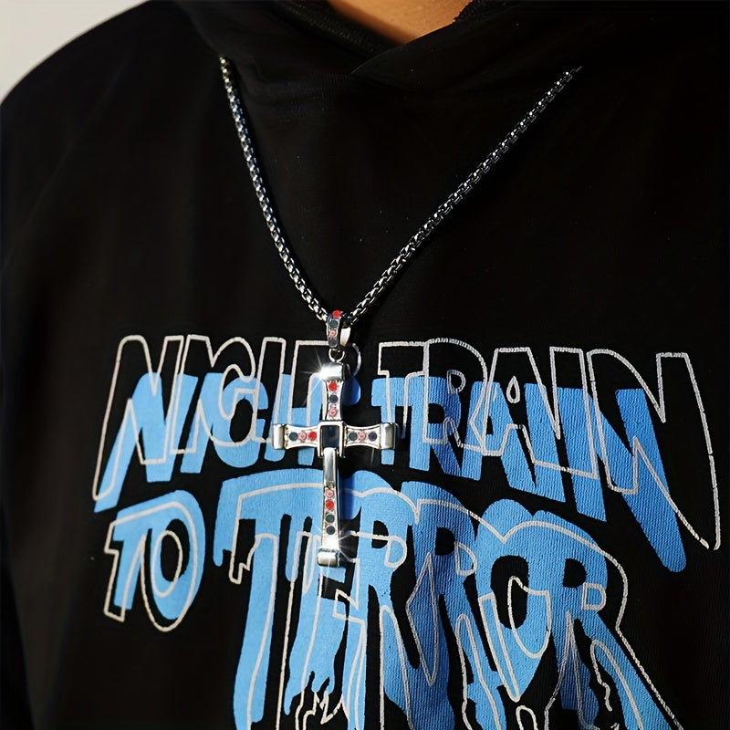 Stainless steel hip hop cross pendant necklace with cubic zirconia accents, edgy design suitable for casual or streetwear fashion.