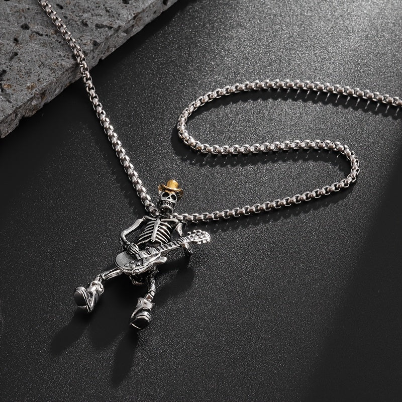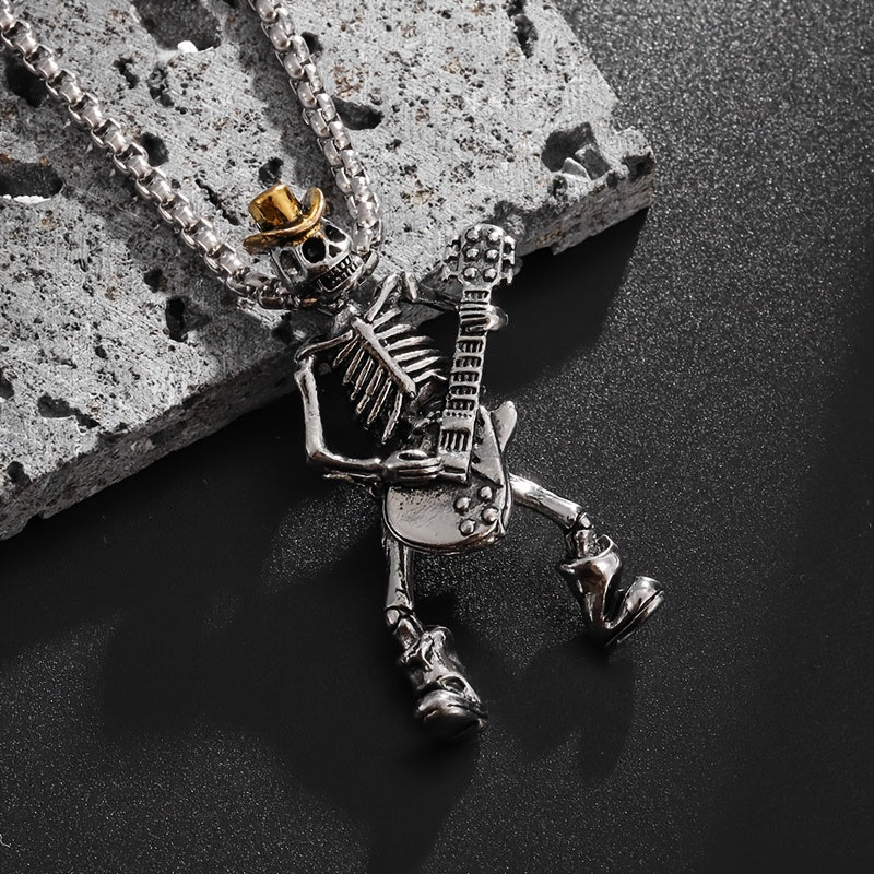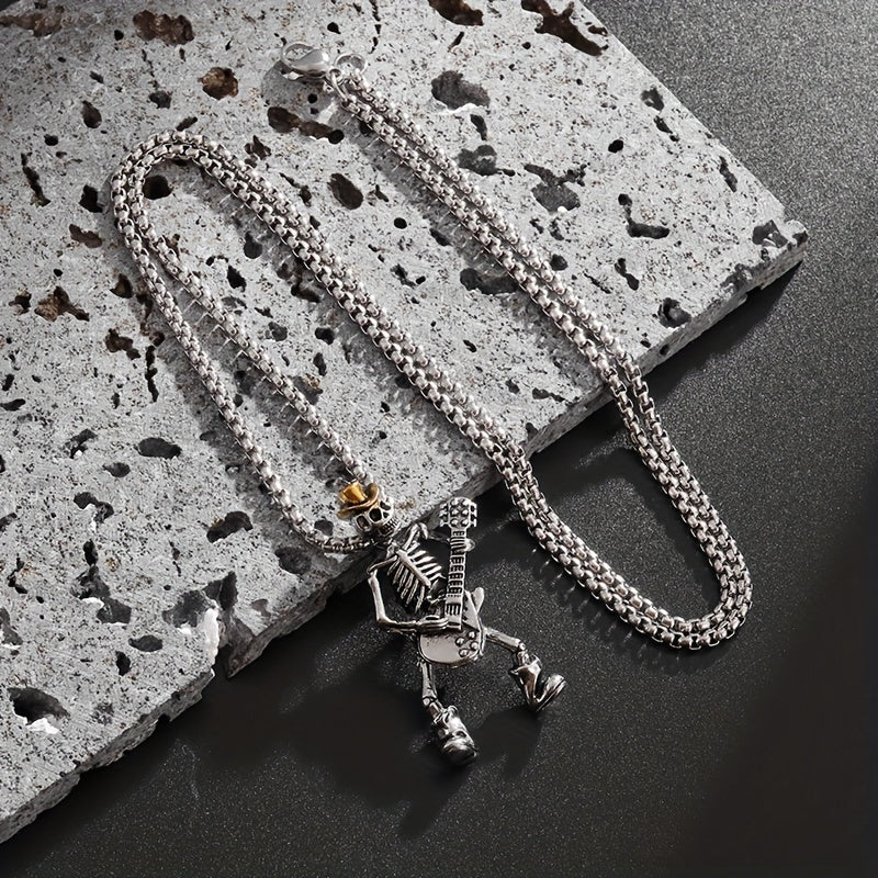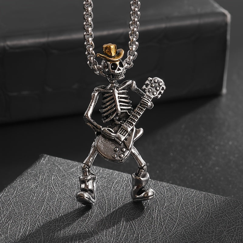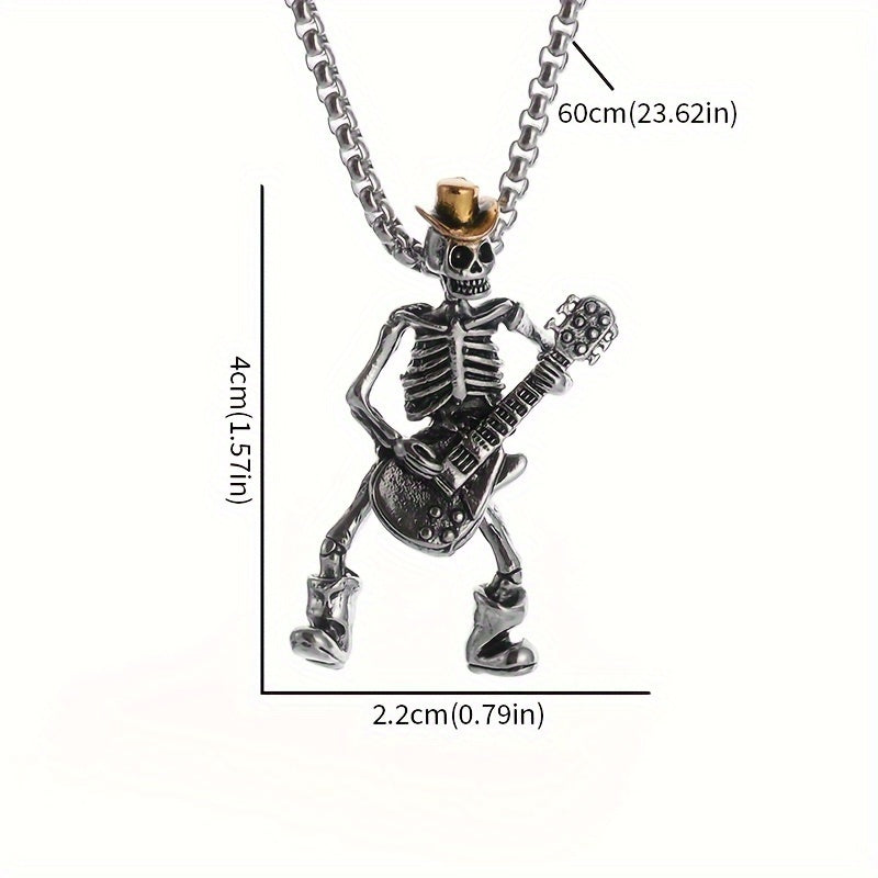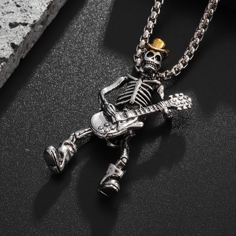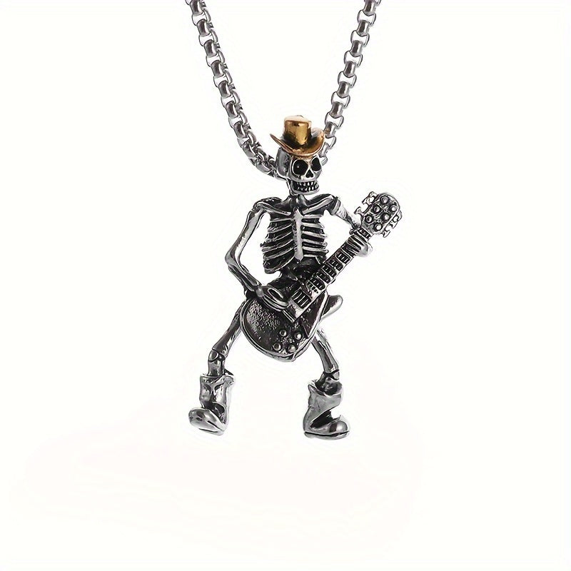 This unique necklace features a gothic skeleton guitarist design perfect for punk, hip hop, rock, street dance, and Halloween parties.