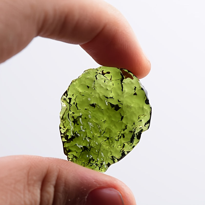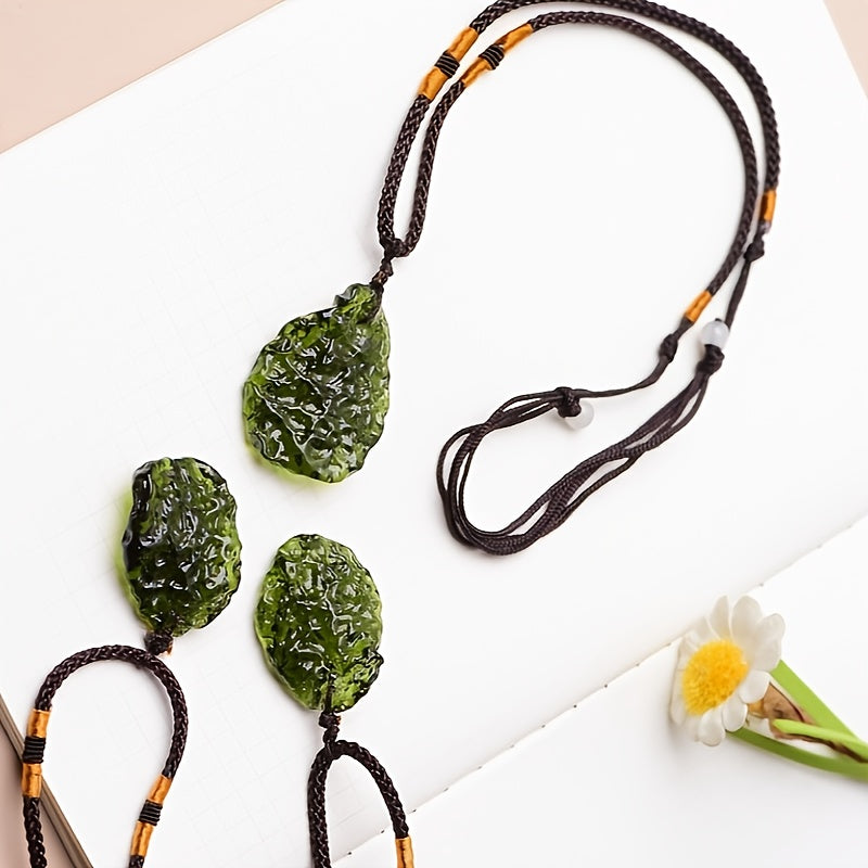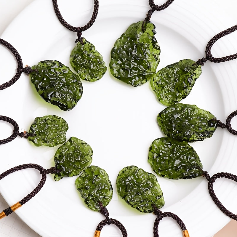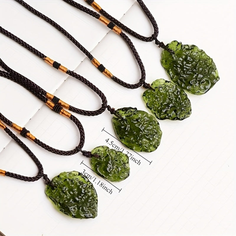 This unique pendant features a raw Czech meteorite green glass stone, perfect for both men and women.