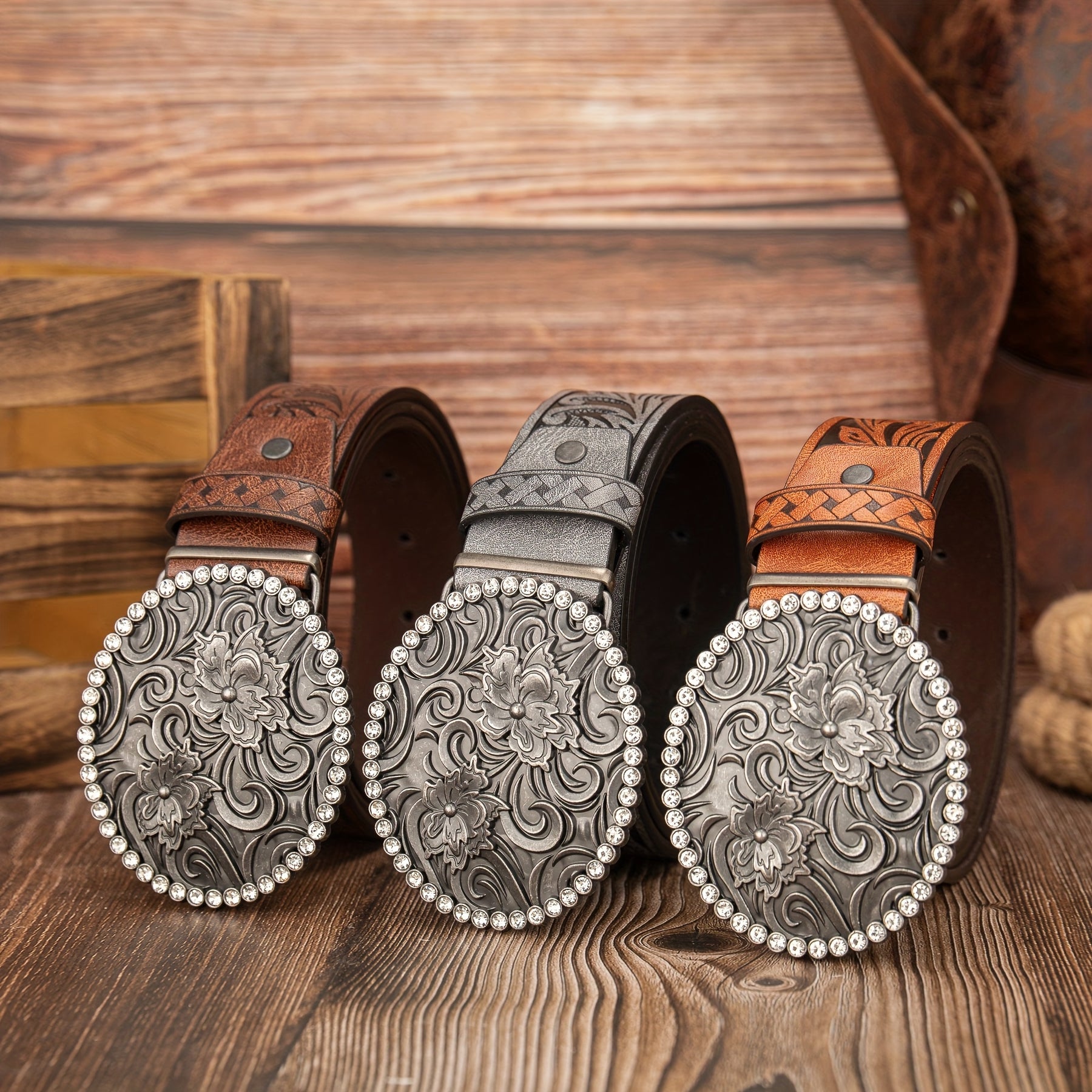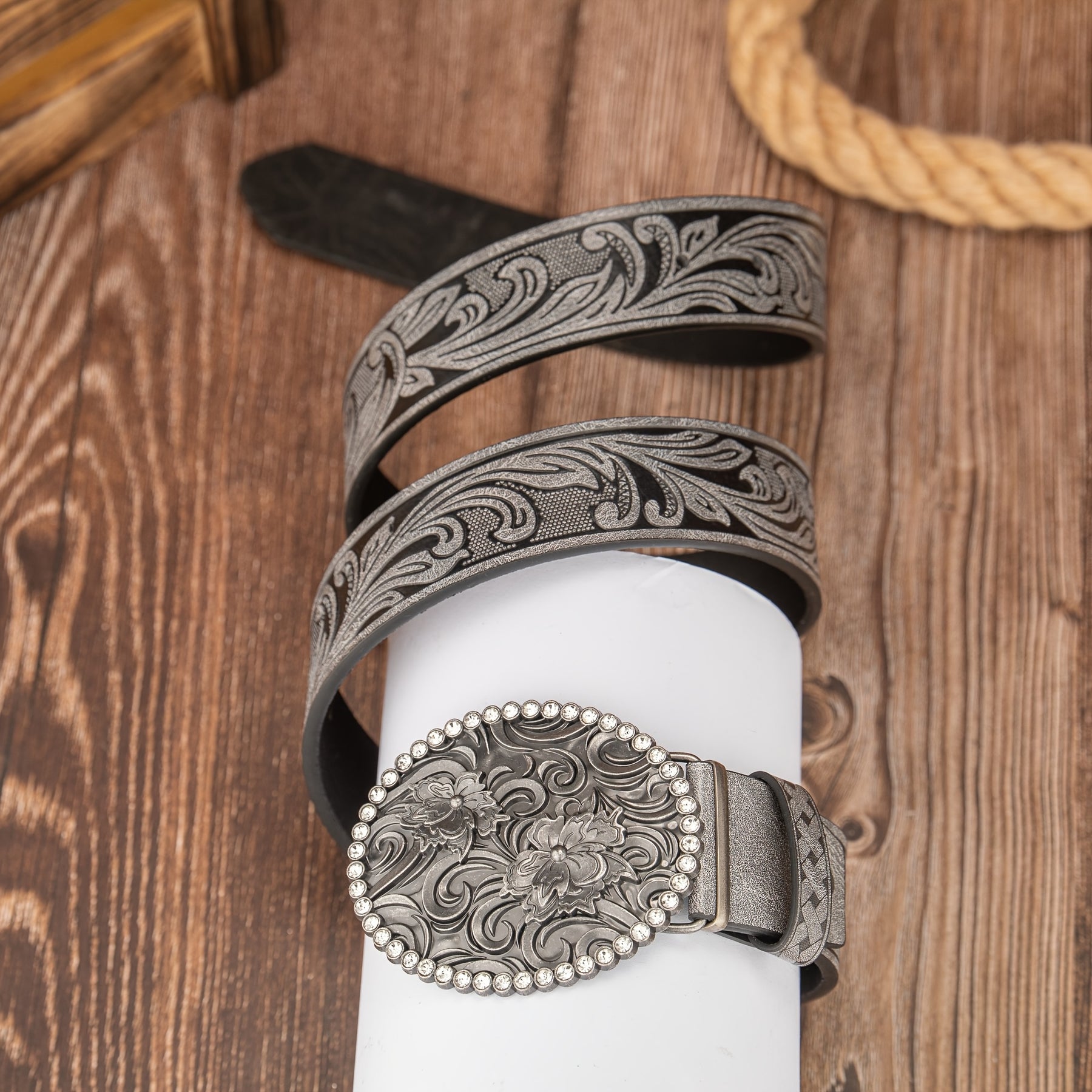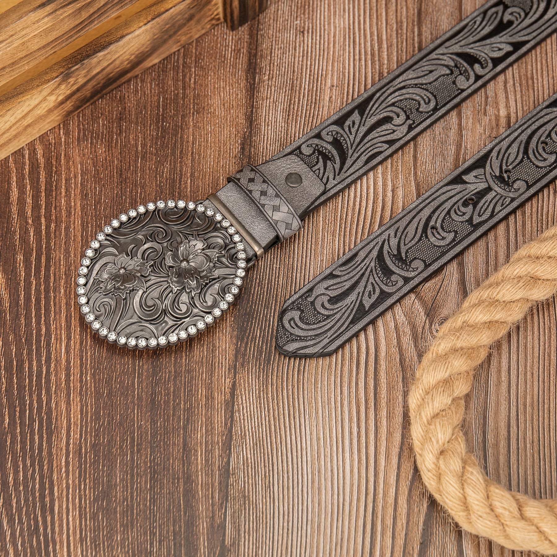 This belt features an oval lace full rhinestone three-dimensional carved buckle with an old phoenix tail pattern. Made of PU material, it is perfect for Thanksgiving.