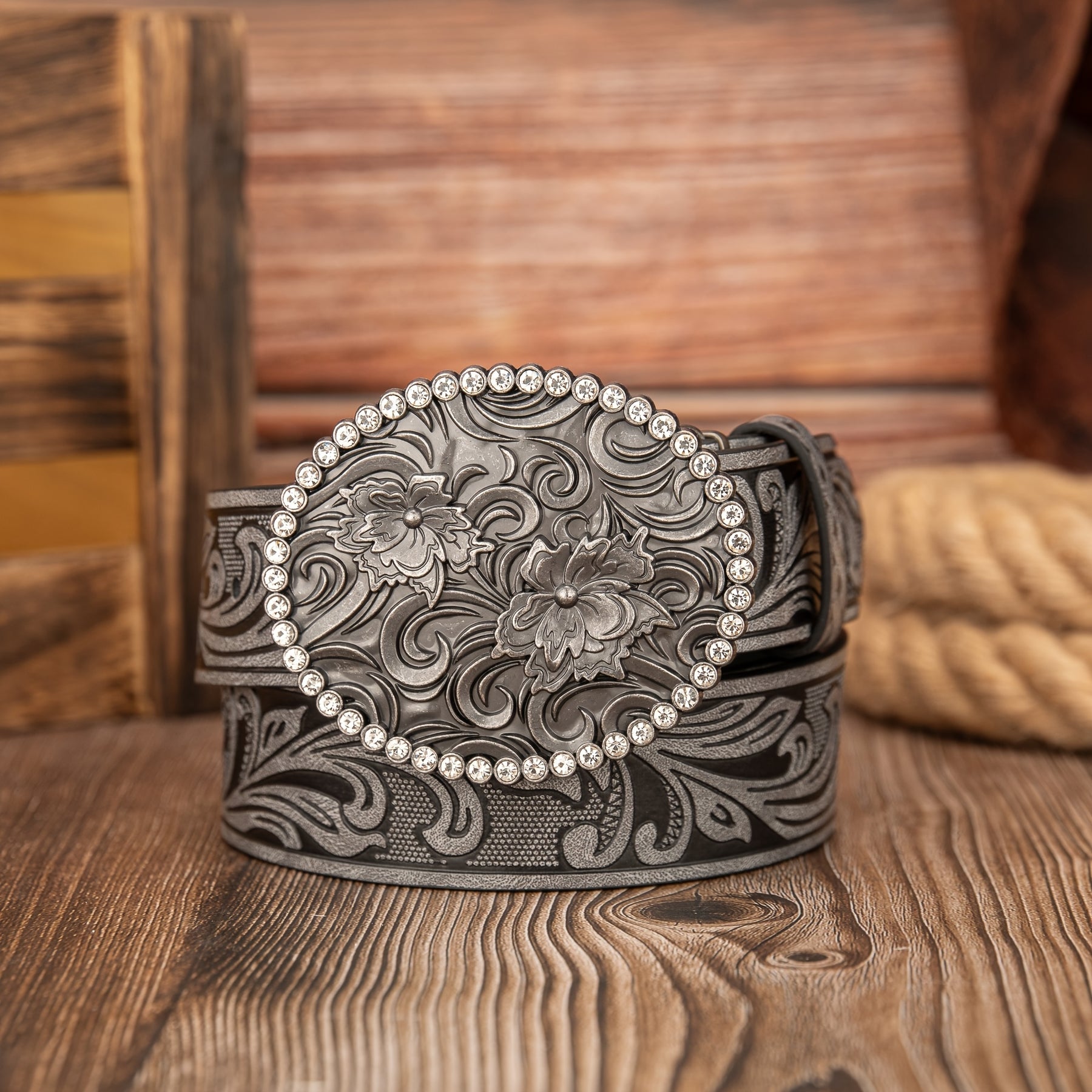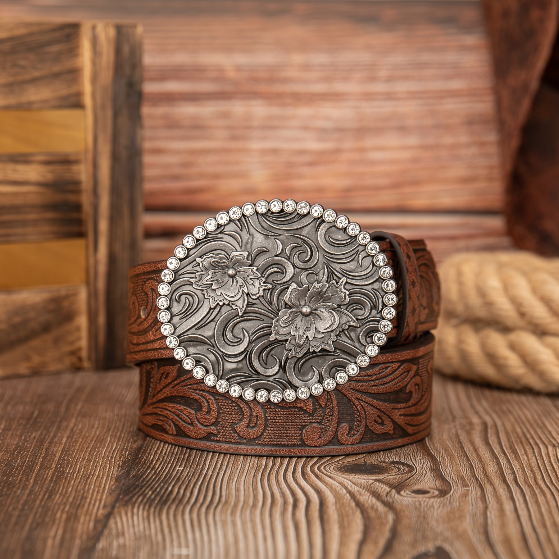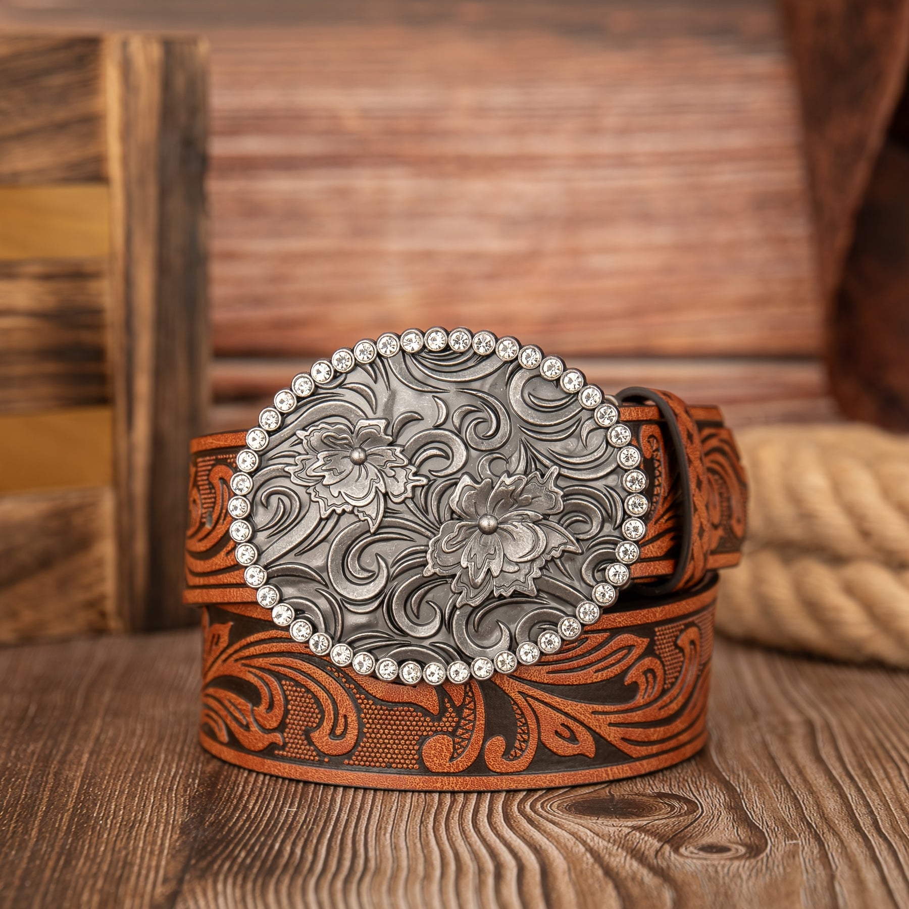 This belt features an oval lace full rhinestone three-dimensional carved buckle with an old phoenix tail pattern. Made of PU material, it is perfect for Thanksgiving.