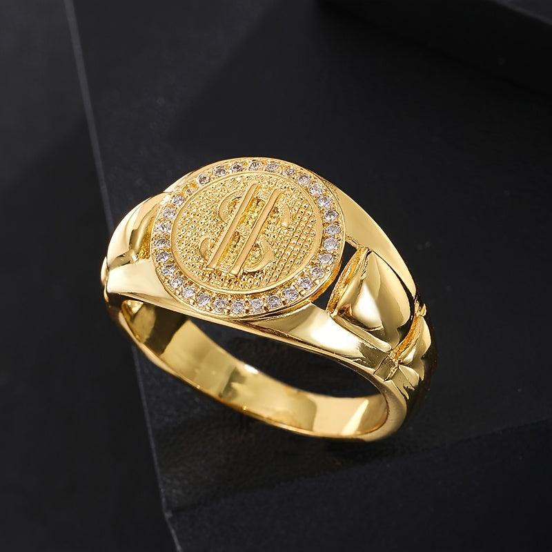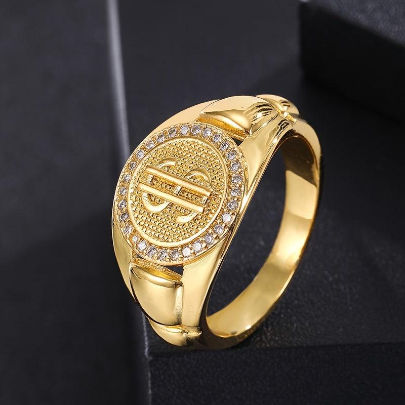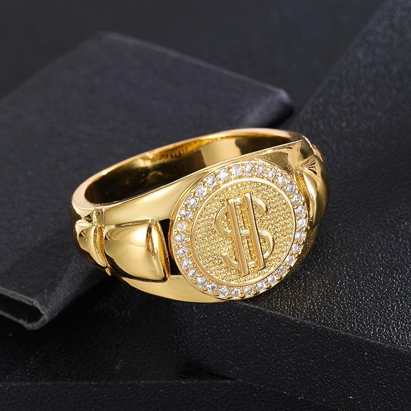 This stunning golden dollar sign ring features sparkling cubic zirconia stones set in high-quality copper. Perfect for both parties and casual attire, this ring is a great gift for both men and women.
